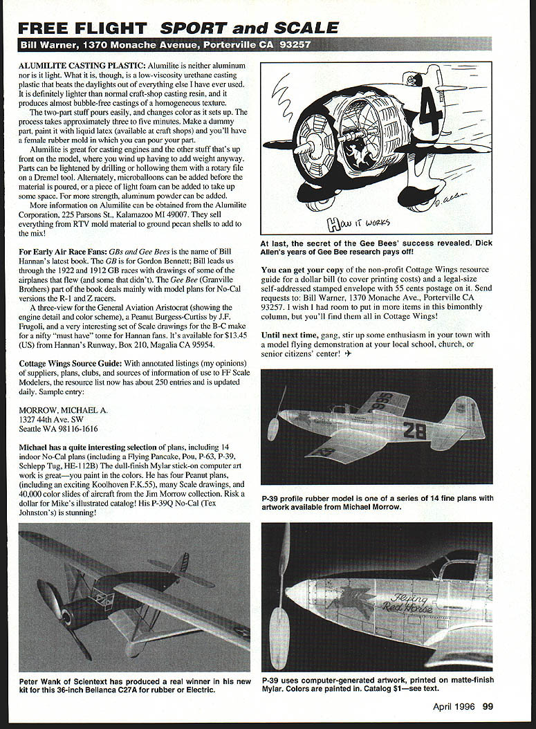 FREE FLIGHT SPORT SCALE U rI ALLJMILITE CASTING PLASTIC Alumilite neither aluminum nor light What though low-viscosity urethane casting plastic beats daylights out everything else have ever used definitely lighter normal craft-shop casting resin produces almost bubble-free castings homogeneous texture two-part stuff pours easily changes color sets up process takes approximately three five minutes Make dummy part paint liquid latex available craft shops youll have female rubber mold can pour part Alumilite great casting engines other stuff thats up front model wind up having add weight anyway Parts can lightened drilling hollowing rotary file Dremel tool Alternately microballoons can added before material poured piece light foam can added take up some space strength aluminum powder can added information Alumilite can obtained Alumilite Corporation 225 Parsons St Kalamazoo MI 49007 sell everything RTV mold material ground pecan shells add mix Early Air Race Fans GBs Gee Bees name Bill Hannans latest book GB Gordon Bennett Bill leads us through 1922 1912 GB races drawings some airplanes flew some didnt Gee Bee Granville Brothers part book deals mainly model plans No-Cal versions R- 1 Z racers three-view General Aviation Aristocrat showing engine detail color scheme Peanut Burgess-Curtiss JF Frugoli very interesting set Scale drawings B-C make nifty must have tome Hannan fans Its available $1345 US Hannans Runway Box 210 Magalia CA 95954 Cottage Wings Source Guide annotated listings opinions suppliers plans clubs sources information use FF Scale Modelers resource list now has about 250 entries updated daily Sample entry MORROW MICHAEL 1327 44th Ave SW Seattle WA 98116-1616 Michael has quite interesting selection plans including 14 indoor No-Cal plans including Flying Pancake Pou P-63 P-39 Schlepp Tug HE-l 12B dull-finish Mylar stick-on computer art work greatyou paint colors has four Peanut plans including exciting Koolhoven FK55 Scale drawings 40000 color slides aircraft Jim Morrow collection Risk dollar Mikes illustrated catalog P-39Q No-Cal Tex Johnstons stunning last secret Gee Bees success revealed Dick Allens years Gee Bee research pays oft can get copy non-profit Cottage Wings resource guide dollar bill cover printing costs legal-size self-addressed stamped envelope 55 cents postage Send requests Bill Warner 1370 Monache Ave Porterville CA 93257 wish room put items bimonthly column youll find Cottage Wings Until next time gang stir up some enthusiasm town model flying demonstration local school church senior citizens center l 1996 99 Q 39 profile rubber model series 14 fine plans artwork available Michael Morrow Peter Wank Scientext has produced real winner new kit 36-inch Bellanca C27A rubber Electric P-39 uses computer-generated artwork printed matte-finish Mylar Colors painted Catalog $1see text