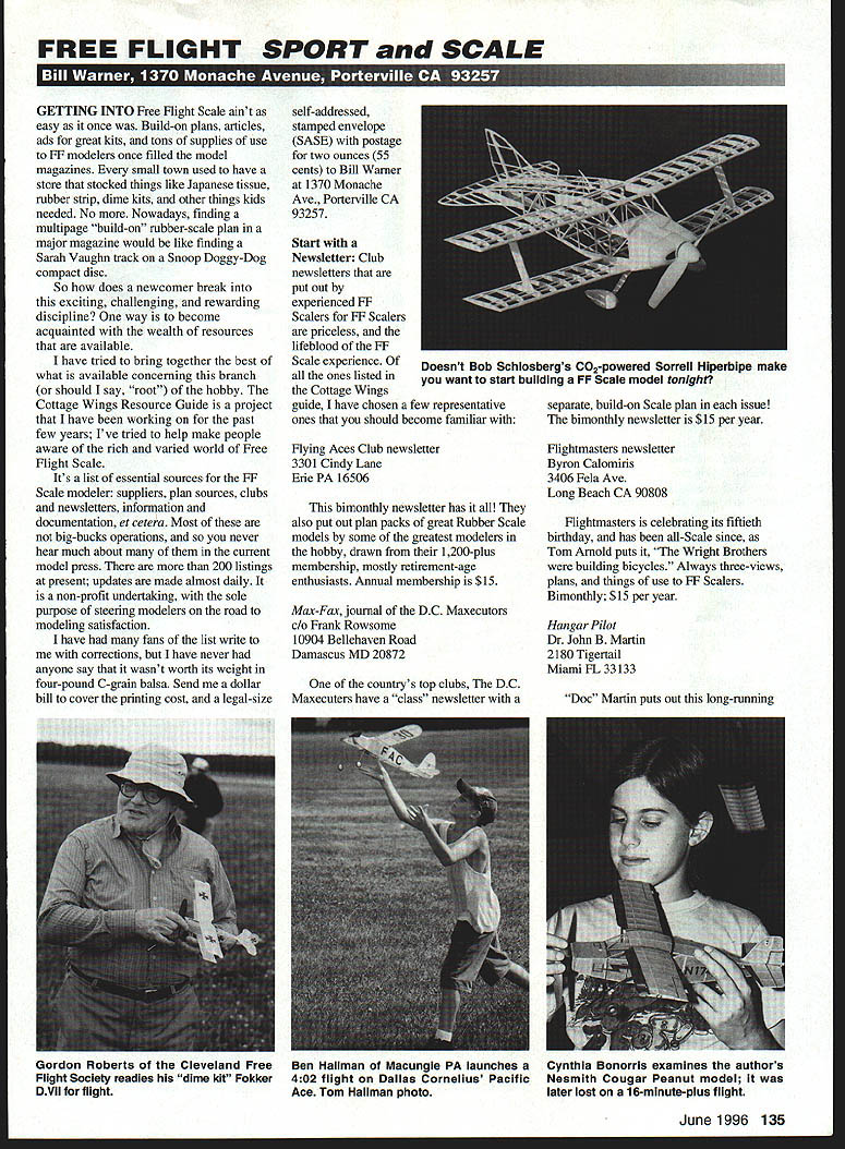 FREE FLIGHT SPORT SCALE GETTING INTO Free Right Scale aint easy once Build-on plans articles ads great kits tons supplies use FF modelers once filled model magazines small town used have store stocked things like Japanese tissue rubber strip dime kits other things kids needed No Nowadays finding multipage build-on rubber-scale plan major magazine would like finding Sarah Vaughn track Snoop Doggy-Dog compact disc So does newcomer break exciting challenging rewarding discipline way become acquainted wealth resources available have tried bring together best what available concerning branch should say root hobby Cottage Wings Resource Guide project have working past few years Ive tried help make people aware rich varied world Free Flight Scale Its list essential sources FF Scale modeler suppliers plan sources clubs newsletters information documentation et cetera Most big-bucks operations never hear much about current model press 200 listings present updates made almost daily non-profit undertaking sole purpose steering modelers road modeling satisfaction have fans list write corrections have never anyone say wasnt worth its weight four-pound C-grain balsa Send dollar bill cover printing cost legal-size self-addressed stamped envelope SASE postage two ounces 55 cents Bill Warner 1370 Monache Ave Porterville CA 93257 Start Newsletter Club newsletters put out experienced FF Scalers FF Scalers priceless lifeblood FF Scale experience ones listed Cottage Wings guide have chosen few representative ones should become familiar Flying Aces Club newsletter 3301 Cindy Lane Erie PA 16506 bimonthly newsletter has also put out plan packs great Rubber Scale models some greatest modelers hobby drawn 1200-plus membership mostly retirement-age enthusiasts Annual membership $15 Max-Fax journal DC Maxecutors Frank Rowsome 10904 Bellehaven Road Damascus MD 20872 countrys top clubs DC Maxecuters have class newsletter separate build-on Scale plan issue bimonthly newsletter $15 per year Flightmasters newsletter Byron Calomins 3406 Fela Ave Long Beach CA 90808 Flightmasters celebrating its fiftieth birthday has all-Scale since Tom Arnold puts Wright Brothers building bicycles Always three-views plans things use FF Scalers Bimonthly $15 per year Hangar Pilot Dr John B Martin 2180 Tigertail Miami FL 33133 Doc Martin puts out long-running Ben Hailman Macungie PA launches Cynthia Bonorris examines authors 402 flight Dallas Cornelius Pacific Nesmith Cougar Peanut model Ace Tom Hailman photo later lost 16-minute-plus flight June1996 135 Doesnt Bob Schlosbergs C02-powered Sorrell Hiperbipe make want start building FF Scale model tonight Gordon Roberts Cleveland Free Flight Society readies dime kit Fokker DVII flight newsletter lots character Indoor modelers MIAMA club international leader Indoor scene Subscriptions $1250 per year get kits materials Aerodyne 1924 Edinger Santa Ana CA 92705 Tel 714 258-0805 Al Heinrich carries good colored nitrate covers white also has other colors plus butyrate dopes Diesel glow fuel silk electrics CO2s lots old-time rubber gas kits books plans Send $2 large SASE catalog Al recently bought out Old Timer Model Supply formerly owned late great Ken Sykora Sams Chapel Sandon Herts 5G9 OQJ England George Wallbridges incredible mailorder house England 58-page catalog lots pictures drawings inspiration free except need send US five-dollar bill no checks stamps cover postage has over 1600 goodies stock including about everything thats available US plus plenty stuff thats Pay orders Visa MasterCard work internationally Peck-Polymers Box 710399 Santee CA 92072 Tel 619448-1818 Fax 619448-1833 Model-for-model Peck has history winners other manufacturer know Sandys line really great kits supplies engines motors small RC equipment books plans second-tonone beginning modeler carries full line CO2 electric stuff too including Gasparmn Czech Brown CO2 engines extensive fascinating catalog $4 Hobby Supply South 5060 Glade Road Acworth GA 30101 Tel 404 974-0843 Denny Atkins Ray Abadie stock lots useful stuff like Trexler wheels Japanese silk Peck products Golden Age Veron KeilKraft Mercury kits dopes tissues Jet-X super catalog lots pictures drawings sells $4less cost produce catalog also Internet installments http/ ourworldcompuservecomlhomepageslhss Few Plans Sources inexpensive way explore aircraft interested build plans rather kits Most really nifty models arent available kit form though may have once few Cottage sources include AA Lidberg Model Plan Service 1008 E Baseline Road Suite 1074 Tempe AZ 85283 Tel 602 730-9180 Al Lidberg has large range fine plans range small Profile Scale models advanced built-up rubber-powered Scale airplanes knock-off wings detailed instructions well laid out print Send $150 16 pages listings Allen Hunt Plan Service Box 726 Dunbar WV 25064-0726 Allen has 2000 plans catalog illustrated line drawings can see what look like old-time model plans have redone rib former outlines both wingsa nice feature considering originally done Some have three-view Scale drawings catalog $4 refundable order Bag Peanuts Doug Mooney Box 231192 San Diego CA 92194 Packs plans Peanut Scale 13-inch maximum span models legendary Walt Mooney six different sets bags plans Sets 1-5 have approximately 13 plans $6 postage paid per set Thats almost 50 cents Set 6 has 36 plans reduced 8inch span Pistachio Scale John Pond Plans Service Box 90310 San Jose CA 95 109-3310 John Pond has what probably largest selection plans world has four different catalogs Gas-Powered Free Right Rubber Towline Scale Models A-K Scale Models L-Z catalogs $2 Special Resources Hannans Runway Box 210 Magalia CA 95954 Bill few suppliers fan club noted columnist Model Builder magazine respected designer author number books aero history small-scale rubber models charming wife Joan pronounced Joanne 136 Model Aviation cale suppliers like Al Lidberg have excellent products cant afford expensive advertising See text details Don Munns jumbo 