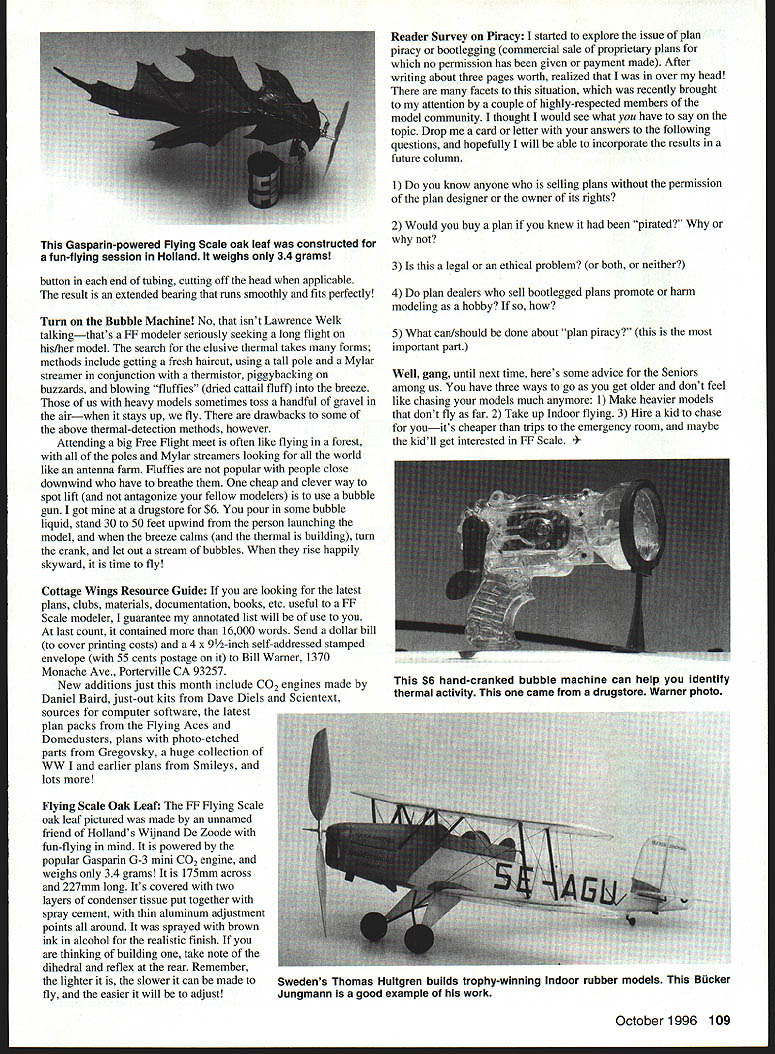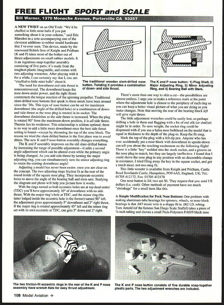 FREE FLIGHT SPORT SCALE NEW TWIST Old Trick Wed chuffed little mint balls put something about column said Eric Marsden note accompanying cleverest additions rubber model hardware Ive ever seen device made renowned British firm Knight Pridham K P takes bother out thrust adjustments small rubber models ingenious snap-together assembly consisting five parts its made toughest plastic imaginable comes two adjusting wrenches After playing can certainly say too am chuffed little mint balls about need downthrust side thrust noncontroversial downthrust keeps nose down under power right thrust counteracts torque reaction spinning propeller Traditional slant-drilled nose buttons speak needs have around since 30s type nose button can set maximum downthrust angle drilled hole combination downand side thrust nose plug rotated its socket downthrust diminishes side thrust increased plug rotated 900 maximum-down position side thrust Therein lies its weakness relationship seldom optimal no way add little downthrust once best side thrust setting foundexcept shimming top nose block reason tried slant-drilled button first place avoid shims new K P nose-button assembly changes everything K P assembly improves old slant-drilled button increasing range possible adjustmentit adds second angle adjustment can altered primary angle being changed As add side thrust turning major adjusting ring can simultaneously turn minor adjusting ring retain starting downthrust angle Adjusting model has never easier once clear concept two adjusting rings friction fit rear round inside square nose plug incorporate eccentric holes move angle bearing ball stem unit Studying diagram photo will help picture works rings turned both eccentric holes top dead center TDC youll have approximately 100 downthrust no side thrust major rings hole TDC minor ring latter lodged inside eccentric hole former turned 900 left adjustment gives approximately 50 downthrust 20 right thrust major ring rotated approximately 450 left minor ring set its own eccentric TDC gets 50 down 20 right K P nose button 1 Plug Shell 2 Major Adjusting Ring 3 Minor Adjusting Ring 4 Bearing Ball Stem Theres way skin catthe possibilities almost endless urge make reference mark point adjustment hole closest periphery ring can keep better visual picture what doing make changes Note moving rear bearing block left will give right thrust little adjustment wrenches could easily lost perhaps drilling hole flagging bit red silk similar might order save weight socket ring could dispensed use balsa nose bulkhead model equal thickness depth plug-in Keep fit snug Mark top plug felt-tip pen Anyone has ever accidentally put nose block downthrust upside-down can tell about resulting excitement following flight little key molded stock socket groove nose plug match largely ineffective found could shove nose plug position no discernible change resistance tried filing away key square socket got much nicer not-too-snug fit little wonder available Knight Pridham Castle Road Rowlands Castle Hampshire P09 6AS England UK Tel 01705 412172 Fax 01705 412178 nose button $4 two $6 request send US dollars ie cash Other methods payment have too much shrinkage small item like Simple Modification Peck Nose Buttons problem making aluminum-tube bearings spinners wheels nose-block bearings 047 music wire sloppy fit 062 ID tubing Tom Arnold famous San Diego Scale Staffel takes piece /8-inch tubing shoves small Peck-Polymers PAO19 black nose 108 Model Aviation 12 traditional wooden slant-drilled nose button Twisting provides combination down- side thrust two friction-fit eccentric rings rear K P nose K P nose button consists five durable snap-together assembly have wrench flats easy thrust adjustment plastic pafls two adjustment wrenches included button end tubing cutting off head applicable result extended bearing runs smoothly fits perfectly Turn Bubble Machine No isnt Lawrence Welk talkingthats FF modeler seriously seeking long flight his/her model search elusive thermal takes forms methods include getting fresh haircut using tall pole Mylar streamer conjunction thermistor piggybacking buzzards blowing fluffies dried cattail fluff breeze us heavy models sometimes toss handful gravel airwhen stays up fly drawbacks some above thermal-detection methods however Attending big Free Flight meet often like flying forest poles Mylar streamers looking world like antenna farm Fluffies popular people close downwind have breathe cheap clever way spot lift antagonize fellow modelers use bubble gun got drugstore $6 pour some bubble liquid stand 30 50 feet upwind person launching model breeze calms thermal building turn crank let out stream bubbles rise happily skyward time fly Cottage Wings Resource Guide looking latest plans clubs materials documentation books etc useful FF Scale modeler guarantee annotated list will use last count contained 16000 words Send dollar bill cover printing costs 4 x 9/2-inch self-addressed stamped envelope 55 cents postage Bill Warner 1370 Monache Ave Porterville CA 93257 New additions just month include CO2 engines made Daniel Baird just-out kits Dave Diels Scientext sources computer software latest plan packs Flying Aces Domedusters plans photo-etched parts Gregovsky huge collection WW earlier plans Smileys lots Flying Scale Oak Leaf EF Flying Scale oak leaf pictured made unnamed friend Hollands Wijnand De Zoode fun-flying mind powered popular Gasparin G-3 mini CO2 engine weighs 34 grams 175mm across 227mm long Its covered two layers condenser tissue put together spray cement thin aluminum adjustment points around sprayed brown ink alcohol realistic finish thinking building take note dihedral reflex rear Remember lighter slower can made fly easier will adjust Reader Survey Piracy started explore issue plan piracy bootlegging commercial sale proprietary plans no permission has given payment made After writing about three pages worth realized over head facets situation recently brought attentio