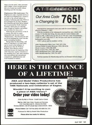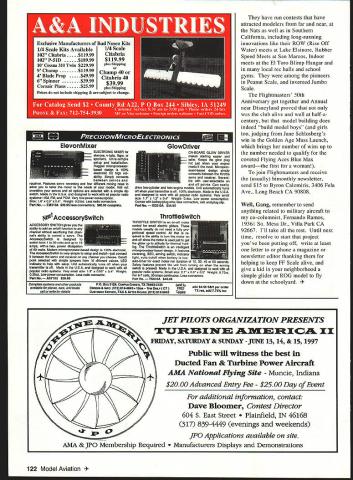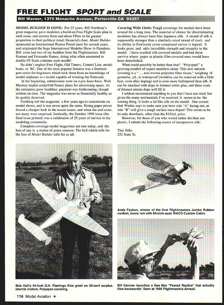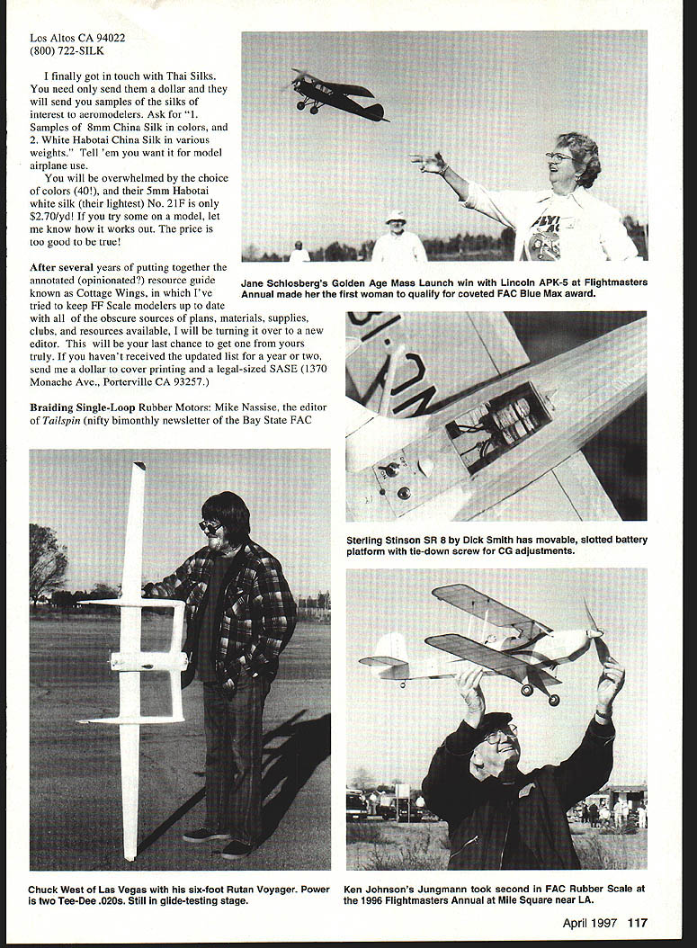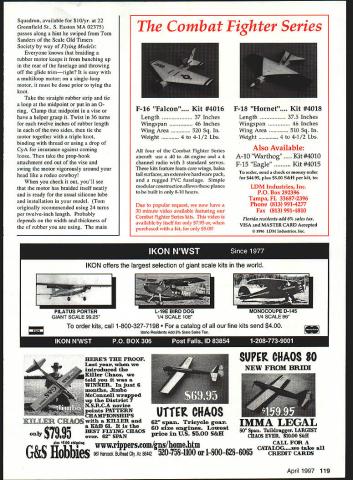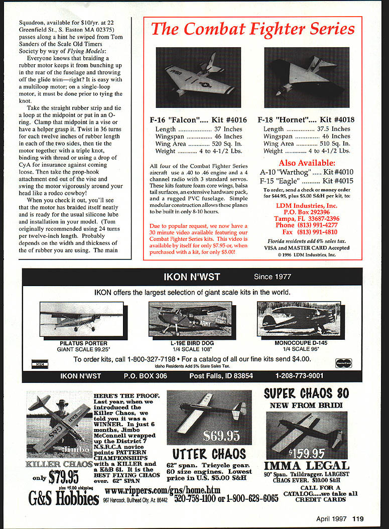 FREE FLIGHT SPORT SCALE MODEL BUILDER IS GONE 25 years Bill Northrops great magazine gave modelers build-on Free Flight Scale plan issue articles about FFers far greater proportion political read financial clout Model Builder sponsored International Peanut Postal meet several years originated huge International Modeler Show Pasadena Bill two buddies Flightmasters Bill Hannan Fernando Ramos doing what often amounted double FF Scale columns month didnt neglect Free Flight Old Timers Control Line model boats RC popular features fourteenpart series beginners took no knowledge model airplanes model capable winning Nationals beginning submissions apro bono basis Walt Mooney traded centerfold Peanut plans advertising space As enterprise grew healthier payment forthcoming though seldom time magazine never financially healthy its quality deserved Northrop left magazine few years ago concentrate model shows never quite same Rising paper prices forced cheaper look recent issues end came surprised Ironically October 1996 issue final issue printed celebration 25 years service modeling community Complete-coverage model magazines rare today loss matter grave concern bell tolls loss Model Builder tolls us Covering Cloth Tough coverings models have around long time material choice discriminating modelers has always fine Japanese silk strand silk supposedly stronger similarly-sized strand steel its ability flawlessly cover compound curves legend looks great adds incredible strength integrity model have crashed silk-covered models survive paper plastic-film-covered ones would have demolished What could possibly better Polyspan growing number expert modelers shout new miracle covering . non-woven polyester fiber tissue weighing 16 grams/sq yd waterproof wrinkles can removed little heat after doping bulletproof silk can attached dope thinned white glue three coats thinned nitrate dope will fill seldom recommend anything have tried given testimonials Ive received seems coming thing looks lot like silk model caveat Bob Wieble says make sure have side facing out side B will give rough surface once doped seems its drawback other $15/yd price However would rather die use plastic submit following source inexpensive silk Thai Silks 252 State St Bob Halls 44-inch DH Flamingo flies great 30-cent surplusBill Hannan launches Gee Bee Peanut Replica actually electric motors Polyspan coveringflies backwards Seen 1996 Flightmasters Annual 116 Model Aviation Faykun winner first Flightmasters Jumbo Rubber contest wows em 50-inch-span WACO Custom Cabin Los Altos CA 94022 800 722-SILK finally got touch Thai Silks need send dollar will send samples silks interest aeromodelers Ask 1 Samples 8mm China Silk colors 2 White Habotai China Silk various weights Tell em want model airplane use will overwhelmed choice colors 40 5mm Habotai white silk lightest No 21F $270/yd try some model let know works out price too good true After several years putting together annotated opinionated resource guide known Cottage Wings Ive tried keep FF Scale modelers up date obscure sources plans materials supplies clubs resources available will turning over new editor will last chance get yours truly havent received updated list year two send dollar cover printing legal-sized SASE 1370 Monache Ave Porterville CA 93257 Braiding Single-Loop Rubber Motors Mike Nassise editor Tailspin nifty bimonthly newsletter Bay State FAC Chuck West Las Vegas six-foot Rutan Voyager Power Ken Johnsons Jungmann took second FAC Rubber Scale two Tee-Dee 020s Still glide-testing stage 1996 Flightmasters Annual Mile Square near LA April1997 117 Jane Schlosbergs Golden Age Mass Launch win Lincoln APK-5 Flightmasters Annual made first woman qualify coveted FAC Blue Max award Sterling Stinson SR 8 Dick Smith has movable slotted battery platform tie-down screw CG adjustments Squadron available $10/yr 22 Greenfield St S Easton MA 02375 passes along hint swiped Tom Sanders Scale Old Timers Society way Flying Models Everyone knows braiding rubber motor keeps bunching up rear fuselage throwing off glide trimright easy multiloop motor single-loop motor must done prior tying knot Take straight rubber strip tie loop midpoint put 0ring Clamp midpoint vise have helper grasp Twist 36 turns twelve inches rubber length two sides tie motor together triple knot binding thread using drop CyA insurance against coming loose take prop-hook attachment end out vise swing motor vigorously around head like rodeo cowboy check out youll see motor has braided itself neatly ready usual silicone lube installation model Tom originally recommended using 24 turns per twelve-inch length Probably depends width thickness rubber using main Combat Fighter Series F-16 Falcon.. Kit #4016 Length37 Inches Wingspan46 Inches Wing Area520 Sq Weight4 4-1/2 Lbs four Combat Fighter Series aircraft use 40 46 engine 4 channel radio 3 standard servos kits feature foam core wings balsa tail surfaces extensive hardware pack rugged PVC fuselage Simple modular construction allows planes built 8-10 hours Due popular request now have 30 minute video available featuring Combat Fighter Series kits video available itself $795 purchased kit $500 F-iS Hornet.. Kit #4018 Length375 Inches Wingspan46 Inches Wing Area510 Sq Weight4 4-1/2 Lbs Also Available A-10 WarthogKit #4010 F-iS EagleKit #4015 order send check money order $4495 plus $500 S&H per kit LDM Industries Inc PO Box 292396 Tampa FL 33687-2396 Phone 813 991-4277 Fax 813 991-4810 Florida residents add 6% sales tax VISA and MASTER CARD Accepted 1996 LDM Industries Inc HERES THE PROOFSUPK CHAOS SO Last year introduced W FROM BRIDI Killer Chaos told WINNER just 6 months Jimbo McConnell wrapped up District 7 NSRCA novice points PATTERN vi K CHAOS CHAMPIONSHIPS cUA KILLER and62 span Tricycle gear LELiAL K&B 61 size engines Lowest BEST FLYING CHAOS aCHAOS EVER S1WO S&H $7995ever SPAN price US $500 S&HSO- lrnn 1iIdragger LARGEST pin irpinnopcpnm/enc/hrnwwhfmCALL FOR CATALOG take G&S Hobb