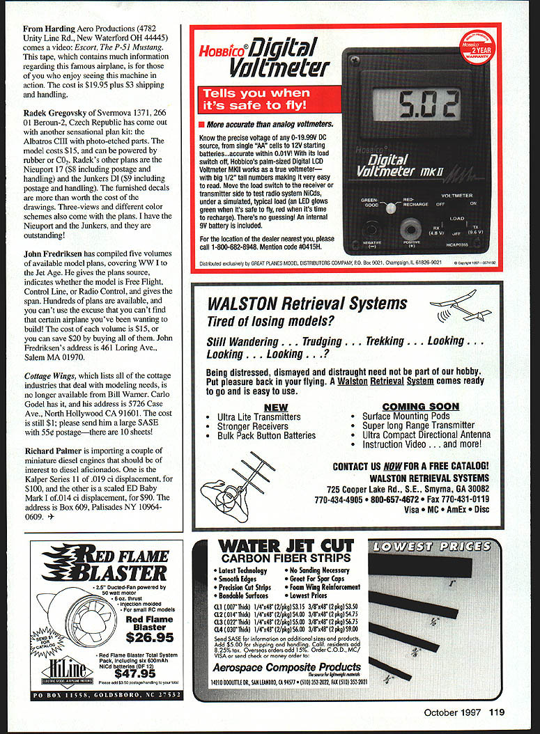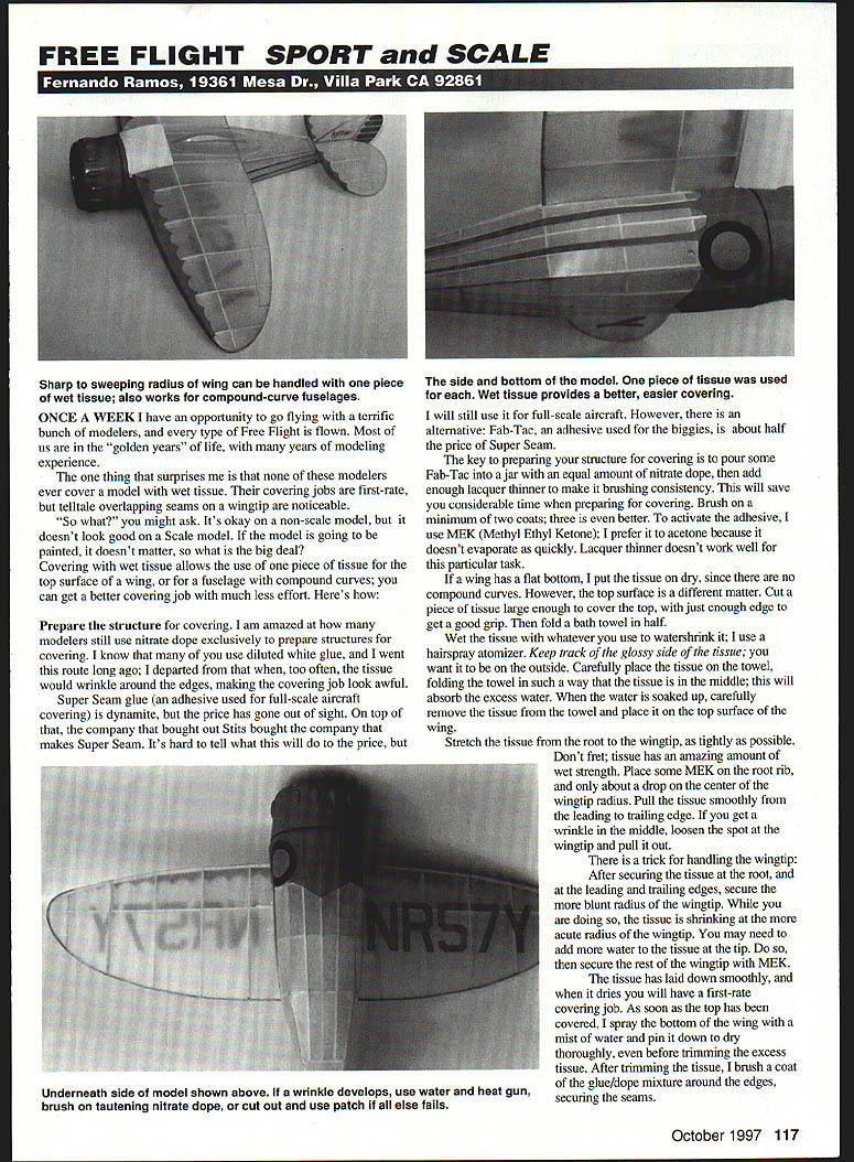 FREE FLIGHT SPORT SCALE Sharp sweeping radius wing can handled piece wet tissue also works compound-curve fuselages ONCE WEEK have opportunity go flying terrific bunch modelers type Free Flight flown Most us golden years life years modeling experience thing surprises modelers ever cover model wet tissue covering jobs first-rate telltale overlapping seams wingtip noticeable So what might ask Its okay non-scale model doesnt look good Scale model model going painted doesnt matter what big deal Covering wet tissue allows use piece tissue top surface wing fuselage compound curves can get better covering job much less effort Heres Prepare structure covering am amazed modelers still use nitrate dope exclusively prepare structures covering know use diluted white glue went route long ago departed too often tissue would wrinkle around edges making covering job look awful Super Seam glue adhesive used full-scale aircraft covering dynamite price has gone out sight top company bought out Stits bought company makes Super Seam Its hard tell what will price will still use full-scale aircraft However alternative Fab-Tac adhesive used biggies about half price Super Seam key preparing structure covering pour some Fab-Tac jar equal amount nitrate dope add enough lacquer thinner make brushing consistency will save considerable time preparing covering Brush minimum two coats three better activate adhesive use MEK Methyl Ethyl Ketone prefer acetone because doesnt evaporate quickly Lacquer thinner doesnt work well particular task wing has flat bottom put tissue dry since no compound curves However top surface different matter Cut piece tissue large enough cover top just enough edge get good grip fold bath towel half Wet tissue whatever use watershrink use hairspray atomizer Keep track glossy side tissue want outside Carefully place tissue towel folding towel such way tissue middle will absorb excess water water soaked up carefully remove tissue towel place top surface wing Stretch tissue root wingtip tightly possible Dont fret tissue has amazing amount wet strength Place some MIEK root rib about drop center wingtip radius Pull tissue smoothly leading trailing edge get wrinlde middle loosen spot wingtip pull out trick handling wingtip After securing tissue root leading trailing edges secure blunt radius wingtip doing tissue shrinldng acute radius wingtip may need add water tissue tip secure rest wingtip MEK tissue has laid down smoothly dries will have first-rate covering job As soon top has covered spray bottom wing mist water pin down dry thoroughly before trimming excess tissue After trimming tissue brush coat glue/dope mixture around edges securing seams October1997 117 side bottom model piece tissue used Wet tissue provides better easier covering Underneath side model shown above wrinkle develops use water heat gun brush tautening nitrate dope cut out use patch else fails fuselage handled same way wing Start bottom two sides followed top want seams point downward speak Sometimes am hurty know never happens Im too lazy get towel alternative preparing tissue wet covering After cutting tissue correct size hold up dull side facing spray mist water careful let tissue fold over itself because youll wont able straighten out easily After spraying t carefully place tissue structure proceed previously mentioned advantage water dull side provides good adhesion tissue placed structure takes water soak through other side allowing plenty working time What about tail believe way cover flat surface Typically tail Rubber Scale models built flat airfoil shape Keeping flat surfaces warping quite trick following will seldom have tail warp didnt say neveryou know Murphy have made different-size hardwood frames bit larger tail covered glue tissue upside down onto frames means dull side up spray tissue water leave dry tail structure has given same three coats glue/dope mixture After tissue has dried tail glued down onto dull side am confident structure has enough drying time cut tail away frame trim accordingly other side treated same way hurry leave second side frame long possible will almost notice disclaimer ensure tail will flat forever have some tails built years ago 1/16 square still flat often spray tissue frame nitrate dope before gluing tail onto tissue helps keep structure flat pinning down after doping necessary wrinkle does show up after tissue has dried several solutions first easiest moisten wtinlde water carefully apply heat heat gun may have several times time its required wnnlde persists brush coat tautenaig nitrate dope directly onto wrinkle Several coats may necessary have let dry thoroughly between coats will required wriulde still looking eye cut out put small patch However have done everything mentioned wont need patching Earlier mentioned tautening nitrate dope have some information may aware Tautening nitrate dope used full-scale aircraft covered cotton linen usually case antiques because cotton linen cannot shrunk heat used before days DacronTM Having quart dope hand useful because puffing bottom wings keep giving elliptical dihedral can purchased sources sell aircraft supplies such local airport Bear model handywork Peter Smart has deservedly received much publicity British model magazines Its made foam blue has cockpit detail spans 34 inches weighs scant 50 grams motor wound 1000 turns flies good looks type modeling has really taken hold England has become very popular Indoor flying Ill discuss later 118 Model Aviation Peter Smarts outstanding-flying Indoor model made Radek Gregoyskys beautiful Albatros C-ill powered blue foam weighs 50 grams spans 34 inches Gasparin CO2 engine Photo-etched parts come drawings photo DH-2 C02-powered model aircraft built -inch Cleveland plans Miniature engines imported Richard Palmer Kalper ED easy-starting terrific-running models Harding Aero Productions 4782 Unity Line Rd New Waterford OH 44445 comes video Escort P-Si Mustang tape contains much information regarding fa