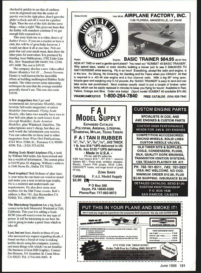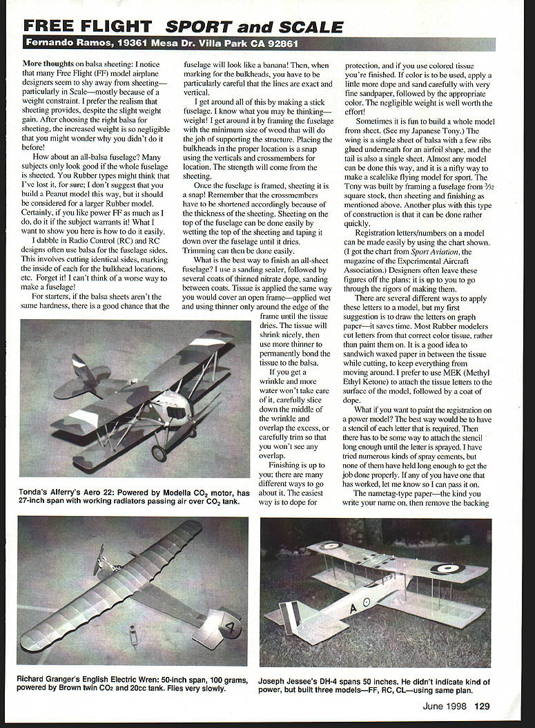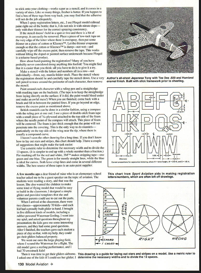 FREE FLIGHT SPORT SCALE U thoughts balsa sheeting notice Free Flight FF model airplane designers seem shy away sheeting particularly Scalemostly because weight constraint prefer realism sheeting provides despite slight weight gain After choosing right balsa sheeting increased weight negligible might wonder didnt before about all-balsa fuselage suhjects look good whole fuselage sheeted Rubber types might think Ive lost sure dont suggest build Peanut model way should considered larger Rubber model Certainly like power FF much do subject warrants What want show easily dabble Radio Control RC RC designs often use balsa fuselage sides involves cutting identical sides marking inside bulkhead locations etc Forget cant think worse way make fuselage starters balsa sheets arent same hardness good chance fuselage will look like banana marking bulkheads have particularly careful lines exact vertical get around making stick fuselage know what may thinkingweight get around framing fuselage minimum size wood will job supporting structure Placing bulkheads proper location snap using verticals crossmembers location strength will come sheeting Once fuselage framed sheeting snap Remember crossmembers have shortened accordingly because thickness sheeting Sheeting top fuselage can done easily wetting top sheeting taping down over fuselage until dries Trimming can done easily What best way finish all-sheet fuselage use sanding sealer followed several coats thinned nitrate dope sanding between coats Tissue applied same way would cover open frameapplied wet using thinner around edge frame until tissue dries tissue will shrink nicely use thinner permanently bond tissue balsa get wrinlde water wont take care carefully slice down middle wrinkle overlap excess carefully trim wont see overlap Finishing up different ways go about easiest way dope protection use colored tissue youre finished color used apply little dope sand carefully very fine sandpaper followed appropriate color negligible weight well worth effort Sometimes fun build whole model sheet See Japanese Tony wing single sheet balsa few ribs glued underneath airfoil shape tail also single sheet Almost model can done way nifty way make scalelike flying model sport Tony built framing fuselage /32 square stock sheeting finishing mentioned above Another plus type construction can done rather quickly Registration letters/numbers model can made easily using chart shown got chart Sport Aviation magazine Experimental Aircraft Association Designers often leave figures off plans up go through rigors making several different ways apply letters model first suggestion draw letters graph paperit saves time Most Rubber modelers cut letters correct color tissue rather paint good idea sandwich waxed paper between tissue cutting keep everything moving around prefer use MEK Methyl Ethyl Ketone attach tissue letters surface model followed coat dope What want paint registration power model best way would have stencil letter required has some way attach stencil long enough until letter sprayed have tried numerous kinds spray cements have held long enough get job done properly have has worked let know can pass nametag-type paperthe kind write name remove backing June1998 129 Tondas Alferrys Aero 22 Powered Modella CO2 motor has 27-inch span working radiators passing air over CO2 tank Richard Grangers English Electric Wren 50-inch span 100 grams Joseph Jessees DH-4 spans 50 inches didnt indicate kind powered Brown twin 002 20cc tank Flies very slowly power built three modelsFF RC CLusing same plan stick onto clothingworks super stencil comes variety sizes Like things fresher better happen find box tags way back may find adhesive will job adequately spray registration letters etc use Floquil model railroad paint right out bottle mix nitrate dope thinner correct spraying consistency stencil doesnt hold spot two bit overspray can easily removed Place piece low-tack tape very edge letter overspray put some thinner piece cotton KleenexTM Let thinner evaporate enough cotton KleenexTM dampnot wetand carefully wipe off excess paint remove tape works lifting doped painted surface underneath because Floquil toluene-based product about hand-painting registration have probably never considered doing anything foolish might find easier think have to give try Make stencil letters numbers rownot individuallyfrom say manila folder stock Place stencil registration should carefully tape stencil down Use very soft pencil trace around perimeter character remove stencil Paint around character ruling pen straightedge masking tape backside tape keep straightedge laying directly surface did paint would bleed under make awful mess finished come back brush fill between painted lines go beyond edge remove excess paint mentioned above British roundels can done similar fashion using compass ruling pen end use piece double-stick foam tape small piece /64 plywood attached top side foam needle point compass will attach piece foam will centered foam just thick enough point will penetrate covering way roundels particularly top side wing near tip usually compound curve havent seen other drawing long time dont know lay out stars stripes chart should help have couple suggestions might make task easier Use metric ruler determine necessary width divide 13 spaces simpler end up whole number fraction masking off red white 3MTM makes stripping tapeone green blue green mostly straight lines blue ideal curves Both leave crisp lines come several different widths best source tapes auto paint supplier few months ago dear friend elementary school teacher asked guest speaker topic aviation students reading story lesson also wanted children make some kind flying model would easy build classroom designed simple glider provided templates volunteer parents could use cut out parts arrived classroom two classesapproximately 70 kidsand kid proudly built glider hand brought five different kinds models including rubber-powered Waterman G
