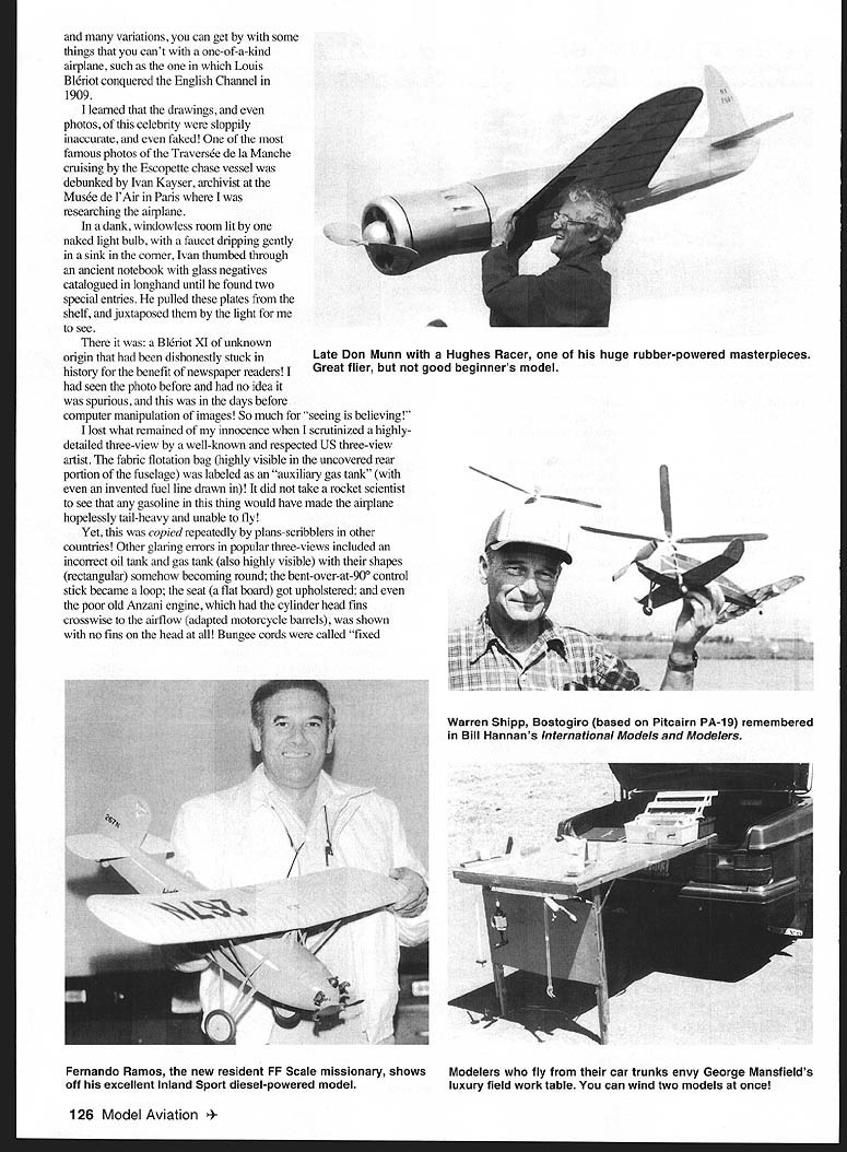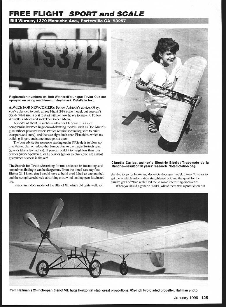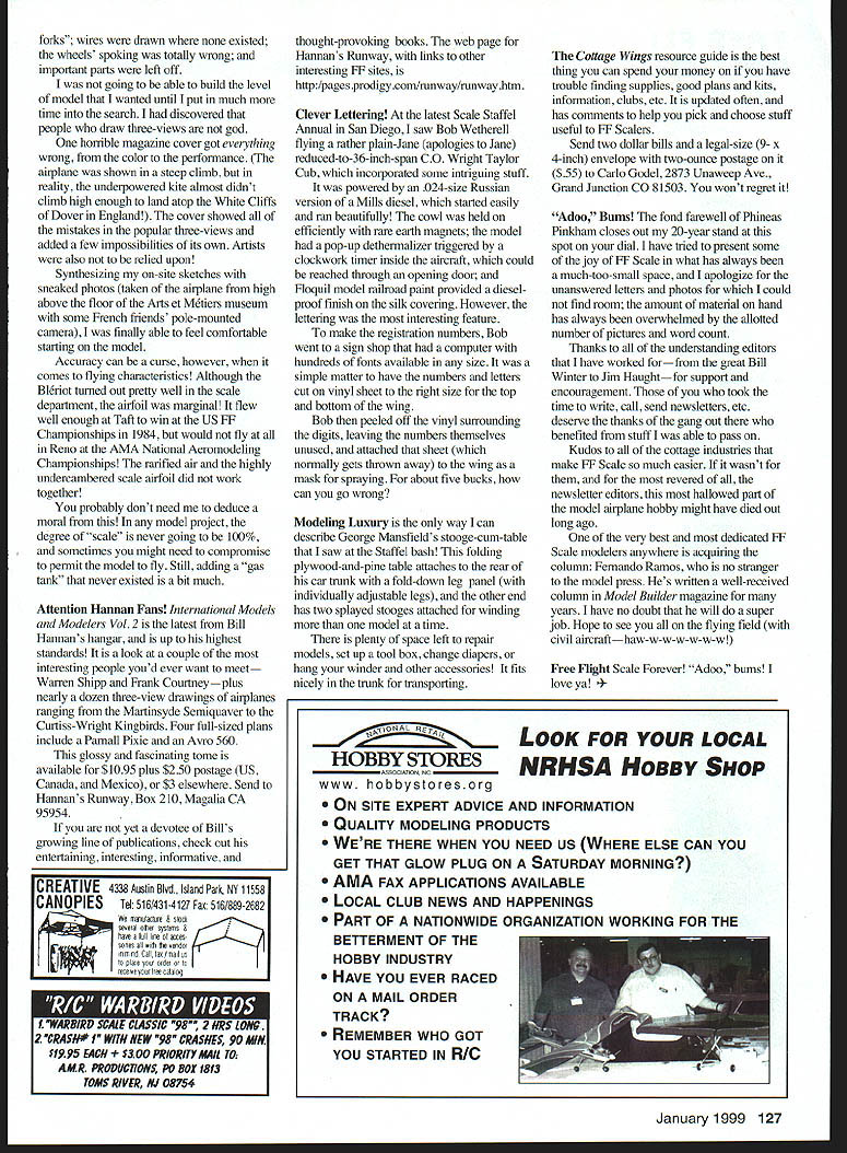 FREE FLIGHT SPORT SCALE ADVICE FOR NEWCOMERS Follow Aristotles advice Okay youve decided build Free Flight FF Scale model cant decide what size best start heavy make Follow Aristotles advice seek Golden Mean model about 36 inches ideal FF Scale Its nice compromise between huge crowd-drawing models such Don Munns giant rubber-powered racers require special logistics build transport store wee eight-inch-span Pistachios tax building fingers sometimes get sat upon best advice someone starting out FF Scale blow up Peanut plan reduce Jumbo plan magic 36-inch span give take few inches can build weigh less four ounces rubber-powered 16 ounces gas electric almost guaranteed success air Search Truth Searching true scale can frustrating sometimes finding can dangerous time saw first Bledot Xl knew would have build ancient feel comphcated shock-absorbing crosswind landing gear fascinated made Indoor model Bl&iot XI did quite well sol decided go broke Outdoor gas model took 20 years get available information straightened out quest elusive grail true scale led some interesting discovenes build generic model production run January1999 125 Registration numbers Bob Wetherells unique Taylor Cub sprayed using machine-cut vinyl mask Details text Claudia Carias authors Electric Bleriot Traversee de Ia Mancheresult 20 years research Note flotation bag Tom Halimans 21-inch-span Bleriot VII huge horizontal stab great proportions 81/2-inch two-bladed propeller Hailman photo variations can get some things cant one-of-a-kind airplane such Louis Blriot conquered English Channel 1909 learned drawings photos celebrity sloppily inaccurate faked famous photos Traverse de la Manche cruising Escopette chase vessel debunked Ivan Kayser archivist Muse de lAir Paris researching airplane dank windowless room lit naked light bulb faucet dripping gently sink comer Ivan thumbed through ancient notebook glass negatives catalogued longhand until found two special entries pulled plates shelf juxtaposed light see Blriot XI unknown origin dishonestly stuck history benefit newspaper readers seen photo before no idea spurious days before computer manipulation images So much seeing believing lost what remained innocence scrutinized highlydetailed three-view well-known respected US threc-view artist fabric flotation bag highly visible uncovered rear portion fuselage labeled auxiliary gas tank invented fuel line drawn did take rocket scientist sec gasoline thing would have made airplane hopelessly tail-heavy unable fly Yet copied repeatedly plans-scribblers other countries Other glaring errors popular three-views included incorrect oil tank gas tank also highly visible shapes rectangular somehow becoming round bent-over-at-90 control stick became loop seat flat board got upholstered poor old Anzani engine cylinder head fins crosswise airflow adapted motorcycle barrels shown no fins head Bungee cords called fixed p 126 Model Aviation Don Munn Hughes Racer huge rubber-powered masterpieces Great flier good beginners model Warren Shipp Bostogiro based Pitcairn PA-19 remembered Bill Hannans International Models Modelers Fernando Ramos new resident FF Scale missionary shows off excellent Inland Sport diesel-powered model Modelers fly car trunks envy George Mansfields luxury field worktable can wind two models once forks wires drawn existed wheels spoking totally wrong important parts left off going able build level model wanted until put much time search discovered people draw three-views god horrible magazine cover got everything wrong color performance airplane shown steep climb reality underpowered kite almost didnt climb high enough land atop White Cliffs Dover England cover showed mistakes popular three-views added few impossibilities its own Artists also relied upon Synthesizing on-site sketches sneaked photos taken airplane high above floor Arts et Mtiers museum some French friends pole-mounted camera finally able feel comfortable starting model Accuracy can curse however comes flying characteristics Although Bhiriot turned out pretty well scale department airfoil marginal flew welt enough Taft win US FF Championships 1984 would fly Reno AMA National Aeromodeling Championships rarified air highly undercambered scale airfoil did work together probably dont need deduce moral model project degree scale never going 100% sometimes might need compromise permit model fly Still adding gas tank never existed bit much Attention Hannan Fans International Models Modelers Vol2 latest Bill Hannans hangar up highest standards look couple interesting people youd ever want meet Warren Shipp Frank Courtneyplus nearly dozen three-view drawings airplanes ranging Martinsyde Semiquaver Curtiss-Wright Kingbirds Four full-sized plans include Parnall Pixie Avro 560 glossy fascinating tome available $1095 plus $250 postage US Canada Mexico $3 elsewhere Send Hannans Runway Box 210 Magalia CA 95954 yet devotee Bills growing line publications check out entertaining interesting informative thought-provoking books web page Hannans Runway links other interesting FF sites http/pagesprodigycom/runway/runwayhtm Clever Lettering latest Scale Staffel Annual San Diego saw Bob Wetherell flying rather plain-Jane apologies Jane reduced-to-36-inch-span CO Wright Taylor Cub incorporated some intriguing stuff powered 024-size Russian version Mills diesel started easily ran beautifully cowl held efficiently rare earth magnets model pop-up dethermalizer triggered clockwork timer inside aircraft could reached through opening door Floquil model railroad paint provided dieselproof finish silk covering However lettering interesting feature make registration numbers Bob went sign shop computer hundreds fonts available size simple matter have numbers letters cut vinyl sheet right size top bottom wing Bob peeled off vinyl surrounding digits leaving numbers themselves unused attached sheet normally gets thrown away wing mask spraying about five bucks can go wrong Modeling Luxury way can de