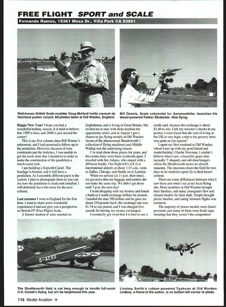 FREE FLIGHT SPORT SCALE Happy New Year hope wonderful holiday season hard believe 1999 2000 just around corner first colunm since Bill Warners retirement promised follow-up pendulum However because time constraints holidays unable get work done needed order make construction pendulum much-easier task am building Sopwith Camel fuselage framed will have pendulum As assemble different parts system plan photograph can see pendulum made installed will definitely have done next column Last sununer went England first time want share some wonderful experiences give perspective British FF Free Eight Scale former student married Englishman living Great Britain invited stay anytime opportunity arises August got chance go flying models Old Warden home phenomenal Shuttleworths collection flying machines Middle Wallop underlying reason Ive read about places years events three weekends apart traveled Jim Adams stayed different family flight left LAX LA International airport about 115 am went Dallas Chicago finally London arrived 11 pm time got news luggage models did make same trip didnt get until 7 pm next day went shopping hostess found bank could exchange dollars pounds handed man 500 dollars gave about 350 pounds back exchange rate $174 pound charged five pounds having money exchanged eventually got word best use credit card because exchange about $160 left travelers checks pocket soon found cost living UK very high trip grocery store quite eye-opener spent first weekend Old Warden met up good friend model-builder Charlie Newman couldnt believe what saw beautiful grass strip actually T-shaped old-time hangars Shuttleworth stores its aircraft museum museum closes field two days let modelers sport-fly hearts content some differences between what saw what see local flying site Most modelers Old Warden brought families youngsters flew chased models dads People brought picnic lunches eating between flights common majority power models dieselpowered Scale-type meaning werent competition 116 Model Aviation -known British Scale modeler Doug McHard holds unusual de Bill Dennis Scale columnist Aeromodeller launches Havilland pusher canard photos taken Old Warden England diesel-powered Fokker Eindecker Nice flying Shuttleworth field long enough handle full-scale Lindsey Smiths rubber-powered Typhoon Old Warden DH Comets flying will lengthened year Lindsey friend author bottom left corner photo type Scale model Regardless looked terrific air dont see much flying field power source dont see much area Jetex models saw powered way scale types jets flew very well Another large group rubberpowered models ran gambit Scale Old-Timer also Radio Control pilots pretty much kept themselves end field vendors selling things have never seen US mouth watering Sams British modeling supplier large tent packed goodies have Charlie took hangars literally ran through said coming hack later see everything good order met Doug MeHard Ron Moulton Dave Boddington Bob Jones Bill Dennisbig names British modeling world Doug brought Scale models out-of this-world fly During week rode train London went touring terrific time Lindsey Smith Shuttlewortli museum curator several years invited spend time him wife Jane took couple museums saw airplanes read about lost track rolls film used second weekend spectacular first Charlie went Woburn Abbeya 3000-acre estate beautifully kept grounds small lakes abundance grass Tiger Moth Club rents Abbey once year has fly-in Ive flown fly-ins biplane nothing like have never seen Tiger Moths Gipsy Moths Hornet Moths Rapides Dragonfly BA British Aircraft Swallow other airplanes including several Stampes flown Germany Charlie arranged get flight BA Swallow Once airborne owner gave stick flew over beautiful countryside Sunday Charlie went back Old Wardenno models time Shuttleworth s fullscale airplanes line flown DH Comet out couldnt flown because field * isnt long enough accommodate C year field will lengthened handle Comet Sea Hurricane also out flown Charlie introduced Shuttlewortli chief pilot Andy Sephtonan avid modelbuilder After Andy flew Hurricane let sit thrillfor short time felt Battle Britain also got sit in- another favorite Lysander quite chore climbing cockpit big airplane once inside what view Two other favorite airplanes flown Miles Speed Hawk Six Arrow Active pristine way looked sounded air special About 60 antique cars parade among aircraft same vintage probably antique motorcycles didnt get time get near Because Charlie knew right people watched flying vantage point lets say very close airplanes flight During next week Charlie went back Old Warden time needed see magnificent flying machines Charlie introduced crew restoration shops got go behind scenes see care airplanes Shuttleworth has oldest flying airplanes world 1909 French Bairiot 1910 French Deperdussin 1912 Blackburn Monoplane use Sea Hurricane aircraft flown low Old Warden wing warping airplane allowed flown Hying flea British government wont allow because old Peas reputation another day Charlie went Duxford Museum Its huge requires plenty walking enormous hangars WW II bombers fighters civilian aircraft different countries restored Outside Concorde can walk through interesting see small inside sophisticated airplane After leaving Duxford Charlie headed Nottingham would tell arrived 1919 Stanley Steamer automobile sitting outside street spewing steam making interesting noises home Richard Granger owns Steamer went drive Richards father designed built Granger Archaeopteryx first flew October 1930 now pan Shuttleworth collection powered two-cylinder 35-horsepower Bristol Cherub engine Thursday took train Hendon Museum fifth aircraft museum visited met Charlie told May1999 117 Nice Miles Speed Hawk Six Powered Gipsy Major engine looks flies same small fighter plane Exquisite great finish WACO YKS-7 Its authors favorite WACO U MODELER Electric Airplane Sailplane Magazine II H11 JiIii iEEiI Si EIIIkMAU Year sues Yours $24 SAVE 20% off co