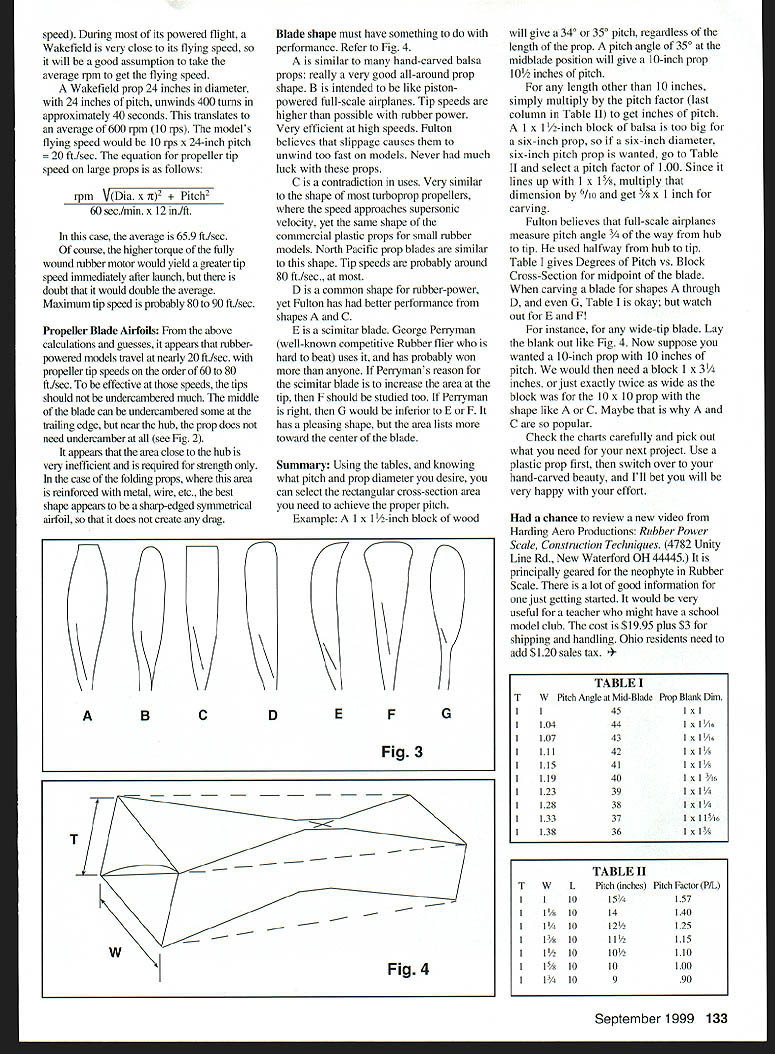 FREE FLIGHT SPORT SCALE U AT LAST YEARS FAC Flying Aces Club Nats made observation watching beautifully crafted Scale models fly overhead Although almost rubber-powered model flying rails flying much faster should have attributable too much power prop pulling model through sky Most FACers build light side rather too heavy couldnt models overpowered Most models saw flying too fast propelled plastic props am badmouth plastic props obvious reason using save time having carve break very easily generally speaking plastic props have enough pitch therefore spin faster necessary Most have probably seen pure Indoor models covered film lightness props use built up covered film props make revolution model moves forward substantial amount delicate models can stay up nearly hour time Wouldnt nice able get Scale models flying longer time aid thermal Most top competitors FAC Nats use carved prop cottage cheese variety blade area pitch can altered fairly easily essence article Fulton Hungerford very astute almost phase modeling time always winners box some unusual Scale model put forth article props can consider parameters involved next project Most have read articles dealing propellers have actually put information practice Competitive Free Flighters fly Wakefield Mulvihill models know great deal about propellers about average Rubber Scale modeler Too often much easier use plastic prop comes kit carve laminate model have just completed Yet order competitive propeller important considerations does start What size block should used What size block gives what pitch Take look Figure 1 Assume wanted carve prop 1 x 11/2 x 10 block wood carved conventional manner shown sketches referring Table 1 would get 340 pitch center blade Now complete revolution prop center blade would describe helix diameter L/2 assuming zero slippage formula pitch P x L12 x tangent pitch angle case 314 x 5 x 67 inches Therefore finished prop would have diameter 10 inches pitch l0/2 inches Okay know what thinking world want mess around math stuff Just hang will see numbers will make some sense isnt tough appears Besides can expound info friends he/she will think genius propeller blade derives its thrust exactly same formula wing derives its lift However fastest-moving part propeller tip center blade traveling about half speed 5-inch North Pacific plastic propeller will unwind 1000 turns -inch rubber loop about 40 seconds fact assumption Assume propeller rpm decreases steady rate turning say 3000 rpm moment release reaching 0 rpm 40 seconds average would 1500 rpm Assume also North Pacific prop has 300 pitch midblade position maximum attainable airplane speed zero drag slippage would 3000 x L12 x x Tan 300 t/sec 14mph Prop Tip Speed equation propeller tip speed follows rpmxitxLx 1mm x 1 cos pitch angle 60 secimin 12 inift 5-inch North Pacific prop would have maximum tip speed 3000 x [1727/866] x [1 min/60 sec] x [1/12 in/ft] t/sec Fulton compiled data doing static tests shop flight testing propellers used North Pacific props some Fulton s own handcarved props up six inches diameter equation propeller tip speed slightly different larger props such used Wakefield models Larger props efficient slippage major factor model actually gets up flying speed matter two seconds usually launched speed greater normal flying 132 Model Aviation 60 80 ft/sec ZIZIli 30 40 ft/sec 20 ft/sec 450Fig 2 speed During its powered flight Wakefield very close its flying speed will good assumption take average rpm get flying speed Wakefield prop 24 inches diameter 24 inches pitch unwinds 400 turns approximately 40 seconds translates average 600 rpm 10 rps models flying speed would 10 rps x 24-inch pitch t/sec equation propeller tip speed large props follows rpm Dia x it2 h2 60 secimin x 12 inift case average 659 ftisec course higher torque fully wound rubber motor would yield greater tip speed immediately after launch doubt would double average Maximum tip speed probably 80 90 ftisec Propeller Blade Airfoils above calculations guesses appears rubberpowered models travel nearly 20 ftIsec propeller tip speeds order 60 80 ftisec effective speeds tips should undercambered much middle blade can undercambered some trailing edge near hub prop does need undercamber see Fig 2 appears area close hub very inefficient required strength case folding props area reinforced metal wire etc best shape appears sharp-edged symmetrical airfoil does create drag IIKY ABC D Blade shape must have something performance Refer Fig 4 similar hand-carved balsa props really very good all-around prop shape B intended like pistonpowered full-scale airplanes Tip speeds higher possible rubber power Very efficient high speeds Fulton believes slippage causes unwind too fast models Never much luck props C contradiction uses Very similar shape turboprop propellers speed approaches supersonic velocity yet same shape commercial plastic props small rubber models North Pacific prop blades similar shape Tip speeds probably around 80 ft/sec D common shape rubber-power yet Fulton has better performance shapes C E scimitar blade George Perryman well-known competitive Rubber flier hard beat uses has probably won anyone Perrymans reason scimitar blade increase area tip F should studied too Perryman right G would inferior E F has pleasing shape area lists toward center blade Summary Using tables knowing what pitch prop diameter desire can select rectangular cross-section area need achieve proper pitch Example A 1 x 1 /2-inch block wood \ EFG Fig 3 will give 340 350 pitch regardless length prop pitch angle 350 midblade position will give 10-inch prop 10/2 inches pitch length other 10 inches simply multiply pitch factor last column Table II get inches pitch x 1 /2-inch block balsa too big six-inch prop six-inch diameter six-inch pitch prop wanted go Table II select pitch factor 100 Since lines up 1 x Is/s multiply dimension 610 get 5/ x 1 inch carving Fulton believes full-scale airplanes measure pitch angle hub tip u
