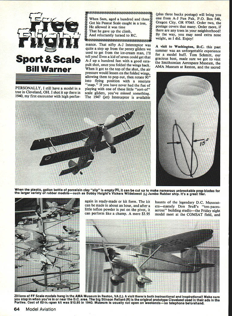 C, [U Sport & Scale Bill Warner PERSONALLY still have model tree Cleveland OH shot up 1940 first encounter high perfor mance nifty A-J Interceptor quite step up penny gliders used get ice-cream man Ill tell kid seven could get A-J up hundred feet good cata pult shot once folded wings back got top shot air pressure would lessen folded wings allowing pop out rotate 900 flying position resolute snap have never fun playing little sort-of scale gliders youve missed something 1947 jet Interceptor available plus three bucks postage will bring A-J Fun Pak PO Box 548 Oregon City OR 97045 Order two postage covers Order trees neighborhood way may need extra nose weight did Enjoy visit Washington DC past summer unforgettable experience model buff Tom Schmitt gracious host made sure got visit Smithsonian Aerospace Museum AMA Museum Reston sacred 64 Model Aviation Sam aged hundred three Got Peanut Scale caught tree allowed time gave up climb reluctantly turned RC plastic gallon bottle porcelain clay slip empty R can cut up make numerous unbreakable prop blades larger variety rubber modelssuch Bobby Halghts Vickers Wildebeest 1 Jumbo Rubber ship Its great flier again ready-made kit form kit haunts legendary DC Maxecut can made about hour after ersnamely Don Srulls ten-paces little teflon powder put pivot across building studiothe Friday night can perform like champ mere $395 model meet COMSAT field Zillions FF Scale models hang AMA Museum Reston VA 1 visit both instructional inspiratlonail Make sure stop youre near DC area big Stinson Reliant R original prototype Cleveland used ads Foiea Cost 82in.span kit $1095 1940 Museum usually open weekendsso telephone beforehand Classic AJ Interceptor glider 1 fun barrel jelly bears wings unfold top catapult-launch climb qildes well Available again after over 30 years Mark Finemans San Diego Flagship R Peanut Scale craft flies 20-30 sec better original racer Thirties Its yellowlblue white letters Pineman photo traditional bull session Roy Rogers restaurant Discussions centered latest tricks modeling such getting ether diesel fuel Instant Start spray cans available auto supply stores expedient attaching four feet fuel tubing spray nozzle using condenser An alternative putting hole can 22 rifle 30 feet mentioned having tried good results us condenser idea would seem safest great fun attending COMSAT flying evening calm wide variety outstanding Scale models filling sky CO-2 Guillows FW-190 Allan Schanzle outfiew others big mass-launch evening. fine Luscombe Phantom Rolfe Grego rys Rolfe built originals reason probably four-pound balsa Allan uses Other vivid memories clude Don SrulIs electric Bleriot doing over three minutes watching jumbo-rubber Curtiss floating tree resulting retrieval jamboree everyone offering Don lots great ideas old weighted-string routine finally bore fruit trip AMA Museum Reston VA far DC Tom Curator Hurst Bowers real treat have always sucker models hanging ceiling think V-L Products new miniature electric geared motor features plug-in Ni-Cd bat tery pack flies 24-In Scale job easily Company says available soon thing turned modeling rather life crime sight huge silver Scale model hanging ceil ing Fleischmanns Bike Shop Raven na OH late Thirties such impressive sight saw original 82-in Cleveland Model Supply Stinson Reliant its splendor Reston about went ecstasy Other Continued page 156 January1986 65 Club newsletters backbone FF Scale feature news plans 3-views humor hints tips months column lists few best Dick Allen keeps pencil sharpener drawing board up Canada figures rib cap strips information write Chuck Anderson 202 Inglewood Circle Tullahoma TN 37388 phone 615 455-5788 Dan Pruss example computer-generated airfoil plot April 1985 RC Soaring column MA Thats now Ill back two monthskeep cards letters photos coming way Dont send Harry Murphy wholl FF Duration helm next month Bob Meuser 4200 Gregory St Oakland CA 94619 FF Scale/Warner Continued page 65 landmarks FE Scale history include Miss LA Miles Atwood rubber jobs Jack McCracken made great Lawrence Brown back early Thirties restored early Seventies Russ Barrera came possession two rather deteri orated ships Youll remember Miss LA trick models period its automatic flaps came down landing rubber motor slackened CO Wrights historic Nats-winning Antoinette Danny Lutz impeccable 2-speed Chester Jeep Den nis Normans flashy Caproni twinengined rubber bipe large number late great George Meyers ships such Luscombe Phantom Moeller Stomo Arrow Scout model mobiles hanging ceiling allow models displayed nicely though pair binocu lars would help appreciate better Hurst has done great job Museum AMA Members visit will feel really impressed Plastic props Jumbo Rubber ships hard come 9-in Peck prop about biggest see break Bobby Haight Vegas Vulture cuts blades gallon porcelain slip containers after charming wife Doris has poured contents few dozen doll-head molds Affixed epoxy dowel hubs balsa spinners slotted receive work great three blader jumbo Vickers Wildebeest fairly low-pitch performs quite well can find bottles dumpsters behind industrial users have contained green soap like might try local craft shop see know anyone pouring doll molds bottles Bobby uses trans luscent white material 035-in thick Bill Hannans new book Models Musings has out couple months now have putting off getting should think about adding collection before sold out Strong semi-sort-of scale simple model book just thing pull off shelf Fridaynight model project will fly Saturday morning paltry $895 &lus buck postage get yours WC Hannan Graphics PO Box Escondido CA 92025 response reader requests am including following list Clubs newsletters useful informa tive EF Scalers DC Maxecuters Allan Schanzle 20008 Spur Hill Dr Gaithersburg MD 20879 Bi-monthly Great plans three-views articles photo page $10/yr Flying Aces Lin Reichel 3301 Cindy Lane Erie PA 16506 official FAC newsletter Plans news contests fun must Quarterly $10/yr Flightm