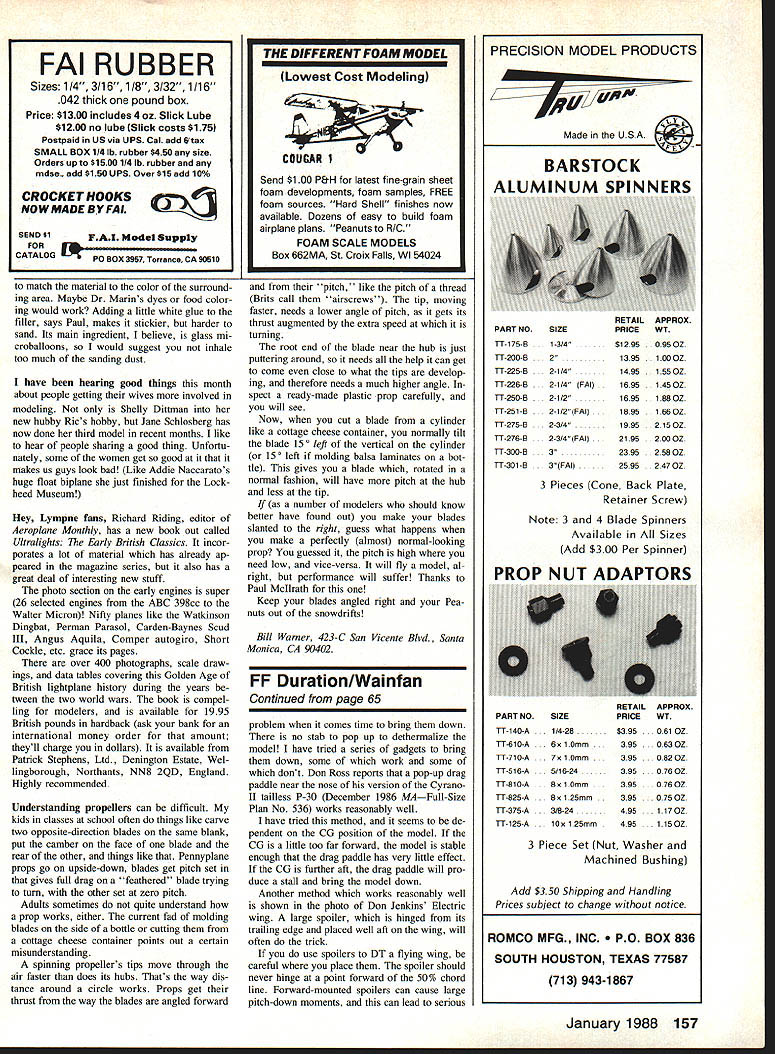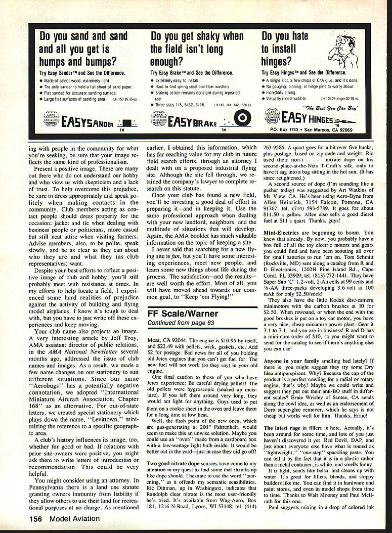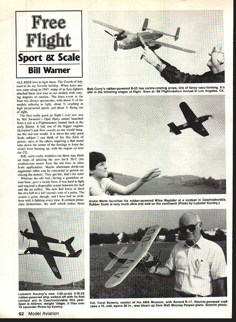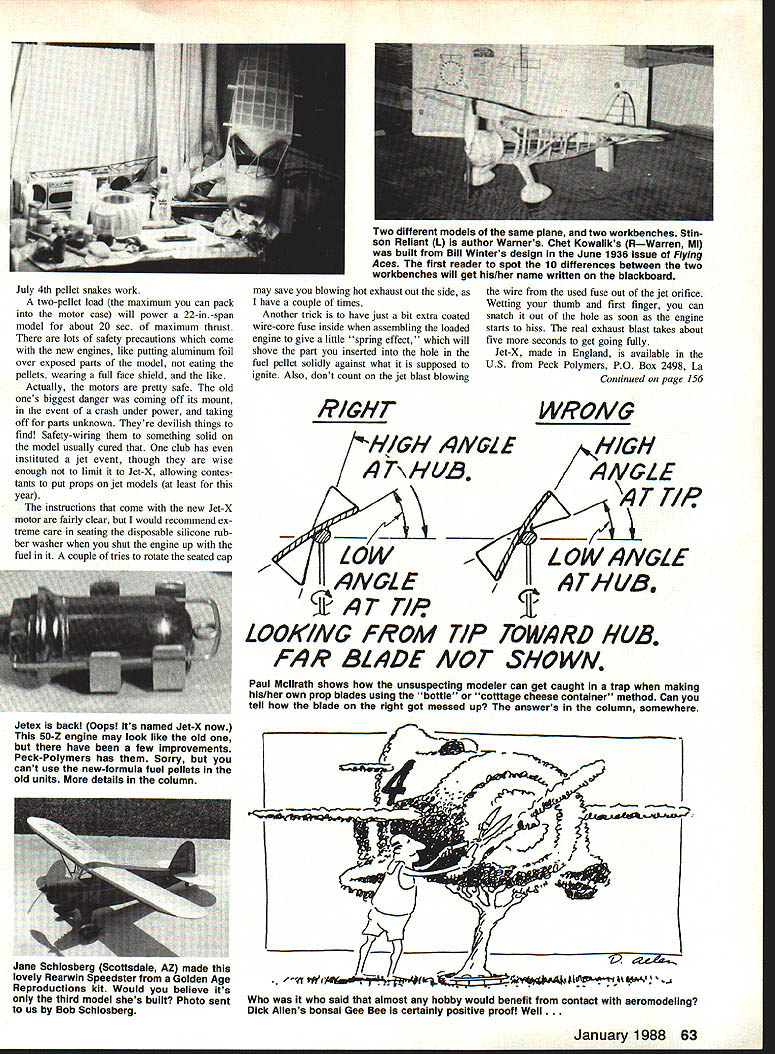 N ALL KIDS love light fuses Fourth July used favorite holiday Jetex mo tors came along 1947 us fuse-lighters attached new toys models vary ing degrees success Jetex event Nats always spectacular about models refusing light about crashing high jet-powered speed about flying out sight first really good jet flight ever saw Hal Swansons Opel Hatry model launched rail Flighsmasters Annual back early Sixties bigger engines Scorpion flew exactly would imag ine real would about good Scale subject can think form power others requiring thin metal tube down center fuselage keep model burning up engine up near CG Still some crafty modelers out may think up ways utilizing new Jet-X 50-Z smallest-size motor old line other Scale applications Maybe aluminum drink-can augmenter tubes can concocted permit en closing motors get hot thats sure Whereas old fuel having guanidine ni trate base gave steady burn hard light required disposable screen between fuel jet orifice new fuel burns short fits half full secondsort pulse screen gone though have no prob lems lighting time contains potas sium dichromate stuff makes 62 Model Aviation Free Flight Sport & Scale Bill Warner Bob Currys rubber-powered 8-25 has contra-rotating props lots fancy vacu-forming Its still trimming stages flight Seen 86 Flightmasters Annual Los Angeles CA Andre Merta launches rubber-powered Miles Magister contest Czechoslovakia Rubber Scale very much alive well contlnentl Photo Lubomir Koutny Lubomir Koutnys new 1/20-scale SM92 rubber-powered ship walked off its first contest win Czechoslovakia year Span 930mm weight 100gm flies over 70 secondsl Photo Koutny Col Hurst Bowers curator AMA Museum Renard R17 Electric-powered craft uses VL unit spans 30 blown up Walt Mooney Peanut plans Schmitt photo July 4th pellet snakes work two-pellet load maximum can pack motor case will power 22-in-span model about 20 sec maximum thrust lots safety precautions come new engines like putting aluminum foil over exposed parts model eating pellets wearing full face shield like Actually motors pretty safe old ones biggest danger coming off its mount event crash under power taking off parts unknown Theyre devilish things find Safety-wiring something solid model usually cured club has instituted jet event though wise enough limit Jet-X allowing contes tants put props jet models least year instructions come new Jet-X motor fairly clear would recommend ex treme care seating disposable silicone rub ber washer shut engine up fuel couple tries rotate seated cap Two different models same plane two workbenches Stin son Reliant L author Warners Chet Kowaliks RWarren Ml built Bill Winters design June 1936 issue Flying Aces first reader spot 10 dIfferences between two workbenches will get his/her name written blackboard may save blowing hot exhaust out side have couple times Another trick have just bit extra coated wire-core fuse inside assembling loaded engine give little spring effect will shove part inserted hole fuel pellet solidly against what supposed ignite Also dont count jet blast blowing RIGHT wire used fuse out jet orifice Wetting thumb first finger can snatch out hole soon engine starts hiss real exhaust blast takes about five seconds get going fully Jet-X made England available US Peck Polymers PO Box 2498 La Continued page 1S6 WROIVG I-I/Gil 4VGLEi-fIG/I AT\H&BAIIVGLE 71T LOWOW4VGLE WI I1VGLE TI-it/B LOOK/NC FROM 7/P TOWQRD HUB FAR BLWE NOT SHOWN Paul Mcllrath shows unsuspecting modeler can get caught trap making his/her own prop blades using bottle cotttage cheese container method Can tell blade right got messed up answers column somewhere L7ri4t said almost hobby would benefit contact aeromodeling Dick Allens bonsai Gee Bee certainly positive proof Well January 1988 63 liii IS V Jetex back Oops Its named Jet-X now 50-Z engine may look like old have few Improvements Peck-Polymers has Sorry cant use new-formula fuel pellets old units details column Jane chlosberg Scottsdale AZ made lovely Rearwin Speedster Golden Age Reproductions kit Would believe its third model shes built Photo sent us Bob Schlosberg sand sand get humps bumps Try Easy San4IerTM See Difference Made select wood extremely light sander hold full oheet sand paper Flat sanded accurate sanding surface Large flat surfaces sanding area LO 50 $095 ea get shaky whenDo hate field isnt longto install enoughhinges Try Easy BrakenM See DifferenceTry Easy HingesnM See Difference single slot few drops C/A glue its done No gosling pinning hinge pins worry about Incredibly strong virtually indestructible Extremely easy ts install lard find spring steel fiber washers Braking action remains constant during rapeated useLO 10024 hiioeS $205 00 0 Three sizes 1/8 5/32 316LO 140 141 142 Oorea EAY5RNDER 1U2EASY BRAKE izQ Box 1743 Marcos CA 92069 ing people community what youre seeking sure image re flects same kind professionalism Present positive image out understand hobby view us skepticism lack trust help overcome prejudice sure dress appropriately speak po litely making contacts community Club members acting con tact people should dress properly occasion jacket tie dealing business people politicians casual still neat attire visiting farmers Advise members also polite speak slowly clear can about what club representatives want Despite best efforts reflect posi tive image club hobby youll still probably meet resistance times efforts help locate field experi enced some hard realities prejudice against activity building flying model airplanes know its tough deal have just write off ex periences keep moving club name also projects image very interesting article Jeff Troy AMA assistant director public relations AMA National Newsletter several months ago addressed issue club names images As result made few name changes stationery suit different situations Since name Aerobugs has potentially negative connotation adopted International Miniature Aircraft Association Chapter 168 alternative out-of-state letters created sp