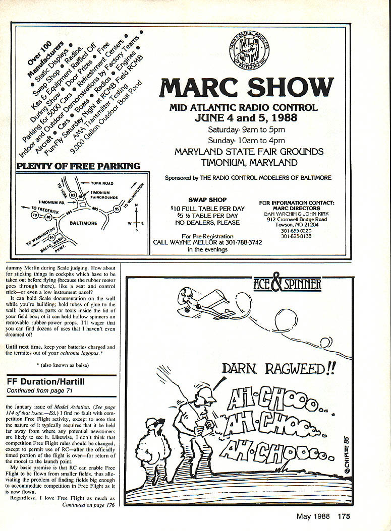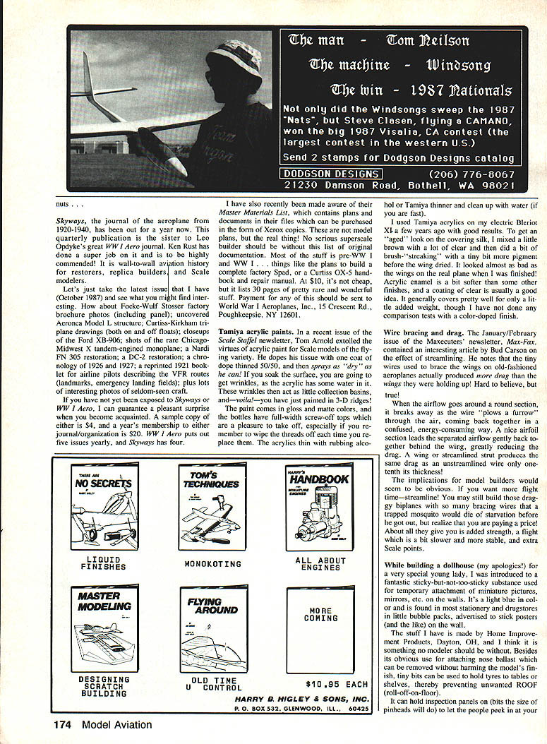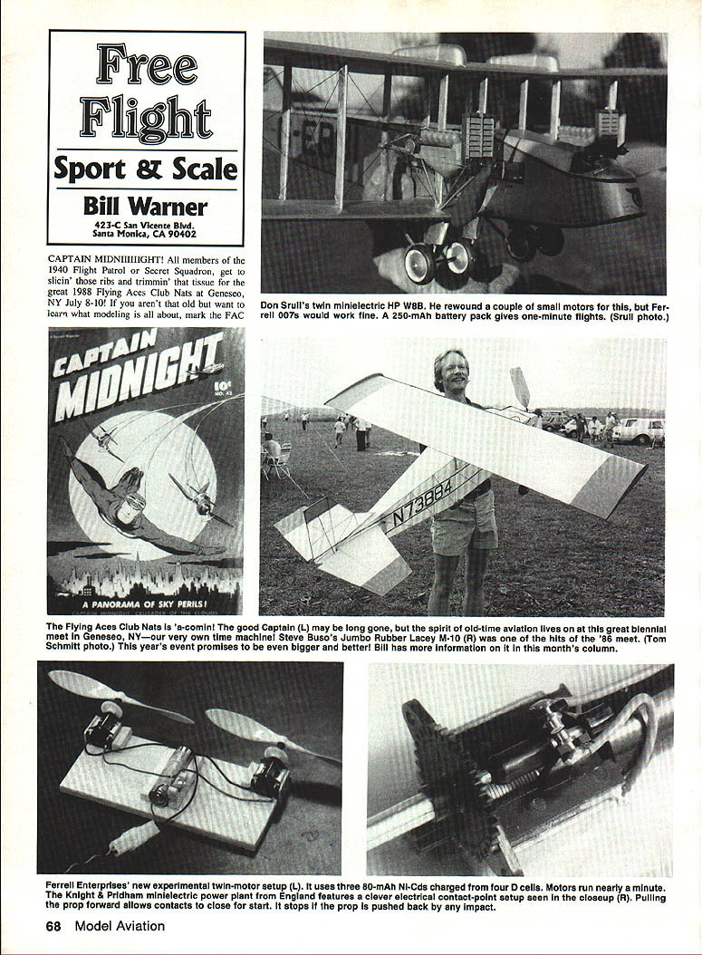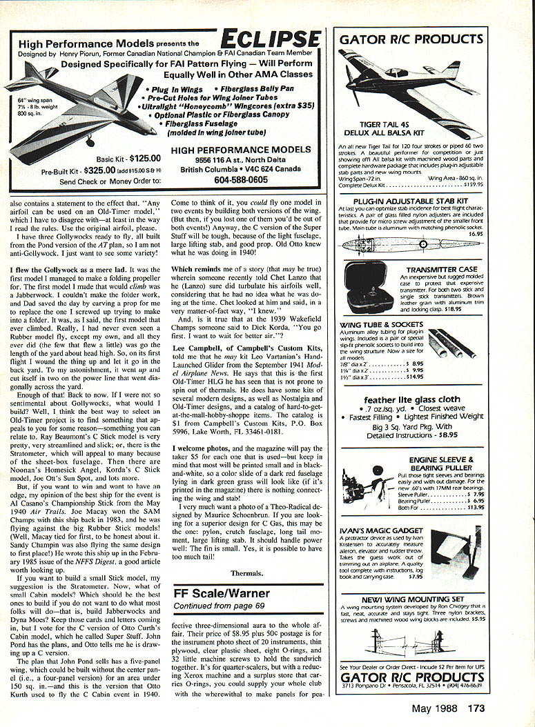 CAPTAIN MIDNIIIIIIGHT members 1940 Flight Patrol Secret Squadron get slicin ribs trimmin tissue great 1988 Flying Aces Club Nats Geneseo NY July 8-10 arent old want learn what modeling about mark FAC 68 Model Aviation Free Flight Sport & Scale Bill Warner 423-C San Vicente Blvd Santa Monica CA 90402 Don Sruiis twin minielectric HP WeB rewound couple smail motors Fer rell 007s wouid work fine 250-mAh battery pack gives one-minute flights Sruii photo Flying Aces Club Nats a-comm good Captain L may long gone spirit old-time aviation lives great biennial meet Geneaso NYour very own time machine Steve Busos Jumbo Rubber Lacey M-1O R hits 86 meet Tom Schmitt photo years event promises bigger better Bill has information months column Farrell Enterprises new experimental twin-motor setup L uses three 80-mAh Ni-Cds charged four D cells Motors run nearly minute Knight & Pridham minielectric power plant England features clever electrical contact-point setup seen closeup R Pulling prop forward allows contacts close stafl stops prop pushed back Impact Warner getting lot mileage out photos great 82-in-span Stinson Reliant L constructed Cleveland kit plans Structure almost too pretty cover PAW 19 diesel powers ita far cry Ohlsson 60 suggested original $1095 kit Lar ry Kruse won Power Scale 87 Nats C02-powered Cessna Comet R Whos gonna stop him 88 Virginia Beach Nats Nats calendar send information CD Allan Schanzle 2008 Spur Hill Dr Gaith ersburg MD 20789 year host club will DC Maxe cuters $10 will bring year une qualled newsletter Max-Fax have finally brought together top skysters US Canada will hand cuddle cumulus share million flying tales spare time biennial extravaganza will feature Rubber Scale Jumbo Scale Peanut Scale Power Scale mass-launch events regular Peanut WW multiplanes Thompson Greve air racers Golden Age WW II planes Embryo En durance traditional banquet Saturday night will cherry sundae Although its AMA sanctioned FAC rules will used Some rules changes 1988 have made suggest already Flying Aces Club member join today get latest March/April issue Flying Aces News has new rules Nine bucks will get mailing list National Comman dant himself Lin Reichel will send new rules information dont want trouble Maxecuters Write Flying Aces News 3301 Cindy Lane Erie PA 16506 have never made FAC Nats will pleasant surprise tough competition everyone knows up against very best also cut throat competition Its guy would have just much fun helping competitor take first winning himself Dont miss Build Fly. Win EFF Y EEE DC Dart diesel owners might want check out new radial mount little darlings fered through Eric Clutton guy sells nifty little PAW diesels Ric Dittman flew down Seattle Los Angeles just show us new remanufactured DC Dart win Flightmasters Annual Taylorcraft just got Eric $38 Well ya gotta have ya gotta have Compared 1A-scale five-cylinder fourstroker its much What nice addition deal ra dial mount six dollars am enchanted beam mountings intend go radial next payday send dollar Eric Clutton 913 Cedar Lane Tullahoma TN 37388 listings experience service has good strange case 0-ring bezel years IMS exposition Pasadena ran across neat idea making bezels go struments have photographed next instrument panel International Specialties 2310 Cimarron Rd Las Vegas NV 89117 does up very nice instrument panel kit huge airplanes secret good-looking panels use thin 0-rings set oversized holes cover panel letting about half thickness protrude face thereby giving very ef Continued page 173 May 1988 69 AMA Museum Curator Hurst Bowers L gloats pleasure has chance hold fabulous Air Transport P-2 built Walt Eggert R Walt won 1941 Nats original rubber-powered model freshly built uses Gas power SOTS label Walts shirt stands Society Old-Time Scale Modelers Photo Tom Schmitt Bob Currys excellent Bearcat Dave Diehls kit Bob says went together parts fitting just right Based results really believe him High Performance Models presents ECL IPSE Designed Henry Piorun Former Canadian National Champion & FAI Canadian Team Member I Designed Specifically FAI Pattern Flying Perform Equally Well Other AMA Classes also contains statement effect Any airfoil can used Old-Timer model have disagree withat least way read rules Use original airfoil please have three Gollywocks ready fly built Pond version AT plan am anti-Gollywock just want see some variety flew Gollywock mere lad first model managed make folding propeller first model made would climb Jabberwock couldnt make folder work Dad saved day carving prop replace screwed up trying make folder said first model ever climbed Really never seen Rubber model fly except own ever did few flew little go length yard about head high So its first flight wound thing up let go back yard astonishment went up cut itself two power line went dia gonally across yard Enough Back now sentimental about Gollywocks what would build Well think best way select Old-Timer project find something ap peals some reasonsomething can relate Ray Beaumonts C Stick model very pretty very streamlined slick Stratometer will appeal because sheet-box fuselage Noonans Homesick Angel Kordas C Stick model Joe Otts Sun Spot lots want win want have edge opinion best ship event Al Casanos Championship Stick May 1940 Air Trails Joe Macay won SAM Champs ship back 1983 flying against big Rubber Stick models Well Macay tied first honest about Sandy Champin also flying same design first place wrote ship up Febru ary 1985 issue NFFS Digest good article worth looking up want build small Stick model suggestion Stratometer Now what small Cabin models Which should best ones build want what folks will dothat build Jabberwocks Dyna Moes Keep cards letters coming vote C version Otto Curths Cabin model called Super Stuff John Pond has plans Otto tells draw ing up C version plan John Pond sells has five-panel wing could built center pan el ie four-panel version area under 150 sq inand version Otto Kurith used fly C Cabin event 1940 Plug Wi