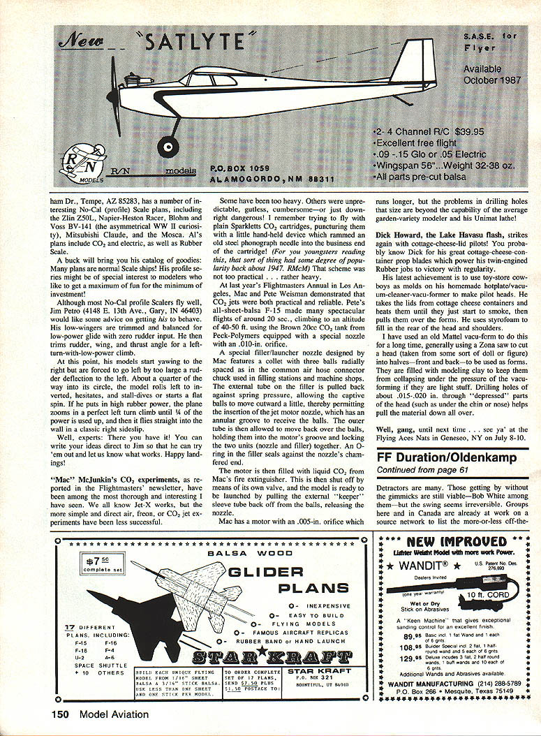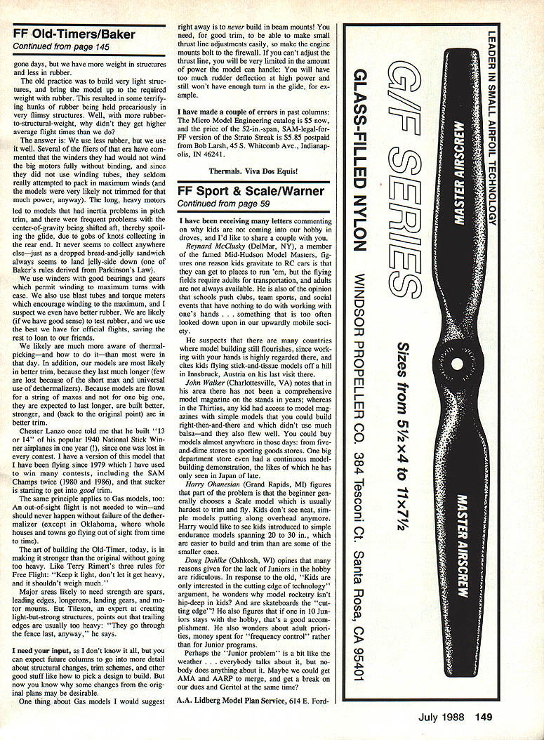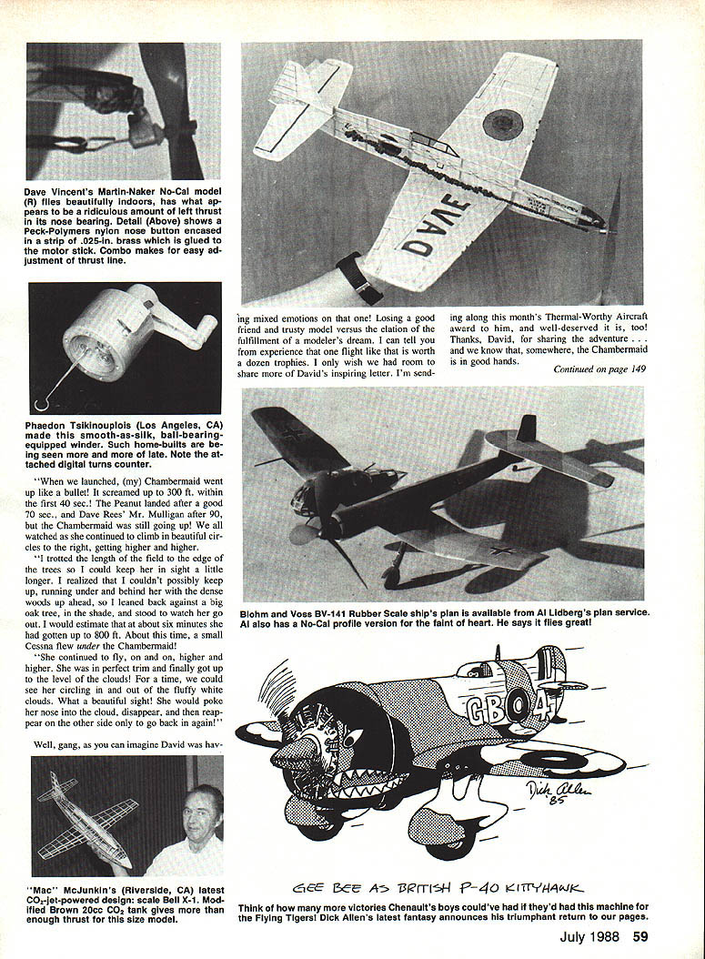 LETS get off ground month salute David Smith Columbia SC famous disappearing Chambermaid sometimes referred unceremoniously Chamberpot certain old-timers evidently know about something dont Davids model legendary air racer designed Bill Henn two 38-inlong loops A-in FAI rubber absorbed 1500 turns put little beauty up realm Hung Great God Thermals climb steep right 9-in Peck prop just right glide also right After long career literally dozens two- three-minute flights Hung finally took model built 1980 home bosom Although model OOS out-of-sight Ed 10 mm 25 sec chances good still up Ill let David tell own words No its Han Solo carbonite its ginning iighwelght vacu-formed pilot Dick Howard Lake Havasu AZ uses toy fig ures plastic cottage cheese carton tops Builder David Smith earns months Thermal Worthy Aircraft TWA award flight ended long illustri ous career Bill Henn-designed Cham bermaid went OOS over 10 minutes day contest Mac McJunkin gave everyone 1987 Fiightmasters Annual eyeful C021 rocket power Pete Weisman built all-sheet-balsa profile F-i 5 photos holds Above Mac refills shot liquid CO2 Brown 20cc tank basis rocket motor its 11 oz initial thrust tapers off 2 oz over 20-sec run Photo Below L shows filler-launcher head near model Outer tube can slide back causing three trapped balls release grip grooved motor nozzle allowing model become airborne Photo Below R shows motor filler/launcher connected Note simple motor mount Bill Noonan magnificent Late 28 serve remind us Flying Aces Clubs Nate coming Genesco NY July Plan its like heaven FF Scale fans 58 Model Aviation Free plait Sport & Scale Bill Warner 423-C San Vicente Blvd Santa Monica CA 90402 picture-perfect days race plane event previous round Peanut Chambermaid al five entries As expected two big outfiew version Mr Mulligan 24-in Chambermaids went out first did outfly Maid good 30 sec So second rounds little concerned because next round saw go up 1500 turns Dave Vincents Martin-Naker No-Cal model R flies beautifully indoors has what ap pears ridiculous amount left thrust its nose bearing Detail Above shows Peck-Polymers nylon nose button encased strip 025-in brass glued motor stick Combo makes easy ad justment thrust line ing mixed emotions Losing good friend trusty model versus elation fulfillment modelers dream can tell experience flight like worth dozen trophies wish room share Davids inspiring letter Im send- Continued page 149 launched Chambermaid went up like bullet screamed up 300 ft within first 40 sec Peanut landed after good 70 sec Dave Rees Mr Mulligan after 90 Chambermaid still going up watched continued climb beautiful cir cles right getting higher higher trotted length field edge trees could keep sight little longer realized couldnt possibly keep up running under behind dense woods up ahead leaned back against big oak tree shade stood watch go Out would estimate about six minutes gotten up 800 ft About time small Cessna flew under Chambermaid continued fly on higher higher perfect trim finally got up level clouds time could see circling out fluffy white clouds What beautiful sight would poke nose cloud disappear reap pear other side go back again Well gang can imagine David hayMac McJunklns Riverside CA latest 6E i3 A5 RITIS4 940 iTy/*OJj- C02-jet-powered design scale Bell X-1 Mod ified Brown 20cc CO2 tank gives Think victories Chenaults boys couldve theyd machine enough thrust size model the Flying Tigers Dick Allens latest fantasy announces triumphant return pages July 1988 59 Phaedon Tsikinouplois Los Angeles CA made smooth-as-silk ball-bearingequipped winder Such home-builts ing seen more late Note tached digital turns counter ing along months Thermal-Worthy Aircraft award him well-deserved too Thanks David sharing adventure w somewhere Chambermaid good hands Blohm Voss BV-141 Rubber Scale ships plan available Al Lidbergs plan service Al also has No-Cal profile version faint heart says flies great FF Old-Timers/Baker Continued page 145 gone days have weight structures less rubber old practice build very light struc tures bring model up required weight rubber resulted some terrify ing hunks rubber being held precariously very flimsy structures Well rubberto-structural-weight didnt get higher average flight times answer use less rubber use well Several fliers era have com mented winders would wind big motors fully binding since did use winding tubes seldom really attempted pack maximum winds models very likely trimmed much power anyway long heavy motors led models inertia problems pitch trim frequent problems center-of-gravity being shifted aft thereby spoil ing glide due gobs knots collecting rear end never seems collect anywhere elsejust dropped bread-and-jelly sandwich always seems land jelly-side down Bakers rules derived Parkinsons Law use winders good bearings gears permit winding maximum turns ease also use blast tubes torque meters encourage winding maximum suspect have better rubber likely have good sense test rubber use best have official flights saving rest loan friends likely much aware thermalpickingand itthan day addition models likely better trim because last much longer few lost because short max universal use dethermalizers Because models flown string maxes big expected last longer built better stronger back original point better trim Chester Lanzo once told built 13 14 popular 1940 National Stick Win ner airplanes year e lost contest have version model have flying since 1979 have used win contests including SAM Champs twice 1980 1986 sucker starting get good trim same principle applies Gas models too An out-of-sight flight needed winand should never happen failure dether malizer except Oklahoma whole houses towns go flying Out sight time time art building Old-Timer today making stronger original going too heavy Like Terry Rimerts three rules Free Flight Keep light dont let get heavy shouldnt weigh much Major areas likely need strength spars leading edges longerons landing gears mo tor mounts Eu