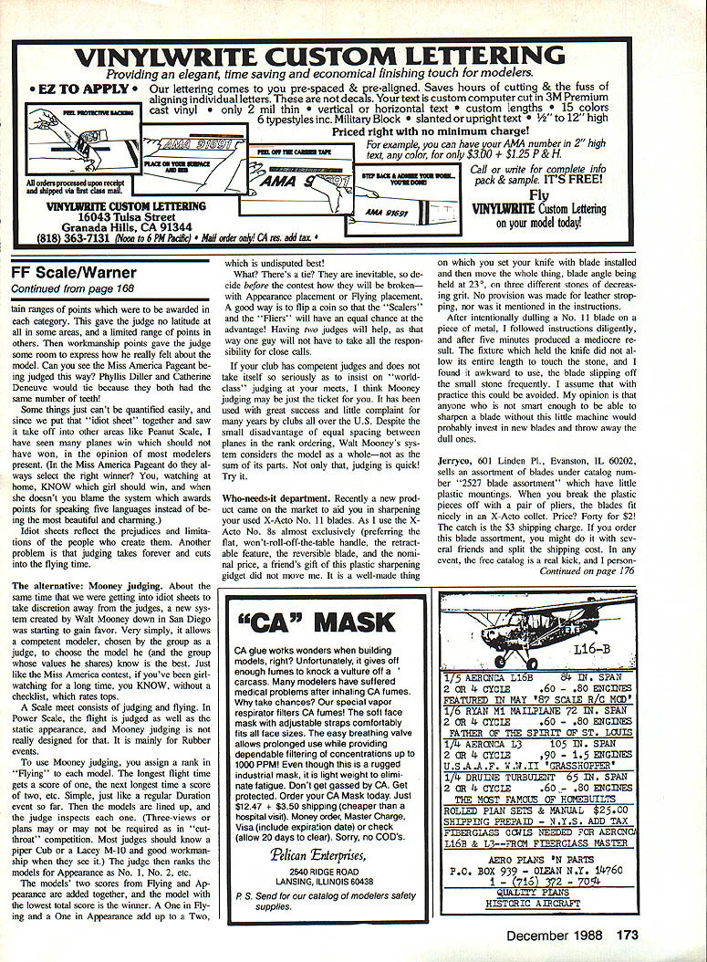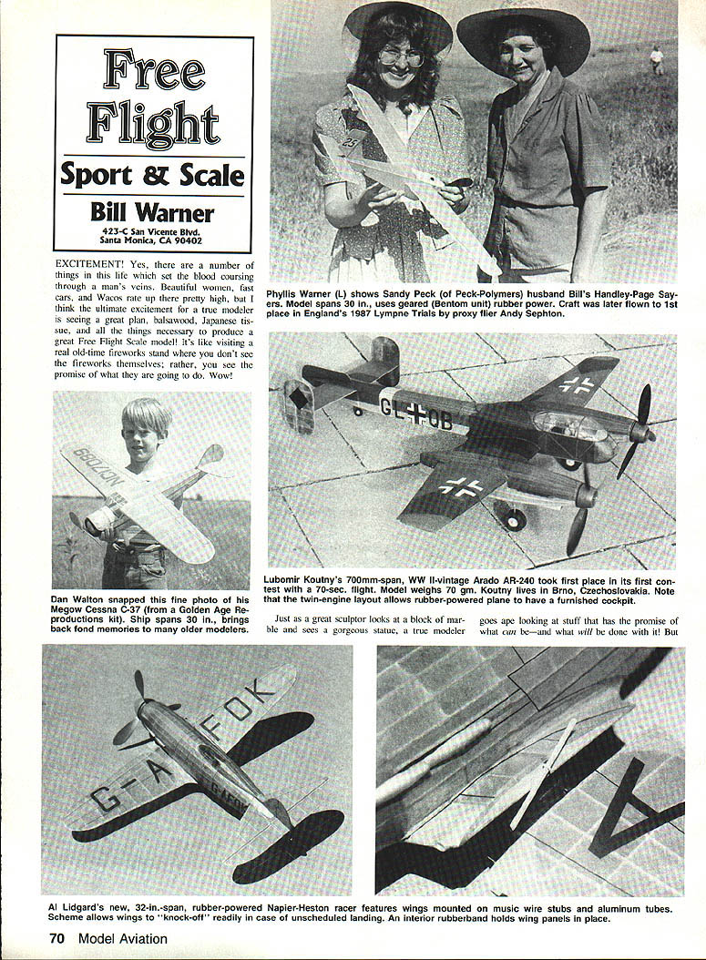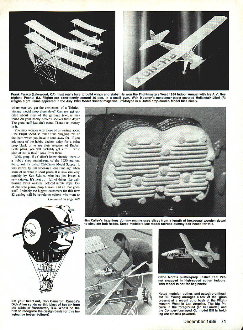 EXCITEMENT Yes number things life set blood coursing through mans veins Beautiful women fast cars Wacos rate up pretty high think ultimate excitement true modeler seeing great plan balsawood Japanese tis sue things necessary produce great Free Flight Scale model Its like visiting real old-time fireworks stand dont see fireworks themselves rather see promise what going Wow Dan Walton snapped fine photo Megow Cessna C-37 Golden Age Re productions kit Ship spans 30 brings back fond memories older modelers Just great sculptor looks block mar ble sees gorgeous statue true modeler goes ape looking stuff has promise what can beand what will done Al Lidgards new 32-in-span rubber-powered Napier-Heston racer features wings mounted music wire stubs aluminum tubes Scheme allows wings knock-off readily case unscheduled landing An interior rubberband holds wing panels place 70 Model Aviation Free Flight Sport & Scale Bill Warner 423-C San Vicejue Blvd Santa Nonica CA 90402 Phyllis Warner L shows Sandy Peck Peck-Polymers husband Bills Handley-Page Say ers Model spans 30 uses geared Bentom unit rubber power Craft later flown 1st place Englands 1987 Lympne Trials proxy flier Andy Sephton Lubomir Koutnys 700mm-span WW Il-vintage Arado AR-240 took first place its first con test 70-sec flight Model weighs 70 gin Koutny lives Brno Czechoslovakia Note twin-engine layout allows rubber-powered plane have furnished cockpit Frank Faraco Lakewood CA must really love build wings stabs won Flightmasters West 1988 Indoor Annual AV Roe triplane Peanut L Flights consistently around 40 sec small gym Walt Mooneys condenser-paper-covered Hollandair Libel R weighs 8 gin Plans appeared July 1988 Model Builder magazine Prototype Dutch crop-duster Model flies nicely can get excitement Thirtiesvintage model shop days Can get ex cited about garbage excuse found hobby dealers shelves days good stuff just aint Theres no money may wonder us writing about Free Flight spend much time plugging item have send away ask hobby dealers today balsa prop blank see selection Rubber Scale plans will probably get at kind nut look Well gang ya didnt know already hobby shop reminiscent 1930 era out its called Old-Timer Model Supply started Jim Noonan long time ago some us short pants now run very capably Ken Sykora has just issued new catalog Its neat ll things like ballbearing thrust washers colored nitrate dope lots old-time plans prop blanks good stuff Probably biggest customers new $2 catalog will newsletter editors want Continued page 168 Eat heart out Don Cameron Canadas Dick Allen sends us blast hot air wilds Vancouver BC Wholl first recognize design basis im aginative hot-air balloon December 1988 71 Jim Calleys ingenious dummy engine uses slices length hexagonal wooden dowel simulate bolt heads Some modelers use model railroad dummy bolt heads Gabe Moras pusher-prop Lesher Teal Pea nut snapped high-speed action indoors model beginners Noted modeler author autogiro enthusi ast Bill Young arranges few giros present recent auto bash Flightmasters West Los Angeles big Pitcairn foreground RC model Comper-fuselaged CL model Bill hold ing electric-powered List standard tools a Dremel Moto Tool assorted cutters grinders b Various numbered fractional drills indi cated drawing c Electric hand drill d Coping saw jigsaw band saw e X-Acto knife various blades f White glue cyanoacrylate glue CyA CyA debonder g An assortment wood files whatever fits hand h 4-40 tap No 43 drill bit Speed pan suppliers Nick Arpino 301 Woodacres Rd East Patchogue NY 11772 Des MeAnelly 47 Norwood St Invercar gill New Zealand Herbs Speed & Racing 1621 M St Mer ced CA 95340 responding advertisers mention read about ModeIAviatiOfl salt publications great drawings Ken has included can read getring excited should turn Captain Mid night Secret Decoder Badge order catalog send two clams OTMS PO Box 7334 Van Nuys CA 91409 Support cottage industries Al Lidbergs latest Rubber Scale plan has some features make super transition modeler has built few kit models ready step up something really classy Its 1940 Napier-Heston JA-5 racer spans about 32 things make exciting fact done-to-death military sub ject fellow modelers just sort ignore its brought field Instead has nice fat streamlined fuselage big spin ner lots room rubber Thrust adjust ments center-of-gravity actually shown plan lack plans makes wonder designer ever flew prototype Theres also knock-off wing mount ing system similar showed photo Tayloreraft/Auster March 1988 column shortened up wire stubs make truly knock-offable whereas prefer use longer stubs bend back bit ab sorb shock actually coming off can start longer trim em down fly until get what works best Als building trimming booklet has some nice hints too plan booklet come catalog $6 AA Lidberg 614 E Ford ham Tempe AZ 85283 Hi-Line Ltd PO Box 341283 Bethesda MD 20817 newest company exploding Mini-Electric field best company has kept costs modeler down providing do-it-yourself kits buyer gets two motors materials re wind armatures build gear-drive freewheeling Hooking up everything requires using no common pencil-type solder ing iron ability follow step-by-step instructions charger kit Ni-Cd batteries also avail able MEK-1 dual-motor kit features high-quality carbon-brushed motor made Kodak disc-drive cameraa thing have purchased surplus sales outfits have known what Hi-Line has engineered hopped-up motor has provided gears wire make work aeroplanes instead cameras tiny six-watt darlings just things need multiengined craft having wingspans ranging mid-twenties fortyish range 461 gear-down turns 5-12-indiameter Williams Bros CO2 plastic prop avail able Peck-Polymers 4500 rpm setup using motor its battery weighs 1518 oz motors powering Nats winning single- multiengine Scale ships Don Srull Dave Rees great success Drop Hi-Line letter request informa tion sure include large SASE Idiot-sheet judging versus Mooney judging Back Sixties Flightmasters Los An geles CA sparked Ha