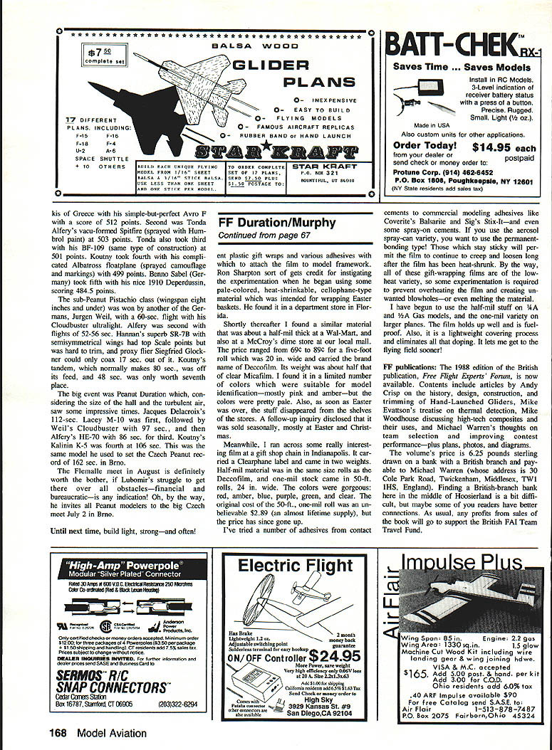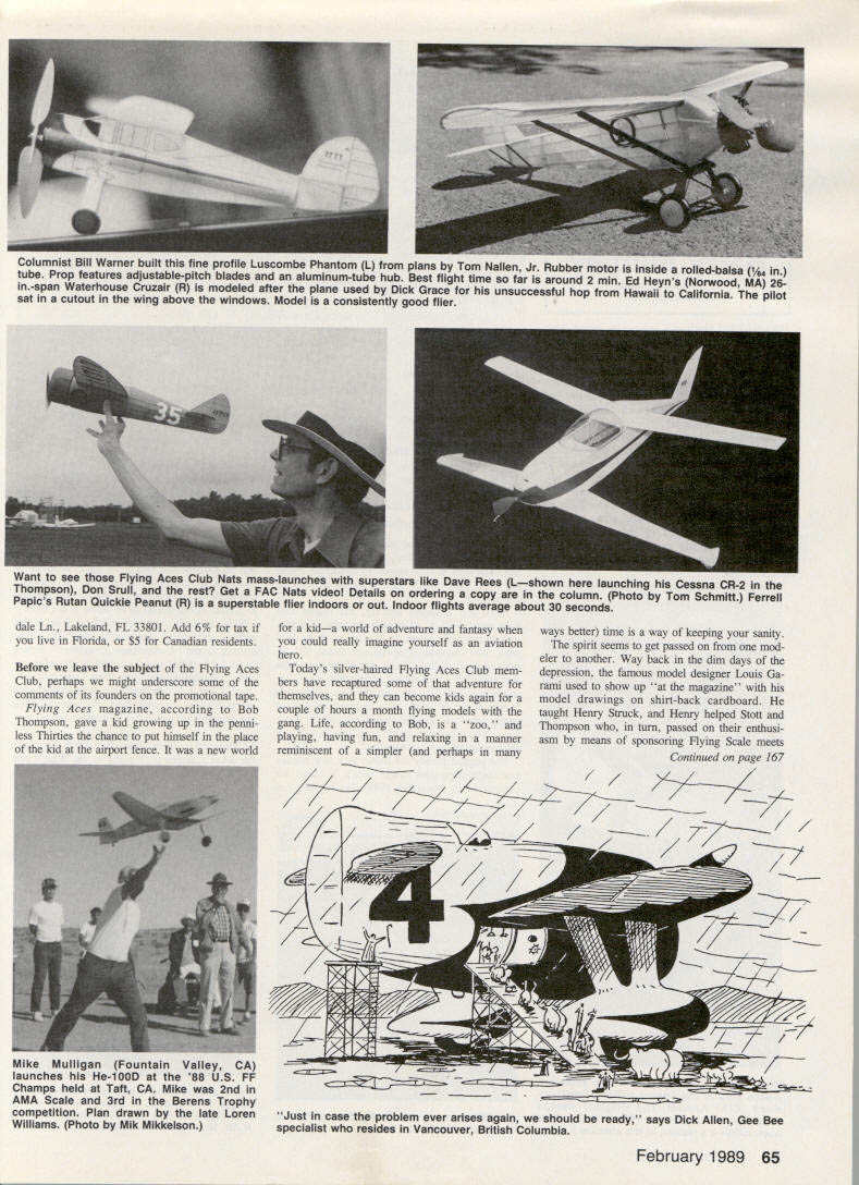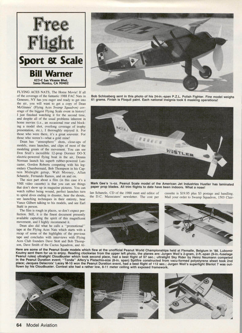 FLYING ACES NATS Home Movie coverage fantastic 1988 FAC Nats Geneseo NY has eager ready get air will want get copy Dean McGinnes Flying Aces Swamp Squadron cov erage biggest Hying Scale event history just finished watching second time despite usual problems inherent home movies ie occasional rear end block ing model shot overlong coverage trophy presentation etc thoroughly enjoyed its great souvenir werentwhat gold Dean has atmosphere shots close-ups models mass launches clips of modeling greats movement can see Don Srulls incredible 12-prop Dornier DO-X electric-powered flying boat air Dennis Norman launch superb rubber-powered Lan caster Gordon Roberts competing leg endaiy Chambermaid Bob Thompson Cap tain Midnight getup Walt Mooney Allan Schanzle Fernando Ramos on nice part about film case its VHS video cassette can see things dont show up magazine pictures can watch rubber being wound perfect launches turn spiral dives ending disaster hear shouts see launching techniques entirety hear Vance Gilbert talldng models see Earl Stahl person film rough places dont expect per fection Still finest document presently available capturing spirit magnificent movement highly recommend Dean also did what calls promotional tape Hying Aces Nats starts recap some highlights previous tape concludes interviews Flying Aces Club founders Dave Stott Bob Thomp son Dave Smith Cactus Squadron AlHere some Peanut Scale models flew unofficial Peanut World Championships held Flemalle Belgium 88 Lubomir Koutny sent us enloy Reading clockwise upper left photo planes Jurgen Weils 2-gram 2-ft-span 9-in.fuselage Peanut rules ultralight Cloudbuster took second place best flight 97 sec ultralight Sky Rider Heinz Neumann competed Peanut DuratIon event Tonda Alferys Pistachio-size 8-In spen Spiff ire constructed vacu-formed polystyrene sheet took 2nd place Jacques Delacroix Lacey M-10 won Peanut Duration event best flight 112 sec Jurgen Wails superlight Bieriot 7 outflown Cloudbuster Contest site rather low 8-11 meter ceiling exposed framework lan Schanzle CD 1988 meet editor DC Maxecuters newsletter cost per cassette $1995 plus $3 postage handling Mail order Swamp Squadron 1503 Clair 64 Model Aviation Free Flight Sport & Scale Bill Warner 423-C San Vicente Elyd Santa Monica CA 90402 Bob Schiosberg sent photo 24-in-span PZL Polish Fighter Fine model weighs 61 grams Finish Floquil paint national insignia took 6 masking operations Mark Gees 1A-oz Peanut Scale model American Jet industries Hustler has laminated paper prop blades trim flights date have indoors What nose Columnist Bill Warner built fine profile Luscombe Phantom L plans Tom Nallen Jr Rubber motor Inside rolled-balsa 1/M tube Prop features adjustable-pitch blades aluminum-tube hub Best flight time far around 2 mm Ed Heyns Norwood MA 26in-span Waterhouse Cruzair R modeled after plane used Dick Grace unsuccesaful hop Hawaii California pilot sat cutout wing above windowa Model consistently good flier Want see Flying Aces Club Nats mass-launches superstars like Dave Rees Lshown launching Cessna CR-2 Thompson Don Srull rest Get FAC Nats video Details ordering copy column Photo Tom Schmitt Ferrell Papics Rutan Quickie Peanut R superstable flier Indoors out indoor flights average about 30 seconds dale Ln Lakeland FL 33801 Add 6% tax live Florida $5 Canadian residents Before leave subject Flying Aces Club perhaps might underscore some comments its founders promotional tape Flying Aces magazine according Bob Thompson gave kid growing up penalless Thirties chance put himself place kid airport fence new world ways better time way keeping sanity spirit seems get passed mod eler another Way back dim days depression famous model designer Louis Ga rami used show up magazine model drawings shirt-back cardboard taught Henry Struck Henry helped Stott Thompson turn passed enthusi asm means sponsoring Flying Scale meets Continued page 167 kida world adventure fantasy could really imagine yourself aviation hero Todays silver-haired Flying Aces Club mem bers have recaptured some adventure themselves can become kids again couple hours month flying models gang Life according Bob zoo playing having fun relaxing manner reminiscent simpler perhaps // / / February 1989 65 / / / Mike Mulligan Fountain Valley CA launches He-lOOD 88 US FF Champs held Taft CA Mike 2nd AMA Scale 3rd Berens Trophy competition Plan drawn late Loran Williams Photo Mik Mikkelson Just case problem ever arises again should ready says Dick Allen Gee Bee specialist resides Vancouver British Columbia Advanced Transmitter Capabilities Low Cost ATRCSTM Stores Four Aircraft Setups Includes Seven Different Servo Configurations Individual Surface Travel Limits Centering Single Switch Presets Launch Speed Modes Full Trailing Edge Control Enhanced Mixing Functions Crow Landing Capability Fully installed kit Control Systems 238 5 Hillview Dr Milpitas CA 95035 408 946-4142 Air mnimlM Module 75pTM registered trademarks Airironics Inc A-tracks Works with standard FM/PPM Receivers Airtronics PCM Receivers Convertsthe Module advanced computerized control system Advanced Technology Radio Control System See downwind instance w-a-a-a-y downwind FF Scale/Warner Continued page 65 passing out copies famous Flying Aces Club newsletter fliers attended Bridgeport-based twice-yearly meets Connec ticut Stott Thompson later began sending out copies newsletter key people model ing help propagate back real model ing brand laid-back modeling caught Since its beginnings early Sixties FAC has gone international Peanut Scale largely clubs invention now standard event countries England France Bel gium Czechoslovakia name few Dave Stott restates what may rea sons popularity Flying Aces move ment its emphasis Rubber Scale nonserious competition cites case Ken Groves heavily Mulvihill Wakefield Rubber competition Ken said him self way back third max flight contest Im working too hard So went Rubber Scale about sums up excites us play work presentiy numbe