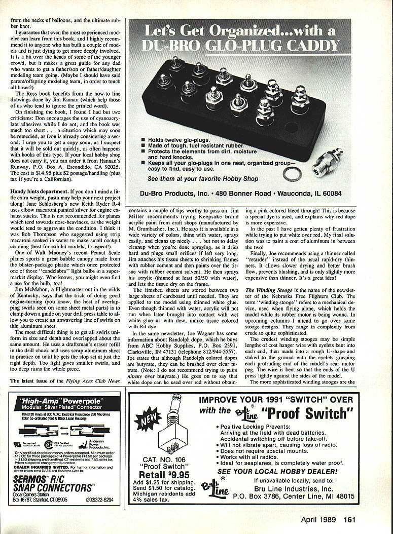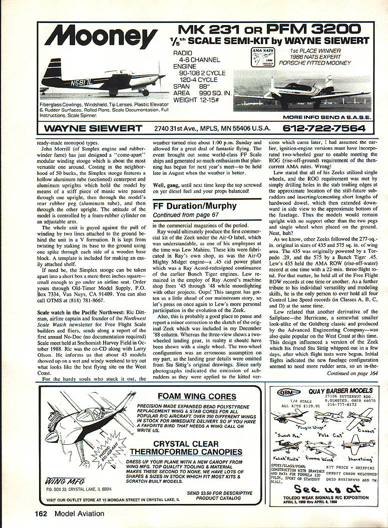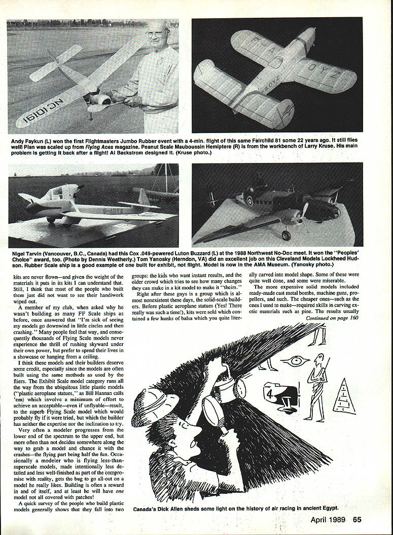 ONE favorite quotes time came Hang Gliding newsletter published early days sport advised Never fly higher willing fall have always felt sentiment partic ularly applicable FF Scale models just never should put work model willing see wiped out crash models started out Flying Scale never made flying part game because owners citing such things overweight model too much wind lack tall grass other reasons declined validate models claim full membership class Most modelers hate repair Scale ships especially have Simplex winding sooge L lets wind rubber-powered model assistance Sponge rubber cylinder helps support model piece music wire through pair uprights through planes hollow rubber peg retains model Units sale Solid balsa Scale kit R Pioneer Modeicraft Co 40 years ago featured punch-out die-cut templates aid carving fuselage wing profiles Wing span about 9 Vep way before era plastics can remember good old days 64 Model Aviation Free Flight Sport & Scale Bill Warner 423-C San Vlcente Blvd Santa Monica CA 90402 Vickers Mk Ill Vildebeest Ken Hamilton modified FF Scale nonflying Scale express purpose conserving model Ken researched plane 50 years before building Wingspan 3675 Look external details Oakland Cloud Dusters member Red Persons Cloverdale CA brought fine FW 190 A3 88 US FF Champs Rubber-powered ship has symmetrical airfoil wing plug-in landing gear Wing mounts via music-wire stubs bend bit flight extra dihedral Jane Schlosberg used elbow macaroni fornice airbrushed paint jobs complicated mark-A leading US kit manufacturer estimates exhaust stacks Ryder R-4 Neatings Some guys just hang onto models due85% models made its Flying Scale lack confidence own abilities trick its bit heavirmake fly mishap Andy Faykun L won first Fiightmasters Jumbo Rubber event 4-mm flight same Fairchild 81 some 22 years ago still f lies well Plan scaled up Flying Aces magazine Peanut Scale Mauboussin Hemiptere R workbench Larry Kruse main problem gettIng back after flight Al Backstrom designed Kruse photo Nigel Tarvin Vancouver BC Canada Cox 049-powered Luton Buzzard L 1988 Northwest No-Doc meet won Peoples Choice award too Photo Dennis Weatherly Tom Yanosky Herndon VA did excellent job Cleveland Models Lockheed Hud son Rubber Scale ship good example built exhibit flight Model now AMA Museum Yanosky photo kits never flownand given weight materials puts its kits can understand Still think people built just did want see handiwork wiped out member club asked wasnt building FF Scale ships before once answered Im sick seeing models go downwind little circles crashing people feel way conse quently thousands Flying Scale models never experience thrill rushing skyward under own power prefer spend lives showcase hanging ceiling think models builders deserve some credit especially since models often built using same methods used fliers Exhibit Scale model category runs way ubiquitous little plastic models plastic aeroplane statues Bill Hannan calls em involve minimum effort achieve acceptableeven unflyableresult superb Flying Scale model would probably fly tried builder has neither expertise nor inclination try Very often modeler progresses lower end spectrwn upper end often decides somewhere along way grab model chance crashesthe flying part being half fun Occa sionally modeler flying less-than superscale models made intentionally less de tailed less well-finished part compro mise reality gets bug go all-out model really likes Building often reward itself least will have model covered patches quick survey people build plastic models generally shows fall two groups kids want instant results older crowd tries see changes can make kit model make Right after guys group al nonexistent days solid-scale build ers Before plastic aeroplane statues Yes really such time kits sold con tained few hunks balsa quite literally carved model shape Some quite well done some miserable expensive solid models included ready-made cast metal bombs machine guns pro pellers such cheaper onessuch ones used makerequired skills carving ex otic materials such pine results usually Continued page 160 Canadas Dick Allen shads some light history air racing ancient Egypt April 1989 65 TRAINERFOAMAIREMONARCH SPAN A 095 SPAN AN EIGHT 19-22 lbs 3CHi~WEIGHT 65-75 lbs $O95WEIGHT 19-22 lbs $fA 95 POWER 0 cc$1A95 POWER 0J1POWER 0 ccUJI 3 4 CHANNEL4CH FOUR CHANNELFOUR CHANNEL CALL OR WRITE FOR FREE INFORT 1 NEODESHA KS 66757 ON SAC KITS AND QUADRA PRICES 325-2821 FREE SHIPPING ON KIT ORDERVISA MASTERCARD ACCEPTED over fuselage flight surface lead ing trailing edges piece wornout fine sandpaper Registration race numbers well control surface panel outlines includ ing canopy trim cut tissue trim easy apply using Spra-Mount 3M product An advantage spray ad hesive permits easy repositioning tissue trim after initial placement required Consider covering cockpit opening under canopy black tissue light construction paper prevent rub ber lube spatter looks like sick pilot nest ce pas thin celluloid overhead Use sandpaper sharp knife blade trim fit finished wing saddle fuselage proper certain wing fixed place incidence angle per plan perfectly trued up stabilizer slides section tempo rarily left uncovered open rear fuselage arrangement allows shim ming stab achieve desired glide trim Ready assembled airplane less prop rubber glide tests Add clay nose block bring balance point model indicated plan Hand launch model few times shim stabilizer add remove small increments clay needed optimize glide Note balance point Install prop rubber Wind rub ber motor until lightly tensioned pin prop prevent rotation Using bits lead clay tucked away securely inside nose rebalance model point noted HAS MOVED INTO LARGER QUARTERS 21658 Cloud Way Hayward CA 94545 CAL 415 783-4868 Out CAL 800 482-8663 during glide test Flying R-4 likes fly turning leftward Circle diameter touched up tweaks left rudder and/or small amounts side thrust downthrust required Make adjustments time per flight avoid 