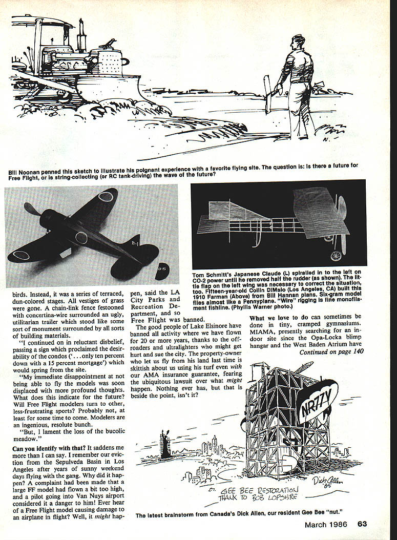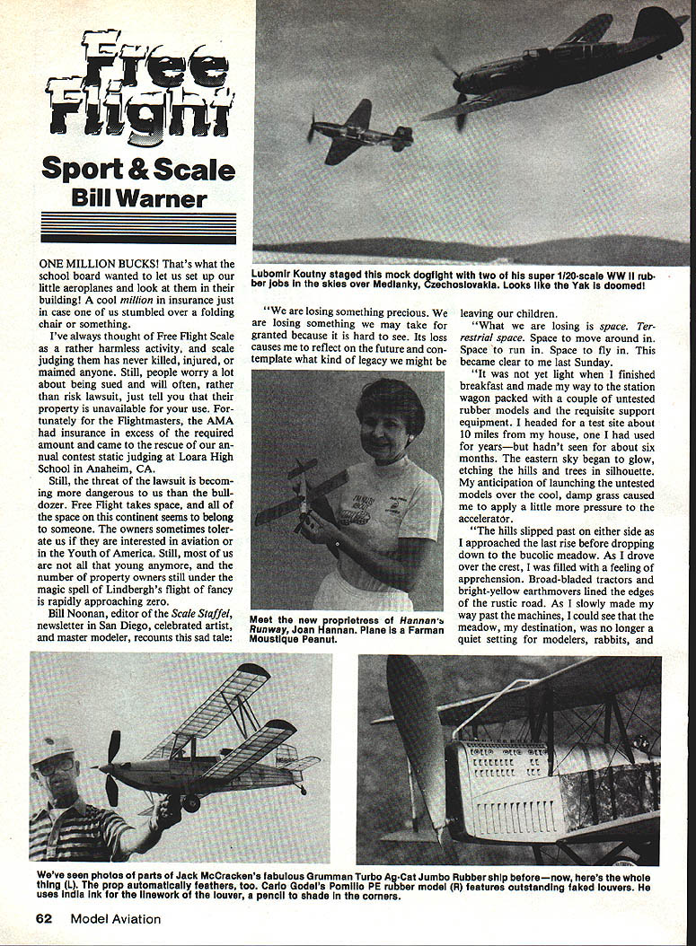 Hre Sport & Scale Bill Warner ONE MILLION BUCKS Thats what school board wanted let us set up little aeroplanes look building cool million insurance just case us stumbled over folding chair something Ive always thought Free Flight Scale rather harmless activity scale judging has never killed injured maimed anyone Still people worry lot about being sued will often rather risk lawsuit just tell property unavailable use tunately Flightmasters AMA insurance excess required amount came rescue nual contest static judging Loara High School Anaheim CA Still threat lawsuit becom ing dangerous us bull dozer Free Flight takes space space continent seems belong someone owners sometimes toler ate us interested aviation Youth America Still us young anymore number property owners still under magic spell Lindberghs flight fancy rapidly approaching zero Bill Noonan editor Scale Staffel newsletter San Diego celebrated artist master modeler recounts sad tale losing something precious losing something may take granted because hard see Its loss causes reflect future con template what kind legacy might leaving children What losing space Ter restrial space Space move around Space run Space fly became clear last Sunday yet light finished breakfast made way station wagon packed couple untested rubber models requisite support equipment headed test site about 10 miles house used yearsbut hadnt seen about six months eastern sky began glow etching hills trees silhouette anticipation launching untested models over cool damp grass caused apply little pressure acceleraWr hills slipped past either side approached last rise before dropping down bucolic meadow As drove over crest filled feeling apprehension Broad-bladed tractors bright-yellow earthmovers lined edges rustic road As slowly made way past machines could see meadow destination no longer quiet setting modelers rabbits Weve seen photos parts Jack McCrackens fabulous Grumman Turbo AgCat Jumbo Rubber ship beforenow heres whole thIng 1 prop automatIcally feathers too Carlo Godels Pomlilo PE rubber model R features outstanding faked louvers uses India ink ilnework louver pencil shade corners 62 Model Aviation Lubomir Koutny staged mock fight two super 1120-scale WW II rub ber jobs skies over Medlanky Czechoslovakia Looks like Yak doomed Meet new proprietress Hannanb Runway Joan Hannan Plane Farman Moustique Peanut Bill Noonan penned sketch Iliustrate poignant experience favorite flying site question is future Free Fiight stringcoiiecting RC tankdriving wave future birds Instead series terraced dun-colored stages vestiges grass gone chain-link fence festooned concertina-wire surrounded ugly utilitarian trailer stood like some sort monument surrounded sorts building materials continued reluctant disbelief passing sign proclaimed desir ability condos .. ten percent down 15 percent mortgage would spring site immediate disappointment being able fly models soon displaced profound thoughts What does indicate future Will Free Flight modelers turn other less-frustrating sports Probably least some time come Modelers ingenious resolute bunch lament loss bucolic meadow Can identify saddens can say remember evic tion Sepulveda Basin Los Angeles after years sunny weekend days flying gang did hap pen complaint made large FF model flown bit too high pilot going Van Nuys airport considered danger him Ever hear Free Flight model causing damage airplane flight Well might happen said LA City Parks Recreation De partment Free Flight banned good people Lake Elsinore have banned activity have flown 20 years thanks off roaders ultralighters might get hurt sue city property-owner let us fly land last time skittish about us using turf AMA insurance guarantee fearing ubiquitous lawsuit over what might happen Nothing ever has beside point isnt What love can sometimes done tiny cramped gymnasiums MIAMA presently searching door site since Opa-Locka blimp hangar West Baden Atrium have Continued page 140 5 E5TATiOJ latest brainstorm Canadas Dick Allen resident Gee Bee nut March 1986 63 Tom Schmitts Japanese Claude L spiralied left CO2 power untli removed haif rudder shown ut tie flap left wing necessary correct situation too Fifteenyearoid Collin DiMalo Los Angeles CA built 1910 Farman Above Bill Hannan plans Slxgram model files almost like Pennypiane Wire rigging fine monoflia ment fishline Phyllis Warner photo Bell 47 became worlds first helicopter certified commercial opera tion Forty years 23 variants 30 user countries later Bell 47 still going strong Approximately 6000 machines built Merced saw large gas-powered Bell 47 Hirobo fly outstanding being very prototypical mannerisms like large moth flying about Helicopter Other models 47 available excellent Morley 40-size Graup ner 21-size have seen Morley fly also good Until next time good luck keep trying nothing satisfying overcoming difficult problem BCNU Larry Jolly 5501 W Como Santa Ana CA 92703 RC Pylon Racing/Hager Continued page 55 cut out Fred finished second Beginning fifth heat Bruce Fred Rick Oliver tied point down followed Dub two points down Rick Thumbs Oliver nosed over racing Ed posted fourth sub-120 time Dub Norm headed out next what promised best day Six hard laps followed lead changing hands least six times Neither gave wanting lose sec ond meeting year Suddenly Norms engine blew forced him land prop freewheeling Dub got fast time 116thanks Norm meantime Phill Bussell Gary Heithold met another exciting races Both broke 120 Gary winning nose race ended ties first secondBruce against Fred Ed Rankin versus Gary Heithold fourth fifth Bruce Fred flying Jerry Smalls Shoestrings raced neck neck eight laps before Fred kissed ground pylon three Dub calling Bruce got excited called Bruce down lap nine Bruce dead-stick lap 10 landing about 500 feet long Bruce slightly upset race marked debut en masse Jerrys Shoestring flying say fly great know fast build about eight hours Jerry built Dick Ritch looked like million dollars other excitement B