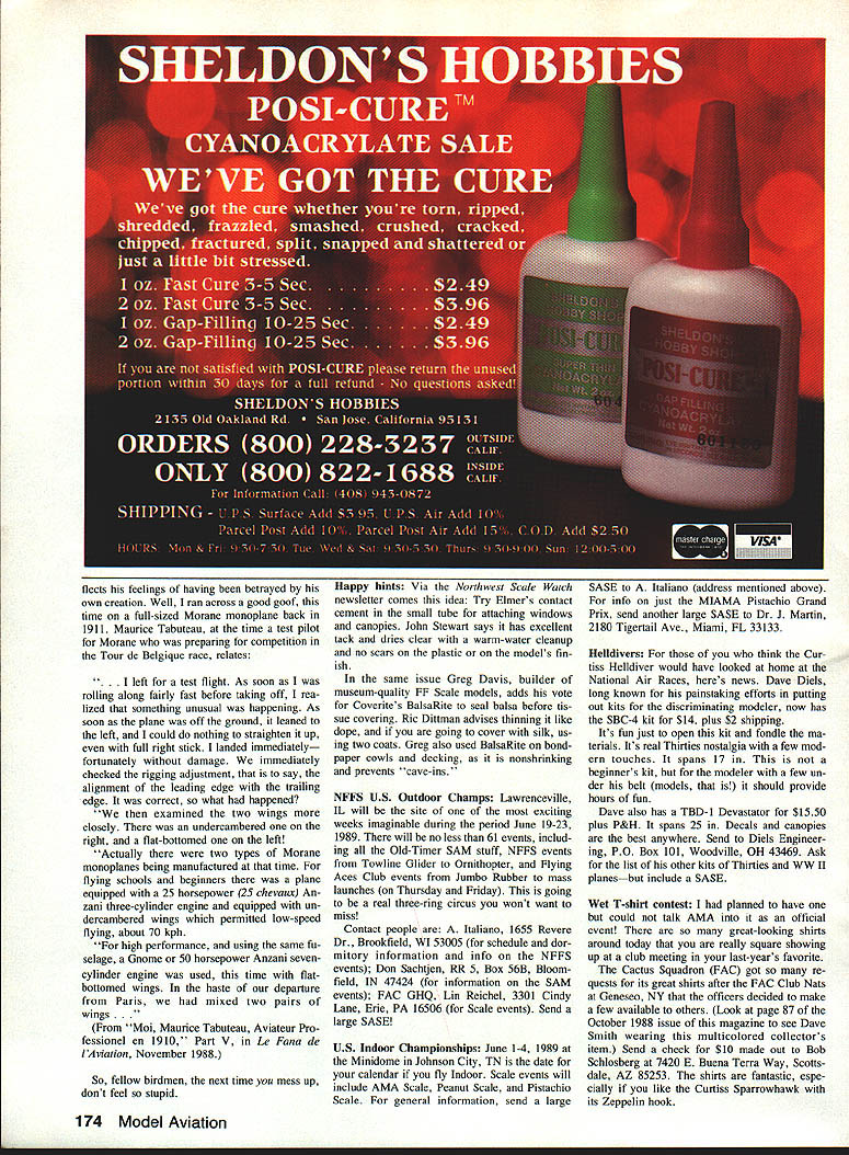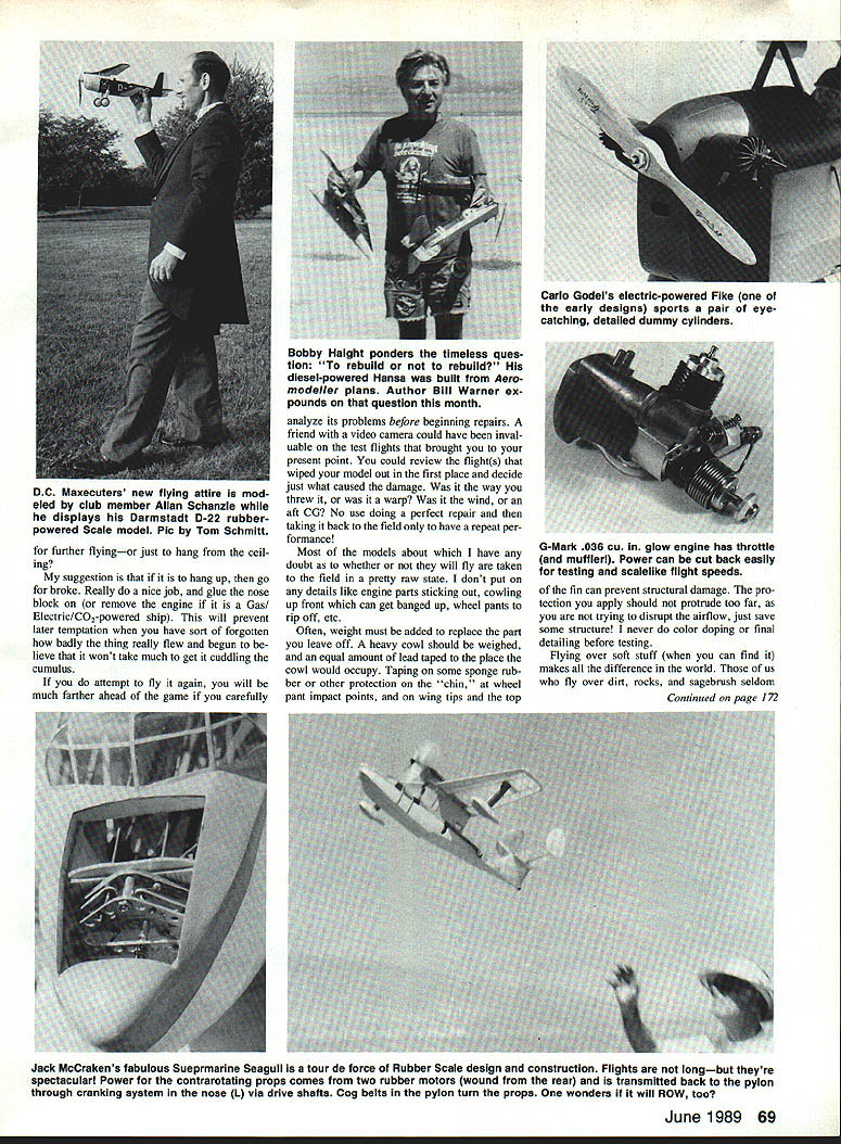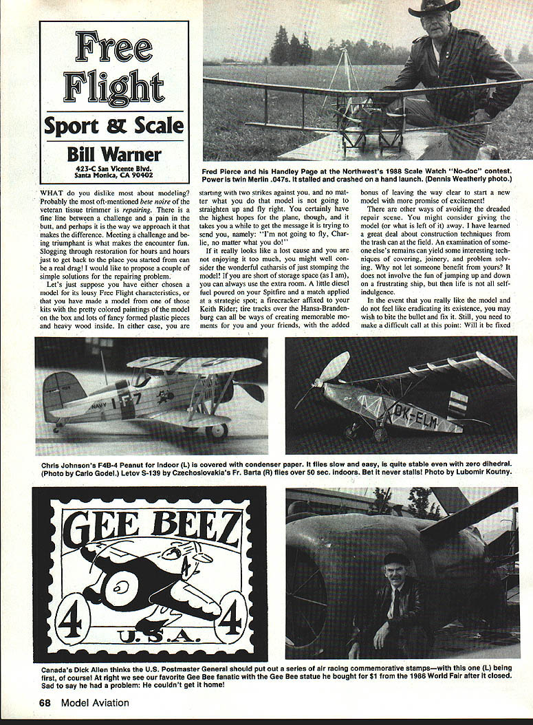 WHAT dislike about modeling Probably oft-mentioned bete noire veteran tissue trimmer repairing fine line between challenge pain butt perhaps way approach makes difference Meeting challenge ing triumphant what makes encounter fun Slogging through restoration hours hours just get back place started can real drag would like propose couple simple solutions repairing problem Lets just suppose have either chosen model its lousy Free Flight characteristics have made model kits pretty colored paintings model box lots fancy formed plastic pieces heavy wood inside either case starting two strikes against no mat ter what model going straighten up fly right certainly have highest hopes plane though takes get message trying send namely Im going fly Char lie no matter what really looks like lost cause enjoying too much might well con sider wonderful catharsis just stomping model short storage space am can always use extra room little diesel fuel poured Spitfire match applied strategic spot firecracker affixed Keith Rider tire tracks over Hansa-Branden burg can ways creating memorable mo ments friends added bonus leaving way clear start new model promise excitement other ways avoiding dreaded repair scene might consider giving model what left away have learned great deal about construction techniques trash can field An examination some elses remains can yield some interesting tech niques covering joinery problem solv ing let someone benefit yours does involve fun jumping up down frustrating ship life selfindulgence event really like model feel like eradicating its existence may wish bite bullet fix Still need make difficult call point Will fixed Chris Johnsons F4B-4 Peanut Indoor L covered condenser paper f lies slow easy quite stable zero dihedral Photo Carlo Godel Letov 5-139 Czechoslovakias Fr Bails R flies over 5Osec indoors Bet never stalls Photo Lubomir Koutny Canadas UicK Allen minks US Postmaster General should put out series air racing commemorative stampswith L being first course right see favorite Gee Bee fanatic Gee Bee statue bought $1 1986 World Fair after closed Sad say problem couldnt get home 68 Model Aviation Free Flight Sport & Scale Bill Warner 423-C San Vicente Blvd Santa Monica CA 90402 Fred Pierce Handley Page Northwests 1988 Scale Watch No-doc contest Power twin Merlin 047s stalled crashed hand launch Dennis Weatherly photo DC Maxecuters new flying attire mod eled club member Allan Schanzle displays Darmstadt D-22 rubberpowered Scale model Plc Tom Schmitt further flyingor just hang ceil ing suggestion hang up go broke Really nice job glue nose block remove engine Gas/ Electric/C02-powered ship will prevent later temptation have sort forgotten badly thing really flew begun lieve wont take much get cuddling cumulus attempt fly again will much farther ahead game carefully Bobby Halght ponders timeless ques tion rebuild rebuild diesel-powered Hansa built Aero modeller plans Author Bill Warner ex pounds question month analyze its problems before beginning repairs friend video camera could have inval uable test flights brought present point could review flights wiped model out first place decide just what caused damage way threw warp wind aft CG No use doing perfect repair taking back field have repeat per formance Most models about have doubt whether will fly taken field pretty raw state dont put details like engine parts sticking out cowling up front can get banged up wheel pants rip off etc Often weight must added replace part leave off heavy cowl should weighed equal amount lead taped place cowl would occupy Taping some sponge rub ber other protection chin wheel pant impact points wing tips top G-Mark 036 cu glow engine has throttle muffler Power can cut back easily testing scalelike flight speeds fin can prevent structural damage pro tection apply should protrude too far trying disrupt airflow just save some structure never color doping final detailing before testing Flying over soft stuff can find makes difference world us fly over dirt rocks sagebrush seldom Jack McCrakens fabulous Sueprmarine Seagull tour de force Rubber Scale design construction Flights longbut theyre spectacular Power contrarotating props comes two rubber motors wound rear transmitted back pylon through cranking system nose 1 via drive shafts Cog belts pylon turn props wonders will ROW too June 1989 69 Carlo Godels electric-powered Fike early designs sports pair eyecatching detailed dummy cylinders Continued page 172 Get STICKS. Fly RIGHT! 4 Primary Flight Training Program Videoc Teaches basic flight control safety Demonstrates training procedures flight lessons Explains frequency control field rules Utilizes Ground School Flight training Text Beginners Guide Radio Control Sport Flying Douglas R Pratt Tab Books Inc Includes information Academy Model Aeronautics STRUCTURE YOUR LEARNING PROCESS FROM PURCHASE TO LANDING AVOID PREMATURE CRASHES AND UNNECESSARY EXPENSES LEARN PROPER SAFETY AND CONTROL MAKE LEARNING TO FLY EASY VASTLY INCREASE YOUR CHANCES OF SUCCESS GREAT FOR CLUB INSTRUC TORS & HOBBY SHOP OWNERS,s - HEM ANY WAY w{o n]g~ BETTER PERFORMANCE NYROD THE ORIGINAL QtbQr PUSH ROD COMPLETE WITH ALL REQUIRED METAL ______________________________________ FITTINGS IDEALLY SUITED FOR ANY PUSH ROD ACTIONj RO\ RUDDERS ELEVATORS AILERONS THROTTLE sr CONTROL BOATS SEA PLANES. YOUR IMAGINATION 34 LONG ASSEMBLED LENGTH at NYROD SU-PR-LINE PROCUCTS INC 18800 State Route 47 E Sidney ONo 45365 PI 5134804721 HARDWARE INCLUDED 14 NYRODapter 18 Rod 2-56 Threaded end problem model simply drills out shall duck Out gig before make misteaks So See ya downwind USOC FF Scale/Warner Continued page 69 have luxury undamaged models after days flying Checking model carefully before flying can definitely help avoid repairs Find steam out wing warps Add little extra weight nose forward CG means greater stability Make sure nose block Rubber model snug going bounce around giving new thrust angle other second Tack glue things together c