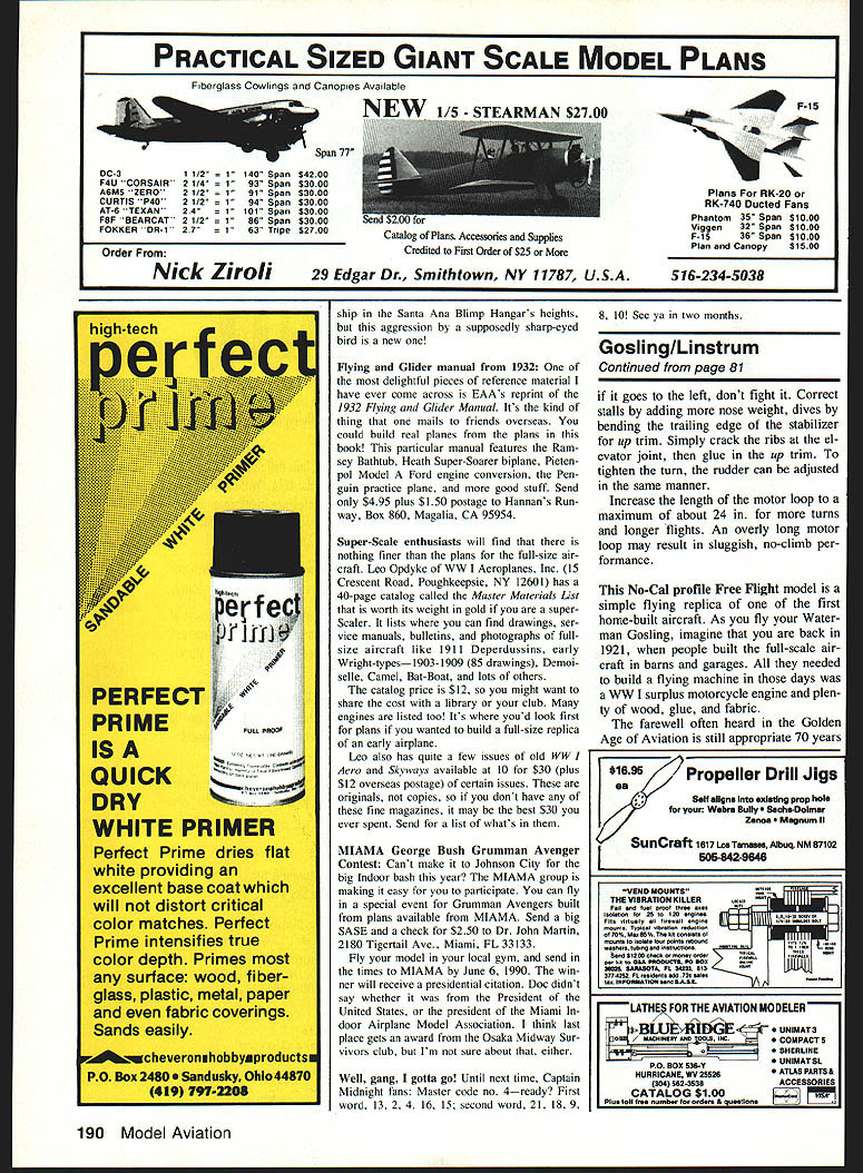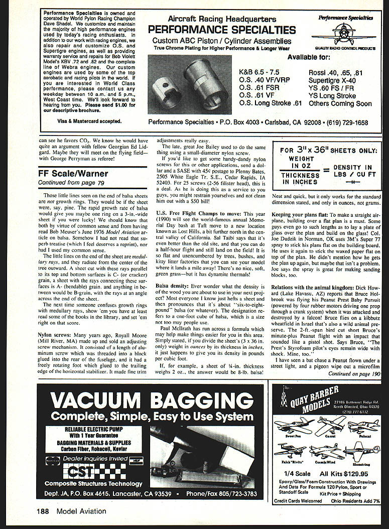 SPRING springs Modelers always seem need springs size need neverseems readily available Springs variety things hold down batch covers cushion landings imitate valve springs dummy en gines center castering tail wheels dozens other useful things Today lets try making some own special custom installations Most aware types springs two common types tension compression tension spring pulls things apart could used keep cowling pulled down tight compres sion spring squeezes things together often used landing gear struts usually conjunction two nesting sizes tubing sliding leg Both types easy make little practice chine shop used watch springs being wound lathe Wire simply wound onto round bar gripped lathe chuck fed onto slowly turning bar hand guide hole enabled put less ten sion wire wound varying angle fed wire hole con trolling amount binding went through guide attached carriage moved along rate giving desired coil spac ing slow movement wound coils against another tension spring faster move ment spaced farther apart hard pull wire feeding would give spring conformed exactly diameter shaft winding lesser pull would allow open up little make eas Left Paul Straniks Peanut HE-114 winner July Indoor meet Brno Czechoslovakia Plane flew 142 seconds Koutny photo Right Pres Brunings 30-in-span rubber-powered Breguet 693 features contrarotating props Model won Michigan State meet 108 Bruning photo 78 Model Aviation Free Flight Sport & Scale Bill Warner 1370 Monache Ave Porterville CA 93257 Antonin Alferys polystyrene SM-75 Czech airliner Wing nacelles have exit holes motor Rubber attached top fuselage see hooks near OK-BAD fuselage Photo Koutny young nipper working maLeft Royall Moores tail adjuster features lightweight screw adjust angle horizontal stab Plenny Bates good source screws Right Richard Mora uses soft plastic triangles pencils available stationery stores keep X-Acto knives puts Any has ever roll off onto lap will appreciate hint immeasurably Richard should win Congressional Medal Honor O~AflREEI4 cRAMK AW %IAr IN 4P Above P82 Rubber ship Paul Strenick heads out twilight reconnaissance mis sion Below 1A0-scale WW II models Czechoslovakian favorite Photos Koutny CLAMP W4 MPEREE PUS SURF SEIWIEN T* 5OARS IN VI5E WITh WE SPRING WIRE YOU A5 USIIW mrsp w-n4 sior PWlMG oi7rf c4gpuwoN sigiwa FOWM MOWS WinE iaEPLE-A1OSA hI\ 1Fot-5 icr get off mandret tin ished takes little getting used have made springs years hy simply hand winding guitar strings made thin music wire 015 works well around nails various di ameters Just clamp end wire nail vise-grip pliers wrap wire tightly round round keeping angle feed ever slightly behind actual wind keep coils tightly together its fin ished bending hook end needlenosed pliers will make tension spring grasping end stretching until takes set makes compression spring closer together coils larger diameter spring softer action given diameter wire Small-diameter coil springs wide coil spacings can get pretty stiff use sliding landing gear olco struts can make own special springs give progressively stiffer action Starting spring fairly close coil spacings getting farther apart toward other end will give nice Simple springmaker Jean Champenois inventor originally printed 1979 Frances MRA soft action wheel hits ground get ting stiffer leg shortens up harder land ings Try buying spring like market few years ago French magazine called Le Modele Reduit dAvion nice little winder Mr Jean Chempenois can make spring winding little easier simply crank slot end wire hacksawed long end Clamp crank between two wooden blocks vise making sure slot vertical feed end wire through slot turn crank angle feed wire onto shaft tension hold give control might want experiment using softer wire starters go music wire working springs Softer wire okay use tiny valve springs Peanut Scale engines caution Allow crank pro trude side start cranking spring starts forming makes thread shaft screws itself right along like bolt really works can make springs no time flat Correction Winston Churchill reported have once remarked effect time went library amazed num ber books read Doe Plenny Bates up Cedar Rapids IA caught repeating popular incorrect folk truth about A-grain C-grain balsa would like set straight might similar state con fusion about Continued page 188 13 peers intently Otto inal sub-Peanut Bristol Prier attenoing Revere JHS Indoor Meet us Rngeles Believe Doug flies Dick Allen lost Gee-Bee Z model flying near Vancouver Zoo Can anyone find May 1990 79 Performance Specialties owned operated World Pylon Racing Champion Dave Shadel customize maintain majority high performance engines used todays racing enthusiasts addition work racing engines also repair customize OS Supertigre engines well providing warranty service repairs Bob Violett Models KBV 72 82 complete line Webra engines custom engines used some top aerobatic radng pilots world interested World Class performance please contact us weekday between 10 am 5 pm West Coast time Well look forward hearing Please send $100 descriptive brochure Visa & Msstercard accepted Aircraft Racing Headquarters PERFORMANCE SPECIALliES Custom ABC Piston / Cylinder Assemblies True Chrome Plating Higher Performance Longer Wear hrjbiwaueSpecEaII*a QUAJJW RADIO OON1L eIEU Available K&B 65 75 OS 40 VFNRP 05 61 FSR 05 61 VF 05 Long Stroke 61 Rossi 40 65 81 Supertigre X-40 YS 60 FS/FR YS Long Stroke Others Coming Soon Performance Specialties PO Box 4003 Carlsbad CA 92008 619 729-1658 can see favors CO2 know would have quite argument fellow Georgian Ed Lid gard Maybe wilt meet flying field George Perryman referee FF Scale/Warner Continued page 79 little lines seen end balsa sheets no growth rings would sheet say pine rapid growth rate balsa would give maybe ring 3-in-wide sheet lucky should know both virtue common sense having read Bob Meusers June 1976 Model Aviation ar ticle balsa Somehow t read su perb treatise feel deserves reprint nor used common sense little line