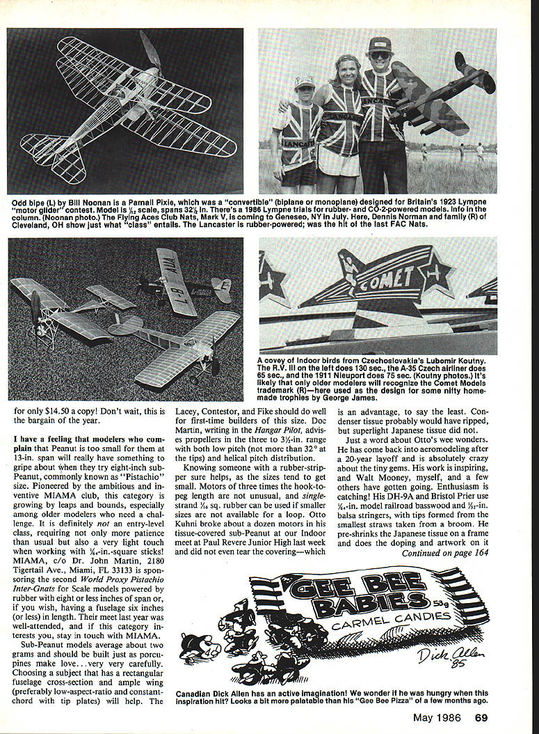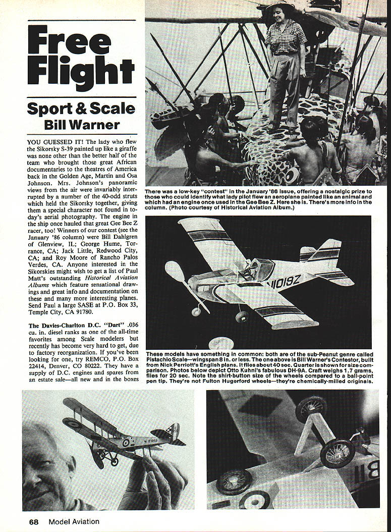 Free Flight Sport & Scale Bill Warner YOU GUESSED IT lady flew Sikorsky S-39 painted up like giraffe other better half team brought great African documentaries theatres America back Golden Age Martin Osa Johnson Mrs Johnsons panoramic views air invariably inter rupted number 40-odd struts held Sikorsky together giving special character found days aerial photography engine ship once hauled great Gee Bee Z racer too Winners contest see January 86 column Bill Dahigren Glenview IL George Hume Tor rance CA Jack Little Redwood City CA Roy Moore Rancho Palos Verdes CA Anyone interested Sikorskies might wish get list Paul Matts outstanding Historical Aviation Albums feature sensational draw ings great info documentation interesting planes Send Paul large SASE PO Box 33 Temple City CA 91780 Davies-Chariton DC Dart 036 cu diesel ranks all-time favorites among Scale modelers recently has become very hard get due factory reorganization youve looking try REMCO PO Box 22414 Denver CO 80222 have supply DC engines spares estate saleall new boxes 68 Model Aviation low-key contest January56 Issue offering nostalgic prl7e could identify what lady pilot flew aeroplane painted like animal engine once used Gee Bee Z Theres info column Photo courtesy Historical Aviation Album models have something common both sub-Peanut genre called Pistaohio Scalewingspan 8 less above Bill Warners Contestor built Nick Perriotts English plans flies about 40 sec Quarter shown size com parison Photos below depict Otto Kuhnls fabulous DH-9A Craft weighs 17 grams flies 20 sec Note shirt-button size wheels compared ball-point pen tip Theyre Fulton Hugerford wheelstheyre chemically-mIlled originals Odd bipe 1 Bill Noonan Parnall Pixie convertible biplane monoplane designed Britains 1923 Lympne motor glider contest Model A2 scale spans 321/2 Theres 1986 Lympne trials rubber- C02-powered models Info column Noonan photo Flying Aces Club Nats Mark V coming Geneseo NY July Dennis Norman family R Cleveland OH show just what class entails Lancaster rubber-powered hit last FAC Nats have feeling modelers com plain Peanut too small 13-in span will really have something gripe about try eight-inch subPeanut commonly known Pistachio size Pioneered ambitious ventive MIAMA club category growing leaps bounds especially among older modelers need chal lenge definitely entry-level class requiring patience usual also very light touch working A4-in-square sticks MIAMA Dr John Martin 2180 Tigertail Ave Miami FL 33133 spon soring second World Proxy Pistachio Inter-Gnats Scale models powered rubber eight less inches span wish having fuselage six inches less length meet last year well-attended category terests stay touch MIAMA Sub-Peanut models average about two grams should built just porcu pines make love. very very carefully Choosing subject has rectangular fuselage cross-section ample wing preferably low-aspect-ratio constantchord tip plates will help Lacey Contestor Fike should well first-time builders size Doc Martin writing Hangar Pilot advis es propellers three 3%-in range both low pitch 320 tips helical pitch distribution Knowing someone rubber-strip per sure helps sizes tend get small Motors three times hook-topeg length unusual sin gle strand sq rubber can used smaller sizes available loop Otto Kuhni broke about dozen motors tissue-covered sub-Peanut Indoor meet Paul Revere Junior High last week did tear coveringwhich advantage say least Con denser tissue probably would have ripped superlight Japanese tissue did Just word about Ottos wee wonders has come back aeromodeling after 20-year layoff absolutely crazy about tiny gems work inspiring Walt Mooney myself few others have gotten going Enthusiasm catching DH-9A Bristol Prier use 1A-in model railroad basswood A-in balsa stringers tips formed smallest straws taken broom pre-shrinks Japanese tissue frame does doping artwork Continued page 164 Canadian Dick Allen has active Imagination wonder ho hungry inspiration hit Looks bit palatable Gee Bee Pizza few months ago May1986 69 $1450 copy Dont walt bargain year covey Indoor birds Czechoslovakias Lubomir Koutny RV Ill left does 130 sec A-35 Czech airliner does 65sec 1911 Nleuport does 75 soc Koutny photos Its likely older modelers will recognize Comet Models trademark Rhere used design some nifty home made trophies George James 1/5 SCALE 4/STROKE ENGINES WACO H KS- 74812 4/Str Eng Great Lakes Trainer 6490 4/Str Eng Great Lakes Special 64 90 r Eng Plans $25 FG Cowls $23 EconoPac $45 ALSOALSOALSO 1/4 GIANT SCALE FOR BIG ENGINES WACO H KS 9975 24 40 Eng Great Lakes Special 80 20 ng Great Lakes Trainer 8020 Eng Plans $27 F G Cowls $25 FG Pants $25 Econo Pac $70except Trainer $49 MOREMOREMORE FarITlan Moustque 1/4 Scale 80/40 4 Str NEWNEWNEW 2 ANTIQUE R/C MODELS Bill Winters Rookie 72 40 60/4 Str DeBolts Live Wire Trainer 25% 60 Span 21 40 4/Str Eng Plans e three 0 Orders P P CONT USA NYS Res 8% Tax Large SASE Brochure NORM ROSENSTOCK 94 Cedar Dr Plainview NY 11803 HOV Horn Timer 2k ftom LARZO5 8 tAO MODEL j140dL A~trt RECORD BREAKER 1941 BROOKLYN DODGER 56 Cabin EWEST* Retell $52 95R*INTRODUCTORY PRICE* $3900 1938 Record Breaker 96 $69 56 1939 Zipper 54$53 56 1938 Kloud King 63 $62 36 1941 Brigidier 56 $4076 1941 Super Quaker 78 $7276 1940 So Long 58$3836 1936 Buccaneer 84 $5996 1938 Clipper MKI 72$4156 1937 Dallaire 188 $75 16 1935 Miss America 84$7196 1941 Playboy Sr 80 $5116 1941 Playboy Jr 54 $3116 1938 Powerhouse 84 $5356 1948 Sailplane 78 $8476 1938 Trenton Terror 72 $4076 1940 Ranger 46$3196 1939 Korda Wake 44 $1916 1939 Mercury 72 6 kits qualify $AM events FE & R/C feature highest quality machine cut & sanded parts Superior Competition sheet strip wood wire & window material Plans orig EF models easily convertible 3ch RIG KITS Sailpianes Electric power Gas Hobby Horn SENSOAR Glider 78 $1888 Midway Model GNOME R/C Hand Launch GliderS2488 Jolly Models FLINGER RIC HLG 58 Span $2408 Midway Model PAST EDDIE Acrobatic /85 Elec$198t Jolly Models ELECTRIC
