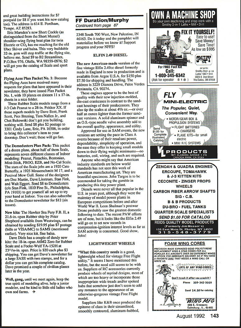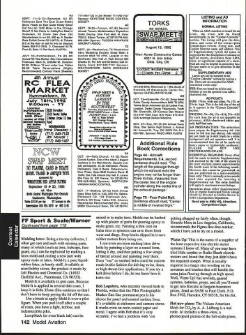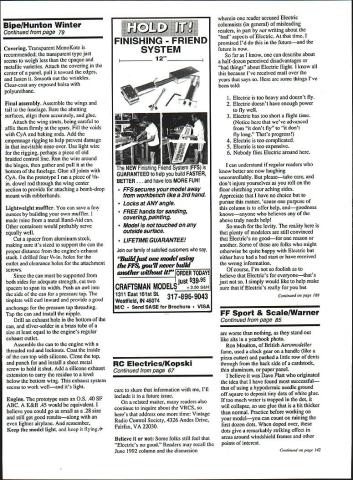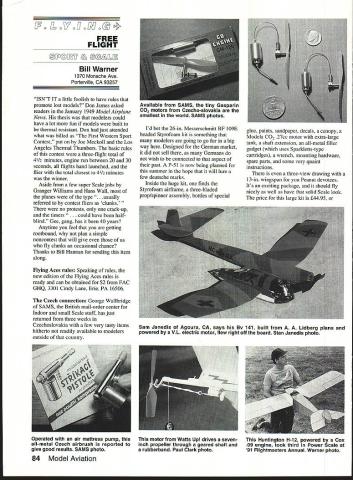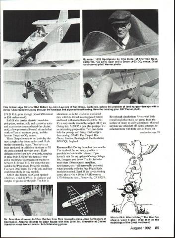 o LLwOgO&x FLIGHT Warner 1370 Monache Ave Porterville CA 93257 ISNT IT little foolish have rules promote lost models Don James asked readers January 1949 Model Airplane News thesis modelers could have lot fun models built thermal resistant Don just attended what billed First Western Sport Contest put Joe Meckoll Los Angeles Thermal Thumbers basic rules contest three-flight total 41/2 minutes engine run between 20 30 seconds flights hand launched flier total closest 41/2 minutes winner Aside few super Scale jobs Granger Williams Hans Wall planes type ally referred contest fliers clunks no protests crack-up timers . could have halfblind Gee gang has 40 years Anytime feel getting rootbound plan simple noncontest will give us fly clunks occasional chance Thanks Bill Hannan sending item along Flying Aces rules Speaking rules new edition Flying Aces rules ready can obtained $2 FAC GHQ 3301 Cindy Lane Erie PA 16506 Czech connection George Wallbridge SAMS British mail-order center Indoor small Scale stuff has just returned three weeks Czechoslovakia few very tasty items hitherto readily available modelers outside country Id bet 26-in Messerschmitt BF 109E beaded Styrofoam kit something modelers going go big way Designed German market did sell Germans wish connected aspect past P-S 1 now being planned summer hope will lure few deutsche marks Inside huge kit finds Styrofoam airframe three-bladed prop/spinner assembly bottles special glue paints sandpaper decals canopy Modela CO2 27cc motor extra-large tank shaft extension all-metal filler gadget uses Sparkletts-type cartridges wrench mounting hardware spare parts some very quaint instructions three-view drawing 13-in wingspan Peanut devotees Its exciting package should fly nicely well have solid Scale look price large kit 4495 84 Model Aviation Available SAMS tiny Gasparin CO2 motors Czecho-slovakia smallest world SAMS photos Sam Janedis Agoura CA says 141 built A Lidberg plans powered VL electric motor flew right off board Stan Janedis photo Operated air mattress pump all-metal Czech airbrush reported give good results SAMS photo motor Watts Up drives seven- Huntington H-i 2 powered Cox inch propeller through geared shaft 09 engine took third Power Scale rubberband Paul Clark photo 91 Flightmasters Annual Warner photo $7821 US plus postage about $30 airmail $20 surface mail SAMS also carries electric round-thepole plans motors pole controller units accessories ducted-fan electric unit low-pressure all-metal airbrush works off air mattress pump famous Gasparin CO2 motors Gasparin motors probably sought-after items small Scale model community today have produced sufficient numbers fill great demand recent years Eight different motors now available ranging price $565 fantastic onecubic-millimeter-displacement engine between $130 $150 some suitable Peanut Pistachio models Ive seen Otto Kuhni fly em work beautifully tiny models SAMS also brings Czech spokedwheel set li/s in diameter weighs 10 grams pair hub aluminum U-section machined rim drilled staggered pattern laced monofilament spokes 22 Its very sturdy assembly topped off 0-ring tire $995 pair plus postage its interesting proposition Two one-dollar bills postage will bring Georges free catalog SAMS Chapel Roe Green Sandon Buntingford Hertfordshire 5G9 OQJ England Resource list During last two months Ive received far too goodies possibly include column havent sent updated Cottage Wings list suggest list includes 100 resources suppliers newsletters etcall personally evaluated possible Free Flight Scale modeler mind Send $1 cover printing costs plus 4/2 x 10-in SASE 1370 Monache Ave Porterville CA 93257 Rivet head simulation Rivets little round heads stuck out proud surface early aluminum- skinned airplane often left off Some attempts simulate little dots black ink continued page 113 &ILI4 00 Dick Allen kidding Gee Bee always went higher mythology Great Northwest August1992 85 Mummert 1926 Sportplane Otto Kuhni Sherman Oaks California has 22-in span Brown A-23 CO2 motor Great hand-carved pilot Warner photo Golden Age Stinson SR-6 Reliant John Laycock San Diego California solves problem landing gear damage clever rubberband mounting through fuselage plywood-faced fairing Note locating pins Bill Warner photo Mr Smoothie blown up 20-in Rubber Dick Howards plans Jane Schlosberg Scottsdale Arizona intends clean house 20-in Mr Smoothie Cactus Squadron mass launch events Bob Schlosberg photo BipelHunton Winter Continued page 79 Covering Transparent MonoKote recommended transparent type just seems weigh less opaque metallic varieties Attach covering center panel pull toward edges fasten Smooth out wrinkles Clear-coat exposed balsa polyurethane Final assembly Assemble wings tail fuselage Bare abutting surfaces align accurately glue Attach wing struts being careful affix firmly spars Fill voids CyA baking soda Add empennage rigging help prevent damage inevitable nose-over Use light wire rigging perhaps piece old braided control line Run wire around hinges gather pull bottom fuselage Glue joints CyA prototype ran piece /8in dowel rod through wing center section provide attaching bomb-drop mount rubberbands Lightweight mumer can save fey ounces building own muffler made metal Band-Aid can Other containers would probably serve equally well Cut spacer aluminum stock making sure its sized support can proper distance engines exhaust stack drilled four 1/4-in holes ouflet clearance holes attachment screws Since can must supported both sides adequate strength cut two spacers span its width Push awl side can pressure tap tinplate will curl inward provide good anchorage pressure tap threading Tap can install nipple Drill exhaust hole bottom can silver-solder brass tube size least equal engines regular exhaust outlet Assemble can engine threaded rod locknuts Coat inside can top silicone Close top punch install sheet metal screw hold shut Add silicone exhaust extension carry residue level below bottom wing exhaust syste