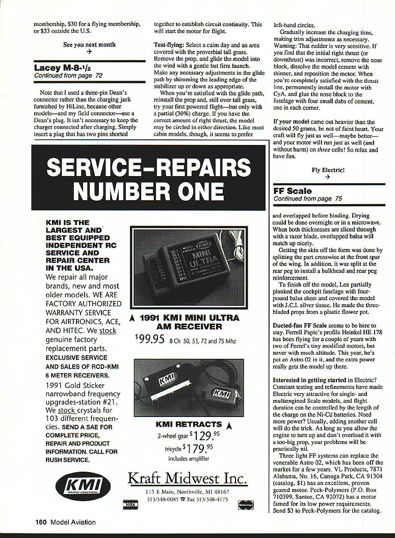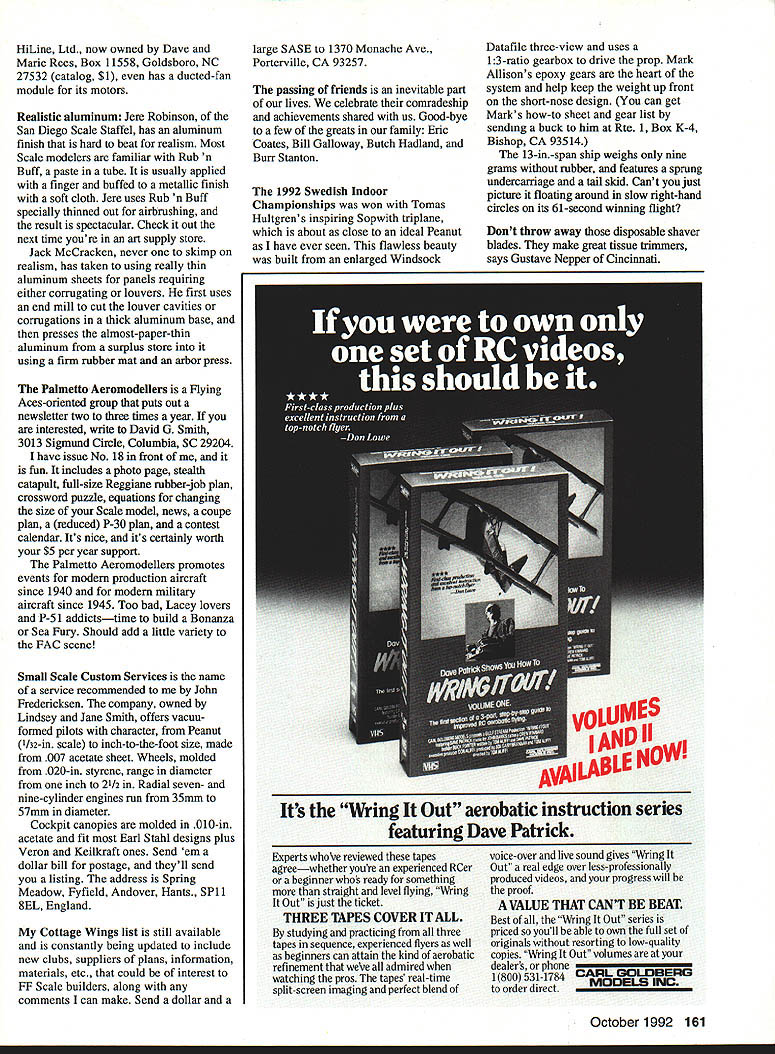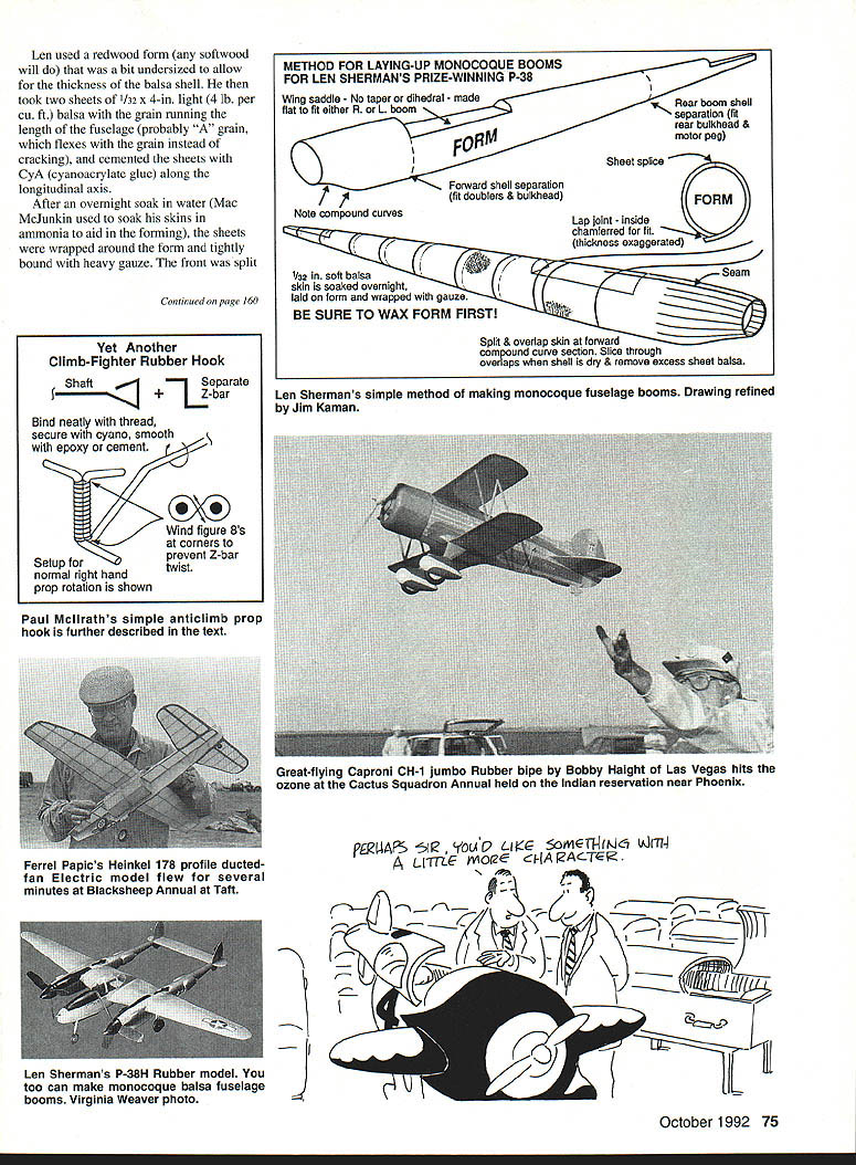 z FLIGHT Warner 1370 Monache Ave Porterville CA 93257 WHAT hot vinegar good According Tom Comparet telephoned company makes wonderful new Titebond II thing will debond product Isnt good know problem people using method develop craving fish chips much way using cellulose glue denatured mustard used produce craving hot dogs Len Shermans P-38 finest Scale Rubber jobs around Maybe its because worked em WW II fine scale appearance monocoque booms helped Len win 1991 NW FF Champs Balsa shells new past often made solid blocks balsa first shaped outside cut down middle lengthwise palnfully hollowed out reglued together can still want Bob Boucher used hollow out stuff using rotary file drill press keeping wall thickness uniform simple expedient maintaining wall thickness clearance between cutter table handle part carefully dont shove too far either side can maintain perfect dimension used use rotary burr Dremel tool freehand holding part up light until could see light shining through balsa would concentrate darker spots Unlike fixed-thickness drill press method method makes some allowances density differences use method must brace hands well Dremel does get away cut material didnt intend cut variation use gouge such X-Acto full-circle cutter 74 Model Aviation Tomas Hultgren Stockholm won 1992 Swedish Indoor Championships Peanut geared Sopwith Triplane Best official flight 61 seconds Bill Warners Sikorsky S-39 1935 Junior Birdman Contest drawings Model spans 32 weighs 6 oz overpowered Dart 035 dIesel Jere Robinsons Rubber North American 047-A modified Diels kit 1935 RM-12 geared canard Peanut just before winning flight 1991 US FF Aluminum finish sprayed Rub n Buff Championships Mark Allison holding also makes epoxy gears Yet Another Climb-Fighter Rubber Hook f2—%4 15rate Bind neatly thread secure cyino smooth epoxy cement Wind figure 8s corners Setup forprevent Z-bar normal right handtVist prop rotation shown Len used redwood form softwood will bit undersized allow thickness balsa shell took two sheets 1132 X 4-in light 4 lb per cu ft balsa grain running length fuselage probably grain flexes grain instead cracking cemented sheets CyA cyanoacrylate glue along longitudinal axis After overnight soak water Mac McJunkin used soak skins ammonia aid forming sheets wrapped around form tightly bound heavy gauze front split Continued page 160 Len Shermans simple method making monocoque fuselage booms Drawing refined Jim Kaman Paul Mcllraths simple anticlimb prop hook further described text pE4AF$ c LIG mE1T4uJ i3rn -vrR& kA02E clAi2AcTR October 1992 75 METHOD FOR LAYING-UP MONOCOQUE BOOMS FOR LEN SHERMANS PRIZE-WINNING P-38 Wing saddle No taper dihedral made flat fit either L boom Forward shell separation fit doublers & bulkhead Note compound curvesLap loint inside Spilt & overlap skin forward compound curve section Slice through over shell dry & remove excess sheet balsa Great-flying Caproni CH-1 jumbo Rubber bipe Bobby Haight Las Vegas hits ozone Cactus Squadron Annual held Indian reservation near Phoenix Ferrel Papics Heinkel 178 profile ducted fan Electric model flew several minutes Blacksheep Annual Taft Len Shermans P-38H Rubber model too can make monocoque balsa fuselage booms Virginia Weaver photo membership $30 flying membership $33 outside US See next month y M81/z Continued page 72 Note used three-pin Deans connector rather charging jack furnished HiLine because other modelsand field connectoruse Deans plug isnt necessary keep charger connected after charging Simply insert plug has two pins shorted KMI IS THE LARGEST AND BEST EQUIPPED INDEPENDENT RC SERVICE AND REPAIR CENTER IN THE USA repair major brands new older models WE ARE FACTORY AUTHORIZED WARRANTY SERVICE FOR AIRTRONICS ACE AND HITEC stock genuine factory replacement parts EXCLUSIVE SERVICE AND SALES OF RCD-KMI 6 METER RECEIVERS 1991 Gold Sticker narrowband frequency upgrades-station #21 stock crystals 1 03 different frequen cies SEND SAE FOR COMPLETE PRICE REPAIR AND PRODUCT INFORMATION CALL FOR RUSH SERVICE together establish circuit continuity will start motor flight Test-flying Select calm day area covered proverbial tall grass Remove prop glide model wind gentle firm launch Make necessary adjustments glide path shimming leading edge stabilizer up down appropriate youre satisfied glide path reinstall prop still over tall grass try first powered flightbut partial 30% charge have correct amount right thrust model may circled either direction Like cabin models though seems prefer $ 9995 8 Ch 50 53 72 75 Mhz 2-wheel gear ycle 1 7995 includes amplifier Kraft Midwest Inc 115 E Main Northville MI 48167 313/348-0085 313/348-4175 left-hand circles Gradually increase charging time making trim adjustments necessary Warning rudder very sensitive find initial right thrust downthrust incorrect remove nose block dissolve model cement thinner reposition motor youre completely satisfied thrust line permanently install motor CyA glue nose block fuselage four small dabs cement corner model came out heavier desired 50 grams faint heart craft will fly just wellmaybe better motor will run just well harm three cells So relax have fun Fly Electric cale Continued page 75 overlapped before binding Drying could done overnight microwave both thicknesses sliced through razor blade overlapped balsa will match up nicely Getting skin off form done splitting part crosswise front spar wing addition split rear peg install bulkhead rear peg reinforcement finish off model Len partially planked cockpit fuselage fourpound balsa sheet covered model JCI silver tissue made three bladed props plastic flower pot Ducted-fan FF Scale seems to stay Ferrell Papics profile Heinkel HE 178 has flying couple years two Ferrels tiny modified motors never much altitude year hes put Astro 02 extra power really gets model up Interested getting started Electric Constant testing refinements have made Electric very attractive single- multiengined Scale models flight duration can controlled 