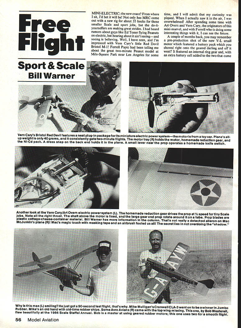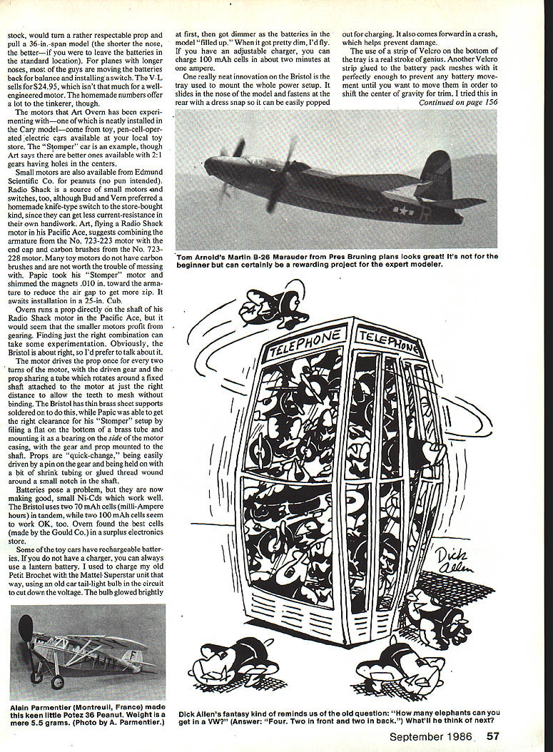 Free Flight MINI-ELECTRIC new craze sit Id bet will has MRC come out new rig about 35 bucks smaller Scale sport jobs do-it yourselfers making great strides heard rumors about guys like Ed Toner flying Peanuts electric hearing about aint seeingand seeing believing Well have seen Im impressed Vein Carys little Red Devil Bristol M-1 Ferrell Papic telling about great two-minute Peanut model Mile-Square Park near Los Angeles some time will admit curiosity piqued actually saw air overwhelmed After spending some time Art Overn Vein Cary originators mini-marvel Ferrell doing some interesting things can see future couple months back may remember pre-production shot new V-L small motor featured battery pack shoved right onto geared darling off went featured internal ring gear extra battery cell added two came Another look Yarn Cary/Art Overn electric power system L homemade reduction gear drives prop Y2 speed tiny Scale jobs Note right thrust shaft above motor fixed large gear prop rotate around tube Prop blades plastic cottage-cheese-container material Bill Warner has information column Thats really detached aileron Mac McJunkins plane Rl Macs magic touch masking tape airbrush fooled us secret lies overdoing shadow isthis man L smiling just got 90-second testfiight thatswhy Mike MuliigansCranweii CLA-3 wenton awinner Jumbo Rubber Mikes old hand old-time rubber ships Some Avro Avians R came top wing missing Bob Weaterell flew beautifully i986 Scale Staffel Annual Bob isa master using geared rubber motors uses two smooth flight 56 Model Aviation Sport & Scale Vein Carys Bristol Red Devil features neat plug-in package Its miniature electric powersystemthe motor Isfrom toy car Planes allup weight 40 grams consistently gets two-minute flights motortray R holds motor homemade reduction gear Ni-Cd pack dress snap back end holds plane small lever near prop operates homemade knife switch stock would turn rather respectable prop pull 36-in-span model shorter nose betterif leave batteries standard location planes longer noses guys moving batteries back balance installing switch V-L sells $2495 isnt much awell engineered motor homemade numbers offer lot tinkerer though motors Art Ovem has experi menting withone neatly installed Caiy modelcome toy pen-cell-oper ated electric crs available local toy store Stomper car example though Art says ther better ones available 21 gears having holes centers Small motors also available Edmund Scientific Co peanuts no pun intended Radio Shack source small motors end switches too although Bud Vein preferred homemade knife-type switch store-bought kind since can get less current-resistance own handiwork Art flying Radio Shack motor Pacific Ace suggests combining armature No 723-223 motor end cap carbon brushes No 723228 motor toy motors have carbon brushes worth trouble messing Papic took Stomper motor shimmed magnets 010 toward annatore reduce air gap get zip awaits installation 25-in Cub Overn runs prop directly shaft Radio Shack motor Pacific Ace would seem smaller motors profit gearing Finding just right combination can take some experimentation Obviously Bristol about right Id prefer talk about motor drives prop once two turns motor driven gear prop sharing tube rotates around fixed shaft attached motor just right distance allow teeth mesh binding Bristol has thin brass sheet supports soldered Papic able get right clearance Stomper setup filing flat bottom brass tube mounting bearing side motor casing gear prop mounted shaft Props quick-change being easily driven pin gear being held bit shrink tubing glued thread wound around small notch shaft Batteries pose problem now making good small Ni-Cds work well Bristol uses two 70 mAh cells mill-Ampere hours tandem two 100 mAh cells seem work OK too Overn found best cells made Gould Co surplus electronics store Some toy cars have rechargeable batter ies have charger can always use lantern battery used charge old Petit Brochet Mattel Superstar unit way using old car tall-light bulb circuit cut down voltage bulb glowed brightly first got dimmer batteries model filled up got pretty dim Id fly have adjustable charger can charge 100 mAh cells about two minutes ampere really neat innovation Bristol tray used mount whole power setup slides nose model fastens rear dress snap can easily popped I out charging also comes forward crash helps prevent damage use strip Velcro bottom tray real stroke genius Another Velcro strip glued battery pack meshes perfectly enough prevent battery move ment until want move order shift center gravity trim tried Continued page 156 k September1986 57 Tom Arnoids Martin B-26 Marauder Pres Bruning plans iooks great its beginner can certalniy rewarding project expert modeler Alain Parmentier Montreuli France made keen little Potez 36 Peanut Weight mere 55 grams Photo Parmentier Dick Allens fantasy kind reminds us oid question niany eiephants can get VW Answer Four Two front two back Whatll think next 1429 Fox Dale P1 Sidney OH 45365 clever ruse hinging rudder letting find ____________________________________ felt happiest solve problem FF Duration/Hartill straightened out flights right winners Continued page 59 circle _________________________________________________ Top dog Peanut Clarence Mather Parnall Pixie top Junior Jeff Witt man definitely has knack Tailwind Contester Lacey Ralph Cooke put up fine flights trio Gas jobs Ian Payne slipped fine float-equipped Vultee L-1 third Gas Second Ferrell Papic tried-and-true Astro 02-powered Bleriot 7 taking top honors Bill Stromans Taube CO-2 power Its great flier new one-inch-to-the-foot Bellanca CF four cells takes Astro 02 worked marvelously extra weight really nice thing about electric can always move batteries rearward balance motor prop xeight prop Bristol slotted hub Dick Howards famous cottage-cheese-container plastic blades glued Theyre almost indestruc tible contest scene April May months hard keep up going San Diego Scale Staffel Annual interesting set O