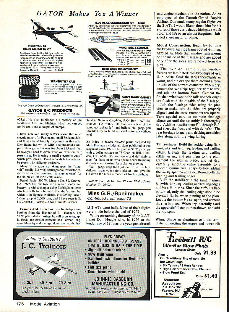 Free Flight Sport&Scale Bill Warner TOGETHERNESS Flying Aces Nats definitely biggie 1986 no doubt about Thousands years modeling experience gath ered green grass favorable winds hard act follow August however rather obscure all-American town Tangent OR budding Scale event Northwest Free Flight Champs provided interesting counterpoint Can picture Scale meet Rubber Power fly together Scale judge makes house calls check out models camaraderie level Scale endeavor unsurpassed first heard Oregon bash Bill Gif fen part Canadian contingent descends Tangent yearly battle Yanks Giff CD Canadian Nats last summer painted such glowing picture event decided see could great better focus meet Grell Farm home legendary Al Dee Grell hosts some finest Free Flighters ever drove hundreds miles share airspace expertise stories Friday night before meet tents go up Grell lawn preparation models testing meeting new friends greet ing old ones order day Included festivities tour Als hangar houses assortment planes rang ing Culver Falconair Com monwealth Aeronca Hes building Pietenpol another shed too Its dream redblooded American Junior Birdman have very own airstrip hangar right outside door get bed late Dawn Saturday Cars campers head flying field couple miles down road ground covered straw awaiting torch rapid-bum trucks weather right Sometimes meet lucky flying takes place scorched earth year annual conflagration kills rust fun gus has happened yet Free Flight Endurance models majority air still weather magnificent holds weekend presence water truck underlines need care dethermalizer fuses 72 Modei Aviation Bill Gaiser demonstrates used get em up Good Old Days Model 1911 Caudron semi-scale Testors 049 power great flier i -I Larry Olson Kent WA veteran CoxCapt Doug HannayVancouver BC Pee Wee-powered Fokker DR-i Sterlbeautiful Waco SRE Earl Stahl plan ing kit Its flying 11 yearsand awhich available John Pond PO full tank timelBox 90310 San Jose CA 951 09-3310 Bobby Haight Las Vegas NV brought couple planes Champs electric-powered Savola-Marchetti S M81 L testing Power two Astro 02s 035not enough oomph Northrop Gamma Above rubber ship 1933 GHQ Models plans very realistic flier N 1 o superior Scale ships seen 86 Northwest FF Champs left 1 st-place Etrich Taube Greg Davis Port Coquitlam B C D C 049 diesel powerwas just right low-and-slow flights 54-in-span Taylororaft R started Comet kit loadsof extras added builder Rio Dittman plush interior scale-size Flying magazine seat Hard tell full-scale plane Second place Gorgeous Bellanca Aircrulser model L exhibits Museum Flight Boeing plant Seattle must-see youre area Gift Giften Surrey BC took breather running events NW FF Champs get flight Jumbo Rubber Currie Wot bipe R Prototype English home-built model terrific flier steep climb Scale sort afterthought meet goes both days whenever feel like flying Scale Director Foggy Morehead looks over models wherever set up informality name game Cutthroat competitors would get ulcer meet rest us heck great time interesting modelers scene Bill Gaiser Lyons OR Bills first serious Scale model four-foot Curtiss Robin powered engine often seen today IMP ES-2 twin purchased five bucks won contortionist talent contest back Thirties engine powered calcium carbide dry ice worked putting powdered car bide dry ice brass generator tank operating release valve let water engine instantly pressurized purpose dry ice buffer explosive ten dencies acetylene gas produced car bide worked though todays C02-only motors lot safer Bill flying red-silked 1911 Caudron flew over field used alr model box Fokker DR-i easiest model make fly well yet Larry Olsons 11-year-old model Sterling kit has literally hours alr-time five-minute cruises low alti tude reminiscent WW movie footage Dreidecker once flew fine until engine cut torque counter act some built-in warps snap-roll screaming dive returned kit form before could say Leapin Lizards Things like keep humble Another humbling experience Ric Ditt mans outstanding Tayloreraft side-by-sider Comet kit finished doing up resembled kit model about much Lamb orghini Countach resembles Ford Falcon plush interior inspection panels miniature copy Flying magazine seat spring-centering tail wheel superb level craftsmanship coupled near-perfect scale flight would make winner Scale meet world except Greg Davis Etrich Taube factory plans model often beaten has elegance interest ing details flight has seen believed Complete pilot bombardier Taubes ready museum almost too good First place scale almost anti climactic though Dittmans T-Craft just hairs breadth away second nicest fliers site Bobby Haights Northrop Gamma rubber ship featuring machined aluminum hub concealed free wheeling adjustable-pitch bottle-plastic blades bench ailerons may have secret perhaps 1933 GHG Models plan lots space structure model definitely performed well Bobby also gorgeous Savola-Marchetti S M81 trimotor two Astro 02s 035 showed some tip-stall tendencies retired early Capt Doug Hannay very neat Earl Stahl Waco SRE rubber ship popular Scale subjects time plans still available through John Pond other end size spectrum Giffens huge Currie Wot biplane really impressive flight climbing out like proverbial homesick angel Saturday capped off immense potluck barbecue sponsored Willamette Modelers flying stories improved evening wore Sunday almost replay Saturday fine weather countless fine flights planes did hit ground saved luxurious staw padding Some memorable moments included beContinued page 175 February 1987 73 Gee Bee lava lamp sits atop DickAllens TV set up Canada tracking retrieval place usuallyincorporated flashlight bulb battery greenglowing chemical light configurations test made strobe its twin pencells AA-size batteries installed bottom Fox 45-powered 1200-sq-in Show-Off resultant light blinked through door-like transparent acetate sheet protected ar rangement fuel spray dirty desert residue Upon launch Ron relates strobe quite effective bri
