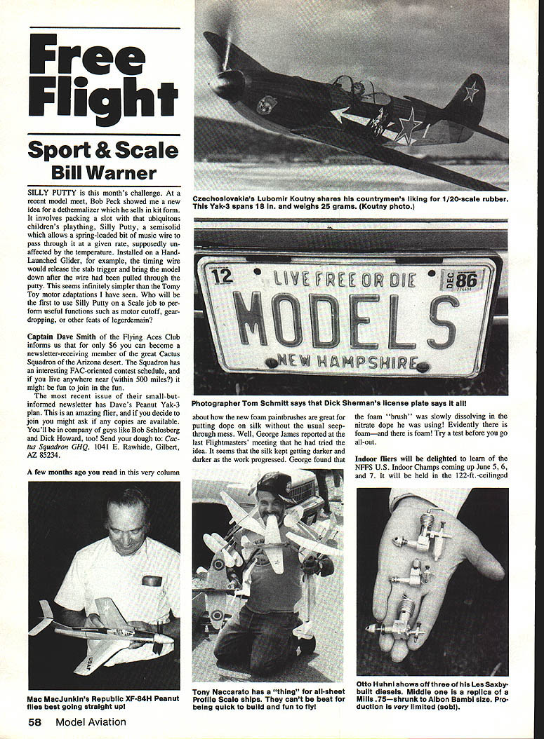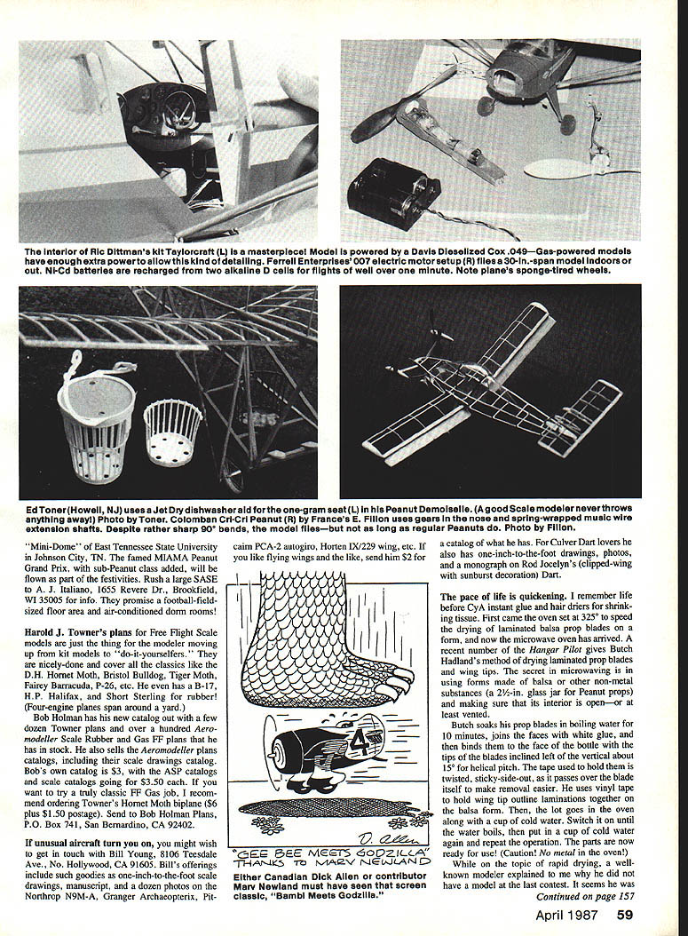 Free Flight Sport & Scale Bill Warner SILLY PUUY months challenge recent model meet Bob Peck showed new idea dethermalizer sells kit form involves packing slot ubiquitous childrens plaything Silly Putty semisolid allows spring-loaded bit music wire pass through given rate supposedly un affected temperature Installed HandLaunched Glider example timing wire would release stab trigger bring model down after wire pulled through putty seems infinitely simpler Tomy Toy motor adaptations have seen will first use Silly Putty Scale job per form useful functions such motor cutoff geardropping other feats legerdemain Captain Dave Smith Flying Aces Club informs us $6 can become newsletter-receiving member great Cactus Squadron Arizona desert Squadron has interesting FAC-oriented contest schedule live anywhere near within 500 miles might fun join fun recent issue small-butinformed newsletter has Daves Peanut Yak-3 plan ansazing flier decide join might ask copies available Youll company guys like Bob Schlosberg Dick Howard too Send dough Cac tus Squadron GHQ 1041 E Rawhide Gilbert AZ 85234 few months ago read very column about new foam paintbrushes great putting dope silk usual seepthrough mess Well George James reported last Flightmasters meeting tried idea seems silk kept getting darker darker work progressed George found foam brush slowly dissolving nitrate dope using Evidently foansand foam Try test before go all-out 58 Model Aviation Czechoslovakias Lubomir Koutny shares countrymens iiking 1/20-scais rubber Yak-3 spans 18 weighs 25 grams Koutny photo Photographer Tom Schmitt says Dick Shermans ilcense piate says aiii Indoor fliers will delighted leam NFFS US Indoor Champs coming up June 5 6 7 will held 122-ft-ceilinged Mac Macjunkins Repubiic XF-84H Peanut fuss best going straight up Otto Huhnlshows off three Las Saxby Tony Naccarato has thing all-sheetbulit dieseis Middle repilca Prof lie Scaic ships cant beat forMiiis 75shrunk Aibon Bambi sIze Pro being quick build fun flyduction very limited sob interior Rio Dittmans kit Tayiorcraft U isa masterpiece Model powered Davis Dieselized Cox 049Gas-powered models have enough extra powerto aiiowthis kind detailing Perreil Enterprises 007 electric motorsetup CR files 30-in-span model Indoors out Ni-Cd batteries recharged two aikailne D celis flights well over minute Note planes sponge-tired wheels Ed TonerHoweii NJ uses Jet Dry dishwasher aid forthe one-gram seat 1 Peanut Demoiseile Agood Scale modeler neverthrows anything away Photo Toner Colomban Cri-Cri Peanut R Prances E Filion uses gears nose spring-wrapped music wire extension shafts Despite rather sharp 900 bends model fliesbut long regular Peanuts Photo Filion Mini-Dome East Tennessee State University Johnson City TN famed MIAMA Peanut Grand Prix sub-Peanut class added will flown part festivities Rush large SASE J Italiano 1655 Revere Dr Brookfield WI 35005 info promise football-fieldsized floor area air-conditioned dorm rooms Harold J Towners plans Free Flight Scale models just thing modeler moving up kit models do-it-yourselfers nicely-done cover classics like DH Hornet Moth Bristol Bulldog Tiger Moth Fairey Barracuda P-26 etc has B-17 HP Halifax Short Sterling rubber Four-engine planes span around yard Bob Holman has new catalog out few dozen Towner plans over hundred Aero modeller Scale Rubber Gas FF plans has stock also sells Aeromodeller plans catalogs including scale drawings catalog Bobs own catalog $3 ASP catalogs scale catalogs going $350 want try truly classic FF Gas job recom mend ordering Towners Hornet Moth biplane $6 plus $150 postage Send Bob Holman Plans PO Box 741 San Bernardino CA 92402 unusual aircraft turn you might wish get touch Bill Young 8106 Teesdale Ave No Hollywood CA 91605 Bills offerings include such goodies one-inch-to-the-foot scale drawings manuscript dozen photos Northrop N9M-A Granger Archaeopterix Pitcairn PCA-2 autogiro Horten IX/229 wing etc like flying wings like send him $2 A- a &E Mc22T$ 6oZlLA THAN-I r t1AV r4ELJLAN er Canadian Dick Alien contributor Mary Newiand must have seen screen classic Bambi Meets Godziiia catalog what has Culver Dart lovers also has one-inch-to-the-foot drawings photos monograph Rod Jocelyns clipped-wing sunburst decoration Dart pace life quickening remember life before CyA instant glue hair driers shrink ing tissue First came oven set 3250 speed drying laminated balsa prop blades form now microwave oven has anived recent number Hangar Pilot gives Butch Hadlands method drying laminated prop blades wing tips secret microwaving using forms made balsa other non-metal substances 2-in glass jar Peanut props making sure its interior openor least vented Butch soaks prop blades boiling water 10 minutes joins faces white glue binds face bottle tips blades inclined left vertical about 150 helical pitch tape used hold twisted sticky-side-out passes over blade itself make removal easier uses vinyl tape hold wing tip outline laminations together balsa form lot goes oven along cup cold water Switch until water boils put cup cold water again repeat operation parts now ready use Caution No metal oven topic rapid drying wellknown modeler explained did have model last contest seems Continued page 157 April 1987 59 Nearly kits contain concise ade quate instructions preparing model test flights follow religiously Wait calm day hope best As youd expect non-Scale high-wing model will fly better low-wing Scale model model will inevitably sustain flight damage because built plane saved kit scraps extra tissue should able repair after worst crashes plane finally becomes patched worn unflyable start another stick-and-tissue model use knowledge materials techniques youve gained build gas- electricpowered Radio Control model Perhaps youd rather scratch-build tiny Peanut Scale flying model move gos samer-like Indoor flying model Either way youll have fun develop new skills Addresses Comet Industries Corp 3630 South Iron St Chicago IL 60609 Paul K Guillow In
