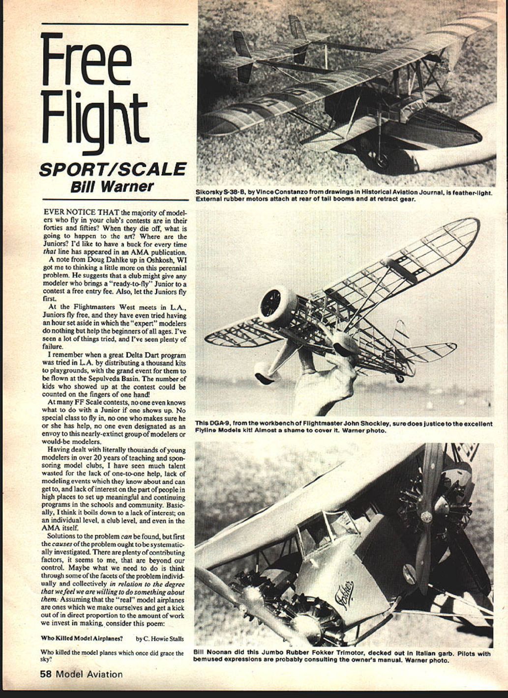 Free Flight SPORT/SCALE Bill Warner EVER NOTICE THAT majority model ers fly clubs contests forties fifties die off what going happen art Juniors Id like have buck time line has appeared AMA publication note Doug Dahike up Oshkosh WI got thinking little perennial problem suggests club might give modeler brings ready-to-fly Junior contest free entry fee Also let Juniors fly first Flightmasters West meets LA Juniors fly free have tried having hour set aside expert modelers nothing help beginners ages Ive seen lot things tried Ive seen plenty failure remember great Delta Dart program tried LA distributing thousand kits playgrounds grand event flown Sepulveda Basin number kids showed up contest could counted fingers hand FF Scale contests no knows what Junior shows up No special class fly no makes sure has help no designated envoy nearly-extinct group modelers would-be modelers Having dealt literally thousands young modelers over 20 years teaching spon soring model clubs have seen much talent wasted lack one-to-one help lack modeling events know about can get lack interest part people high places set up meaningful continuing programs schools community Basic ally think boils down lack interest individual level club level AMA itself Solutions problem can found first causes problem ought systematic ally investigated plenty contributing factors seems beyond control Maybe what need think through some facets problem individ ually collectively relation degree wefeel willing something about Assuming real model airplanes ones make ourselves get kick out direct proportion amount work invest making consider poem Killed Model AIrplanes C Howie Stalls killed model planes once did grace sky 58 Model Aviation Sikoraky 5-38-B Vince Constanzo drawings Historical Aviation Journal feather-light External rubber motors attach rear tail booms retract gear DGA-9 workbench Fllghtmaster John Shockley sure does justicetothe excellent Flyline Models kIt Almost shame cover Warner photo Bill Noonan did Jumbo Rubber Fokker Trimotor decked Out Italian garb Pilots bemused expressions probably consulting owners manual Warner photo Everyone interviewed said Certainly exclaimed TV set merely entertain Its fault kids have no time make model plane killed model airplanes Grandpa used get Banana oil tissue dime nickel kit say manufacturers costly RC gear pre-cut parts instant glue cost very dear killed pride building work done-byhand Balsa sticks printwood leamed cut sand says plsatic man parta pre-formed such Anyone can make plane effort isnt much killed model gliders once bought cent looped-the-loop made us laugh wonder went much profit selling local druggist chimes Pennies will pay rent nor nickels dimes killed flying sites theres no place left fly Wheres local vacant lot grass green high Dont blame builder says Keep Out signs hand People want houses houses use up land killed model plans once found mags yesterday could use very night have send away say editors need space ads RC what pays bills kid-directed fads killed rubber-powered planes kids used fly Before city ran us out park field sky counciiman disclaims golf club hand planes much too dangerous take up too much land killed model airplanes small pure line challenged skill heart soul costbut thin dime shouts Macho Melvin plane big loud Without Melvins manhood might questioned crowd killed model airplanes time now past Can times have changed die cast pre-cut plastic world batteries must Will skills yesterday become balsa dust Wholl save model airplanes still time win model planes leave off kids begin Will other people save Ill have disagree Find Junior show him Dont leave up mate cool Gee Bee sunglasses Dick Alien Tune next coiumn Some people trying something individual basis getting kid two together helping get started building flying Others like Larry Miles San Diego trying get booklet program together can help schools Are schools remiss present Others feel better kits avail able kids will come Have manufac turers fault great box-cover promises dont deliver Some like National Free Flight Society working PR angle have put Out call concerned modelers clubs help get national campaign make Free Flight visible off ground Write call Jack Woodward 7840 Madison Ave Suite 185 Fair Oaks CA 95628 906 961-1829 ifyoud like get involved Modelings future involves FAC Nats Flying Aces dedicated pre serving finest real modeling have just awarded joyous task hosting 1982 FAC Nats illustrious SOTS club event will held summer Johnsville Naval Air Station near Philadelphia Watch Flying Aces Club News further details can join internationally-renowned ganization nine bucks entitles great bi-monthly collection humor model plans 3-views nostalgia Send Flying Aces Club GHQ 3301 Cindy Lane Erie PA 16506 Put FAC Nats calendar today Continued page 132 April 1982 59 HOD DarKerana nis eagle 220 cropduster Rubber-powered ship 55 high-aspect-ratio wings will ROG about two feeti Ken Johnsons 18-gm Soiar Chaiienger Jumbo Rubber ship seen test flights December Flightmasters Jumbo meet U Gabe Mora 16 LosAngeles blew up Dick Baxtes Lemberger Peanut twice size came up great flying airplane Tony Naccarrato 0 urDank CA AA 10 Rubber model Another case model flying before full-size aircraft 4 Gal Case %One or5GalCan 24 Gal Per Gal 575 650 750 800 825 985 1500 2400 126 Gal Per Gal 525 575 645 725 775 950 1400 2300 30 Gal Drum EA 9700 13300 16100 17800 19000 24200 36500 58200 54 Gal Drum EA 13500 19900 25000 28000 30000 39000 60000 97500 Prices subject change notice Free delivery 1 4 5 24 & 126 gal deals 30 & 54 gal drums freight collect FOB Clover SC Gallon price determined nitro content & total quantity ordered SC orders add 4% sales tax Add $250 COD package $100 maximum charge card & COD orders NEW Power Booster 1/4 scale eng $1 2O0/qt $3800/gal freight included Use 3 os/gal gas mix eAmerican made eSchnuerle ports eDouble ball bearing sPerry carburetor eForged & domed piston Forged & busheu con rod eQ-ring sealed
