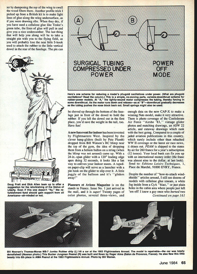 JOY first reaction opening new profile models Peck-Polymers Hey thats pretty cute second thing reach glue irresistible mainly due fact figure will have done within hour Good psychology Bob buying speed construction attractive model good press-on decorations pre cut pre-dyed yellow balsa landing gear wire pre-bent big plus Junior modelers Making landing gear pants about hardest thing model wont too bad because good die-cutting design yellow felt pen used match up rest model great evenings father/son mother/daughter project PROFILE CITA DRIA 2 * ** I-** 114* * new Busy People series profile Scale models Peck-Polymers goodand can made better IncorporatIng few sImple techniques during construction see column satisfied making anything way comes kit suggest sanding wings tail sur faces save weight model comes out tail-heavy lightening area will save clay ballast snoot later shaded area diagram No 1 can reinforced liberal application cyano acrylate glue CyA good idea have kid around gluing flat tooth pick down side added strength Fail own risk problem profile models have ever seen No 2 diagram shows wing camber held underwing former wing Getting can made eas Bobby Height Vegas Vulture launches Jumbo Rubber YAK Samolot L 1982 Flying Aces Club FAC Nats model reported fly like AT4 Bill w9nders Dennis Normans big Tupoiov Bear bomber R lean ambitious project photo ass reminder 1984 FAC Nets coming July 14-15 Utica Ml Photos Tom Schmitt Bob Howards realistic DH-4 L originated ass Guiliow kit Bob says weighs ton still flies 30 sec Great job Bob Model spans 27 Photo Bobs proud dad Dick Howard ing Aiferys Peanut Scale Aero A-b pre-WW Ii Czech airliner R placed third Czech/Soviet Cup meet Nov6 Mesto Czechoslovakia model flies over 60 sec Photo Lubomir Koutny 64 Model Aviation ier dampening top wing swell wood fibers Another profile trick picked up British kit make light lines glue along wing undersurface drawing ribs dry have used cellulose glue like Testors green tube lines glue will pull give nice undercamber last thing will help along will take straight pin flying field will probably lose neat little S-hook used attach rubber little vertical dowel rear fuselage pin can -a Doug Pratt Dick Allen team up after suggestion refurbishing Statue Liberty doesnt fiy re furbishment fund should gain support aii Americansair-minded shoved up through bottom fuse lage just front dowel hold rubber left dowel out first place youd save weight tail too Have fun Anew fun event indoor has invented Flightmasters West Inspired clever hang-gliders built Pete Plumb dropped Bill Watsons RC blimp near top gym idea dropping helium ballon string blimp around came up 24-in-span glider l20 leading edge apex doing 32 seconds looks like fun way enliven Indoor meets tapedon paper-clip will serve launcher pin hook glider slip over little joggle balloon its gliders away Pinneurs et Avions Magazine stands France Issue No 1 just arrived mail super Twenty pages color photos several three-views enough data new CAP-X make winning Nats model make very attractive photo coverage Confederate Air Force Airsho 83 vintage glider photos matching drawings ASW 22 article cutaway drawings rank best going Compared couple jaded aviation publications country rarely include other rehashed NW II coverage orthe latest air race news shines out PEAM shipped states air 260 francs years subscription 12 issues local bank can fix up international money order franc almost nine dollar last look Send Editions Loisirs Techniques 1 Place du Marcbe 91000 EVRY France Despite number how-to-attach wind shields articles around still see dozens models cellulose glue smears white fog inside CyA blast just plain holes cabin area people just left em off knew guy once burned two Continued page 161 Biii Noonans Thomas-Morse MB-7 Jumbo Rubber ship L hit car 1983 Fiightmaaters Annusi modei repairablethe car totally demolished Noonan photo Bucker Jungman Peanut R built flown Roger Aime Salon de Provence France also flew little beauty 8th place AMA Peanut 1983 Flightmasters Annual Photo Bill Warner June 1984 65 Heres scheme reducing models phugold oscillations under power What phugoid oscillations Read column simple no-moving parts variable-downthrust scheme rubber-power models tightly-wound motor compresses tubing thereby forcing some downthrust As motor runs down relaxes-as Bdownthrust gradually decreases tubing pushes nose block back out Small springs might also used Im quasiNostalgia event going tried out CIA Tentatively engines up 025 Cu will permitted legal Nos talgia model may scaled down cope small engine size Presumably other features rules will follow 020-Old-Timer Well keep posted Department Philosophy owner multi-megabuck-per-year athletic team sponsor Indy racer sure wouldnt go around telling competition what up Free Flight com petition time Curiously perhaps seems Free Flight types always willing share secrets anyone cares enough askor asking via various underground club newsletters magazine articles Perhaps because own thing doesnt work well back old drawing board Weve hundred times before take another whack it does work justifiably damned proud inclined crow about bit winning result withholding information may benefit adversaries signif icance such win lessened thereby Cripes dont know think Im some kind philosopher something know competition-oriented Free Flight nice environment live Bob Meuser 4200 Gregory St Oakland CA 94619 FF Scale/Warner Continued oaae 65 almost-finished Citabria models result frustrating windshield-installation ses sion What has always worked well brushing thinned cellulose glue around framing letting dry Slap plastic assuming have tried paper pattern cut plastic touch brush some Kodak film-splicing cement edge now goes capillary action holds fine Recently discovered Wilhold R/C-56 glue looks like white glue holds like crazy make little goof quick wipe damp cloth takes off nicely unless let dry have problem Still dries clear doesnt look bad Tap