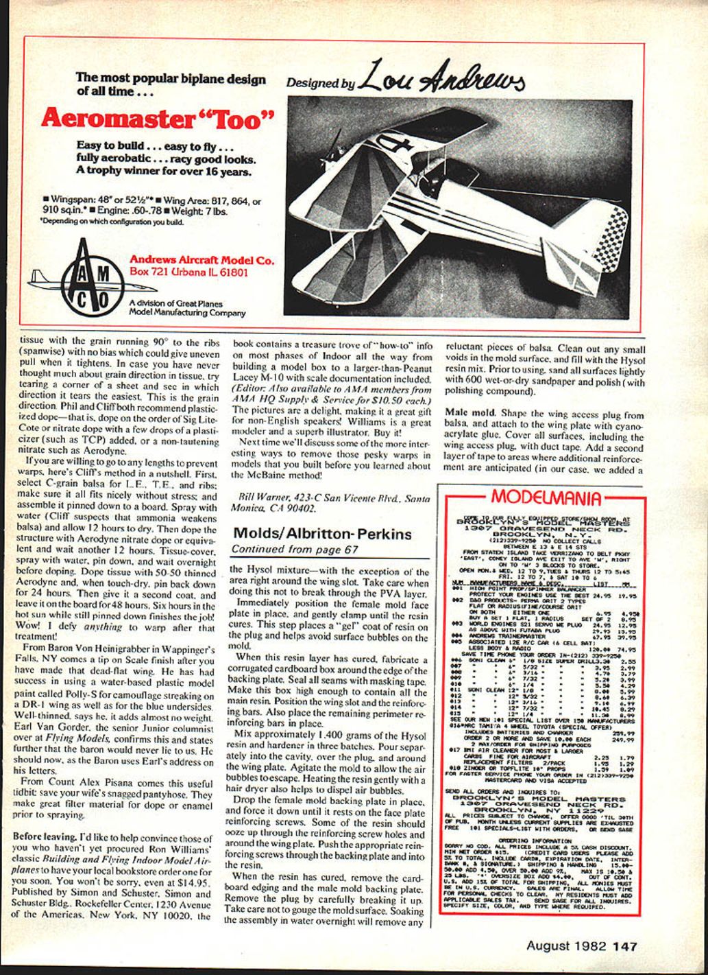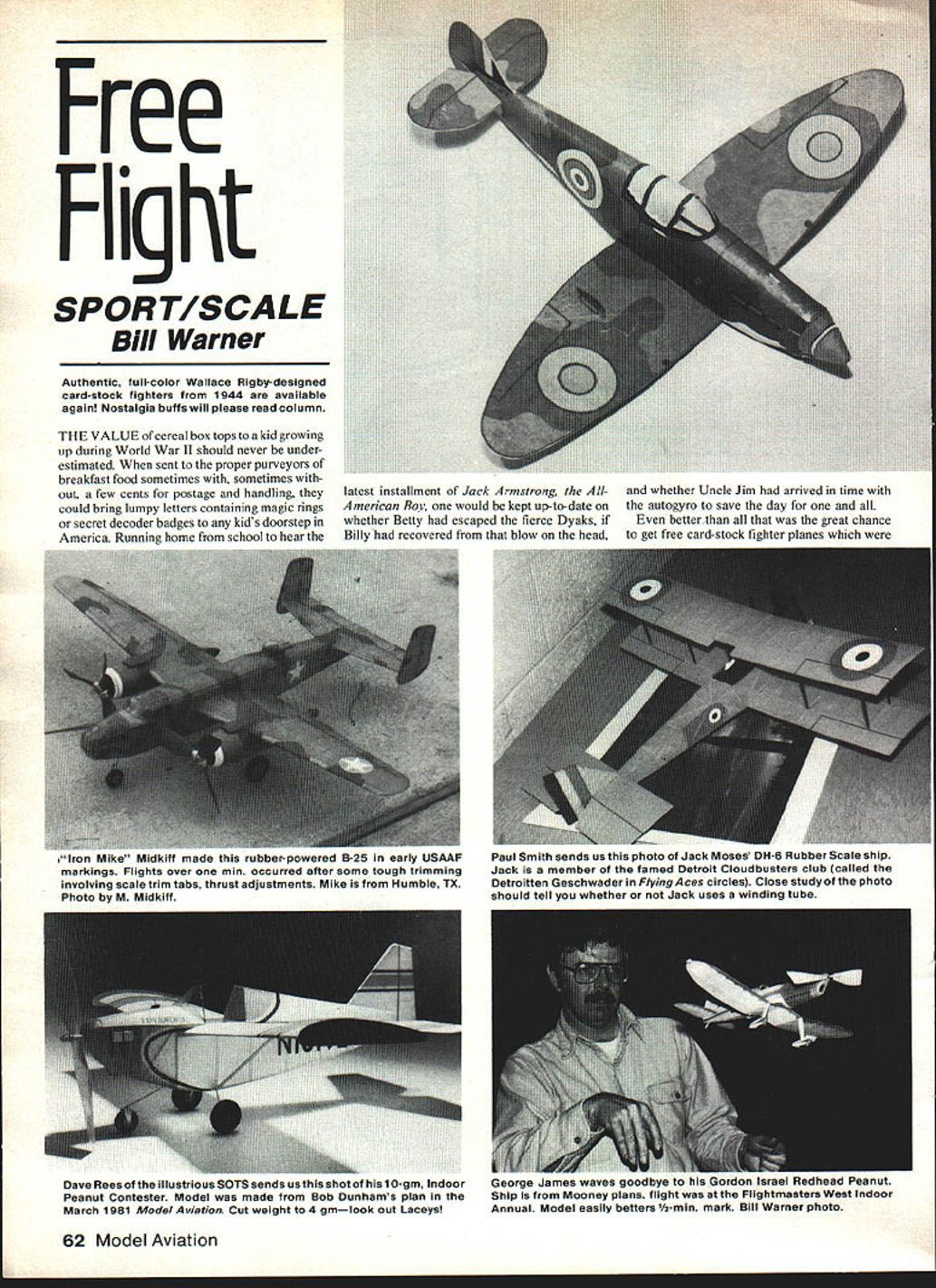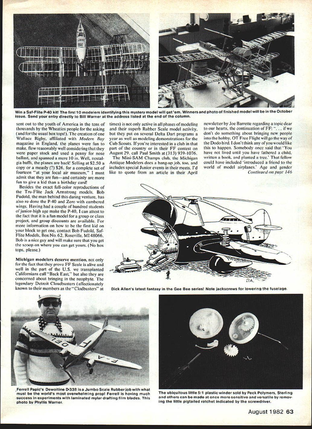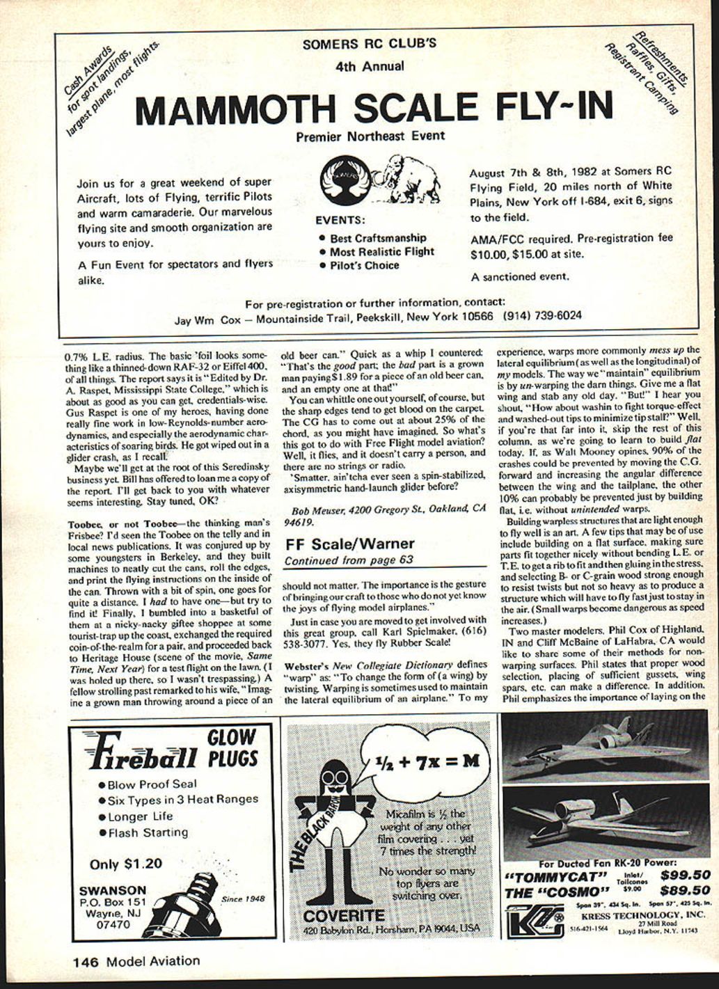Free Flight SPORT/SCALE Bill Warner Authentic full-color Wallace Rigby-designed card-stock fighters 1944 available again Nostalgia buffs will please read column THE VALUE cereal box tops kid growing up during World War II should never under estimated sent proper purveyors breakfast food sometimes sometimes out few cents postage handling could bring lumpy letters containing magic rings secret decoder badges kids doorstep America Runnine home school hear latest installment Jack Armstrong All- whether Uncle Jim arrived time American Rot would kept up-to-date autogyro save day whether Betty escaped fierce Dyaks better great chance Billy recovered blow head get free card-stock fighter planes lron Mike Midkiff made rubber-powered B-25 early USAAF markings Flights over mm occurred after some tough trimming involving scale trim tabs thrust adjustments Mike Humble TX Photo M Midkiff Dave Reesof illustrious SOTS sends us thisshotof hisi 0-gm Indoor Peanut Contester Model made Bob Dunhams plan March 1981 Model Aviation Cut weight 4 gmlook out Laceys Paul Smith sends us photo Jack Moses DH-6 Rubber Scale ship Jack member famed Detroit Cloudbusters club called Detroitten Geschwader Flying Aces circles Close study photo should tell whether Jack uses winding tube 62 Model Aviation George James waves goodbye l Redh~ Peanut Ship Mooney plans flight Flightmasters West Indoor Annual Model easily betters /2-mm mark Bill Warner photo sent out youth America tens thousands Wheaties people asking usual box tops creation Wallace Righy affiliated Modern Boy magazine England planes fun make flew reasonably well considering paper stock used penny nose ballast spanned mere 10 Well nostal gia buffs planes back Selling $250 copy measly complete set fourteen local air museum must admit funand certainly fun give kid birthday card Besides exact full-color reproductions Tru-Flite Jack Armstrong models Bob Fudold man behind daring venture has also re-done P-40 Zero cambered wings Having couple hundred students junior-high age make P-40 can attest fact fun model group class project group discounts available information first kid block get contact Bob Fudold Saf Flite Models Box No62 Roseville MI 48066 Bob nice guy will make sure get scoop can get yours No box tops please Michigan modelers deserve mention fact prove FF Scale alive well part US transplanted Californians call Back East also concerned about bringing neophyte legendary Detroit Cloudhusters affectionately known members Clodhusters times active phases modeling superb Rubber Scale model activity put several Delta Dart programs year well modeling demonstrations Cub Scouts youre interested club part country FF contest August29 call Paul Smith 313 939-1076 Mini-SAM Champs club Michigan Antique Modelers does bang-up job too includes special Junior events meets Id like quote article April newsletter Joe Barrette regarding topic dear hearts continuation FF nt something about bringing new people hobby OT Free Flight will go way Dodo bird dont think would like happen Somebody once said have lived until have fathered child written book planted tree fellow could have included introduced friend world model airplanes Age gender Continued 00 page 146 Ferrell Papics Dewoitine D-338 Jumbo Scale Rubberjob what must worlds overwhelming prop Ferrell having much success experiments laminated mylar drafting film blades photo Phyllis Warner ne ubiquitous little 1 plastic winaer soia ny lecK loiymers tserling others can made once sensitive versatile remov ing little pigtailed ratchet indicated screwdriver August 1982 63 Win Saf-Flite P-40 kit first 10 modelers identifying mystery model will getem Winners photo finished model will October issue Send entry directly Bill Warner address listed end column Dick Allens latest fantasy Gee Bee series Note jackscrews lowering fuselage SOMERS RC CLUBS 4th Annual MAMMOTH SCALE FLY-IN Premier Northeast Event 0 Join us great weekend super Aircraft lots Flying terrific Pilots warm camaraderie marvelous flying site smooth organization yours enjoy Fun Event spectators flyers alike EVENTS Best Craftsmanship Most Realistic Flight Pilots Choice August 7th & 8th 1982 Somers RC Flying Field 20 miles north White Plains New York off 1-684 exit 6 signs field AMA/FCC required Pre-registration fee $1000 $1500 site sanctioned event pre-registration further information contact Jay Wm Cox tainside Trail Peekskill New York 10566 914 739-6024 07% LE radius basic foil looks some thing like thinned-down RAF-32 Eiffel 400 things report says Edited Dr Raspet Mississippi State College about good can get credentials-wise Gus Raspet heroes having done really fine work low-Reynolds-number aero dynamics especially aerodynamic char acteristics soaring birds got wiped out glider crash recall Maybe well get root Seredinsky business yet Bill has offered loan copy report Ill get back whatever seems interesting Stay tuned OK Toobee Toobeethe thinking mans Frisbee fd seen Toobee telly local news publications conjured up some youngsters Berkeley built machines neatly cut cans roll edges print flying instructions inside can Thrown bit spin goes quite distance have onebut try find Finally bumbled basketful nicky-nacky giftee shoppee some tourist-trap up coast exchanged required coin-of-the-realm pair proceeded back Heritage House scene movie Same Time Next Year test flight lawn holed up wasnt trespassing fellow strolling past remarked wife Imag ine grown man throwing around piece old beer can Quick whip countered Thats good part bad part grown man paying $189 piece old beer can empty can whittle out yourself course sharp edges tend get blood carpet CG has come out about 25% chord might have imagined So whats got Free Flight model aviation Well flies doesnt carry person no strings radio Smatter aintcha ever seen spin-stabilized axisymmetric hand-launch glider before Bob Meuser 4200 Gregory St OaklantL CA 94619 FF Scale/Warner Continued page 63 should matter importance gesture bringing cr