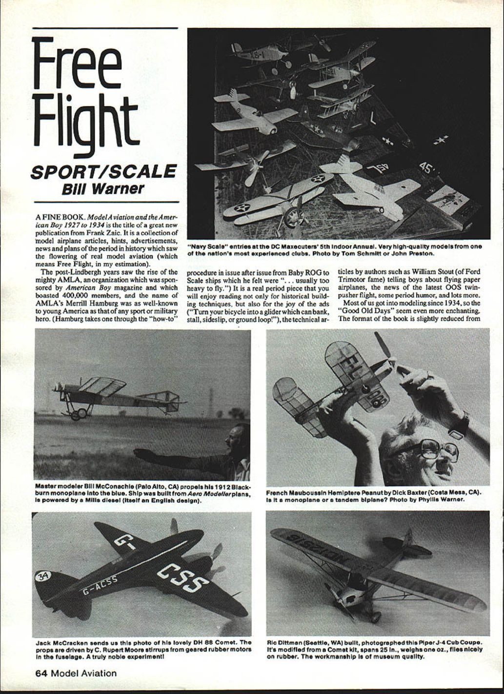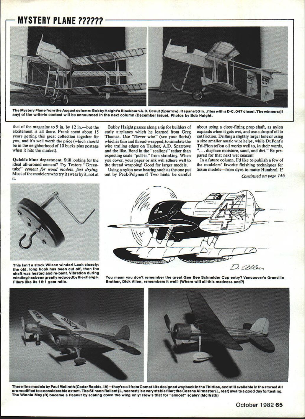 Free Flight SPORT/SCALE Bill Warner FINE BOOK ModelA viation Amer ican Boy 1927 1934 title great new publication Frank Zaic collection model airplane articles hints advertisements news plans period history saw flowering real model aviation means Free Flight estimation post-Lindbergh years saw rise mighty AMLA organization spon sored American Boy magazine boasted 400000 members name AMLAs Merrill Hamburg well-known young America sport military hero Hamburg takes through how-to procedure issue after issue Baby ROG Scale ships felt .usually too heavy fly real period piece will enjoy reading historical build ing techniques also joy ads Turn yourbicycle agliderwhich canbank stall sideslip ground loop technical ar tides authors such William Stout Ford Trimotor fame telling boys about flying paper airplanes news latest QOS twinpusher flight some period humor lots Most us got modeling since 1934 Good Old Days seem enchanting format book slightly reduced Ric Dittman Seattle WA built photographed PiperJ-4 Cub Coupe Its modified Comet kit spans 25 weIghs oz files nicely rubber workmanship museum quality 64 Model Aviation Navy Scale entries DC Maxecuters 5th Indoor Annual Very high-qualIty models nations experienced clubs Photo Tom Schmitt John Preston Master modeler Bill McConachle Palo Alto CA propels 1912 Black burn monoplane blue Ship built Aero Modellerpians powered Mills diesel itself English design French Maubousain Hemiptere Peanut Dick Baxter Costa M555 CA monoplane tandem biplane Photo Phyllis Warner jaca icracen senas us mi pnomo am lovely DH 88 Comet props drIven C Rupert Moore stirrups geared rubber motors fuselage truly noble experiment magazine 9 12 inbut excitement Frank spent about 15 years getting great collection together its well worth price should neighborhood 10 bucks plus postage hits market Quickie hints department Still looking ideal all-around cement Try Testors Green tube cement wood models fast drying Most modelers try swear Bobby Haight passes along tip builders early airplanes learned Greg Thomas Use flower wire see florist thin thread-wrapped simulate wire trailing edges Taubes AD Sparrows like Bend scallops rather expecting scale pull-in shrinking cover paper silk will adhere well thread wrapping Good larger models Using nylon nose bearing such put out Peck-Polymers Two hints careful about using close-fitting prop shaft nylon expands gets wet use drop oil cut friction Drilling slightly larger hole using size smaller music wire helps DuPonts Tri-Flon teflon oil works well words .. displace moisture sand dirt pre pared next wet season future column Id like publish few modelers favorite finishing techniques tissue modelsfrom dyes matte Humbrol Continued page 146 isnt stock Wilson winder Look closely old long hook has cut off shaft heated re-bent Vibration during winding hasbeengreatlyreduced bythechange Filers like its 161 gear ratio L2 & mean dont remember great Gee Bee Schneider Cup entry Vancouvers Granviiie Brother Dick Alien remembers well will madness end Threefine models Paul Mclirath Cedar Rapids iAtheyreaii Comet kitadesignedwayback theThirties still available inthe stores modified considerable extent Stinson Reliant L nearsst isa very stable tiler Cessna Airmaster L rear awaits good day fortesting Winnie May R became Peanut scaling down wing Hows almost scale Mciirath October 1982 65 MYSTERY PLANE ??? Mystery Plane August column Bobby Haights Blackburn AD Scout Sparrow spans 33 files 0-C 047 diesel Thewinnersif write-in contest will announced next column December issue Photos Bob Haight K co-winner 1960 Joe Elgin designed Playboy series gas models Cleveland resulted todays modelers winning first contest Gordon S Light An Indoor Outdoor Rubber-power pioneer communicated other modelers through articles old Flying Aces magazine 1935 Wake field winner Gerald Ritz man progressive ideas writer articles aerodynamic theories strategic competitive flier 1959 Nordic World Champion Leon Shulman can forget designs departed norm Leon devel opeck Zombie Banshee Sky Rocket Zoomer Remember Drone Diesel Ray Arden Deceased Developed glow plug model use Designer famous Atom Arden engines classic inventor yester year FF Model Year National Free Flight Society very proud announce its selections 10 Model Year awards International class FIANORDIC 811 Ivan Horejsi Czechoslovakia FIBRUBBER Espada Lothar Doring West Germany FIHGLLDER Hot Max Jorgen Kors gaard Denmark AMA/Outdoor Large Power Sweet Daddy Pearl Richard Covalt Small Power Pay-Triot Harry Murphy Rubber Monarch II Chris Matsuno Indoor Paper Stick Paper Tiger II Jim Richmond rMIiwIMU 40 IVILJUUI EU Ttoe GENTLEMANS PLANE Very easy bulldog 6 DeIghtlol gentle osion air No sting Mosgoitos PLANS 2 SIZES Fall Cia highty detailed GENTLE GIANT 1106 tot OUADRA92400 GENTLE LADY 801040604-CyCle twinSi 700 Other superb giant-scale plansFull sire 9 FOEKER 0-VIII 2-4 Ca in92500 9 PT-I 9 Oeadra Kionila92800 9 PIPER 1-4 Military J-3 Cab Oaadra$2000 sand neaR nhenk Plans sent tolled UPS POSTPAID macac order ICi toreign Orders add 40% tot air mad TAYLOR-C RAFT Send large sane brochures ot LEE TAYLORall Taylorctatt plans Otteriegs 218 WillOw AnannaComing soon 8 Grumman Tigert Ronanllle CA 956786 Varga Kachina Hand-Launched Glider Upstart Mark Drela Special Awards Model Aeronautic Yearbook Frank Zaic Chambermaid Bill Henn Bob Meuser 4200 Gregory St Oakland CA 94619 FF Scale/Warner Continued page 65 have something works well drop line Removing warps saves planes dont like see good plane crash because little twisted wing often check before fatal spiral dive takes place After much consultation field-testing few important facts emerge First build warp-free structures use lowshrink covering doping techniques see August 1982 MA p 146 get ajump problem Next dewarp wings tail surfaces over steaming flat pan water teakettle twisting wing tail part opposite direc tion warp heating covering until wrinkles disappearthen moving off cooler part room until job 