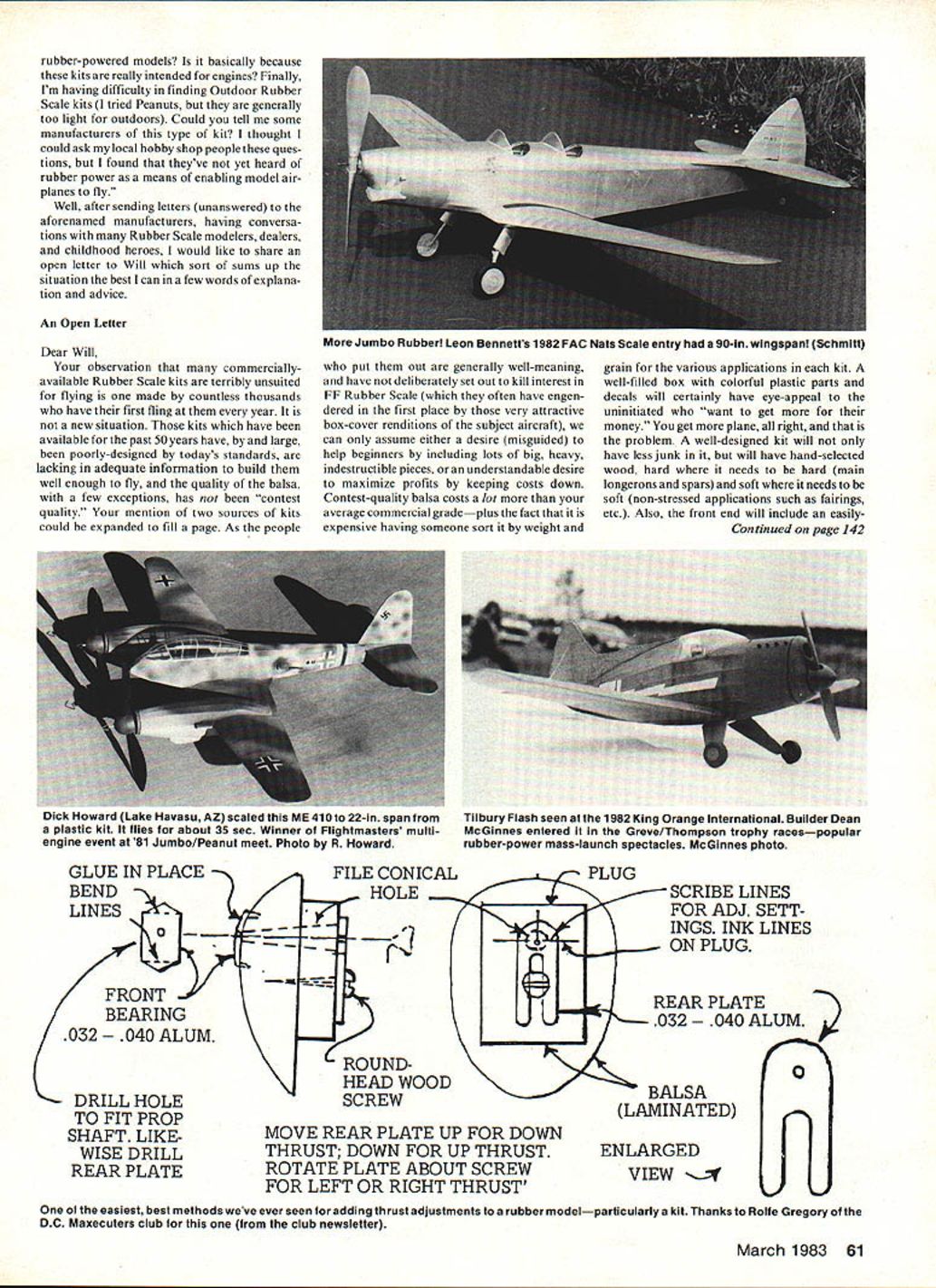 Free Flight SPORT/SCALE Bill Warner COUPLE months ago got letter seemed deserve casual reply Will Volny Jr Palatine IL town known its Free-Flight Scale activity Having gone through similar situation years ago feel questions point reasons FE Scale has grown larger has Ill bet 99 Out 100 kids boys least have tried build have built FE Scale rubber model 85 never finished flown according representative largest kit makers country would guess remaining few percent probably less ever experienced heady delights consistent success tiny fraction number becomes hooked degree Flying Aces Clubster say rest interested feel can never real/c succeed fault neednt go again think Will has focused attention kits time being Heres Will limited knowledge Rubber Scale Ive just begun interest seems Gui/low Sterling outdoor rubber-powered kits terribly unsuited rubber unless drastically lightened true true kitted Its rumored Dick Allen trying interest movie producer remake famous gorilla flickguess 60 Model Aviation win fascination about moaeis powerea ny twisted elastic bandsespecially -theyre big ones Gordon Roberts Jumbo Scale Chambermaid won Greve Trophy event Flying Aces Club Nats 1981 Hes Ohio Photo Tnm Schmitt noiner umbo Rubber jobmis uienny ana nenoerson moaei won I-AU urana National Chamolon award Dave Rees 1982 Photo Tom Schmitt rubber-powered models basically because kits really intended engines Finally Im having difficulty finding Outdoor Rubber Scale kits tried Peanuts generally too light outdoors Could tell some manufacturers type kit thought could ask local hobby shop people ques tions found theyve yet heard rubber power means enabling model air planes fly Well after sending letters unanswered aforenamed manufacturers having conversa tions Rubber Scale modelers dealers childhood heroes would like share open letter Will sort sums up situation best can few words explana tion advice An Open Letter Dear Will observation commerciallyavailable Rubber Scale kits terribly unsuited flying made countless thousands have first fling year new situation kits have available past 50 years have large poorly-designed todays standards lacking adequate information build well enough fly quality balsa few exceptions has no contest quality mention two sources kits could expanded fill page As people put out generally well-meaning have deliberately set out kill interest FF Rubber Scale often have engen dered first place very attractive box-cover renditions subject aircraft can assume either desire misguided help beginners including lots big heavy indestructible pieces understandable desire maximize profits keeping costs down Contest-quality balsa costs 1w average commercial gradeplus fact expensive having someone sort weight grain various applications kit well-filled box colorful plastic parts decals will certainly have eye-appeal uninitiated want get money get plane right problem well-designed kit will have less junk will have hand-selected wood hard needs hard main longerons spars soft needs soft non-stressed applications such fairings etc Also front end will include easilyContinued page 142 GLUE IN PLACEFILE CONICAL BEND E LINES0 040 ALUM BEARING\IIYW ROUNDHEAD WOOD L HOLESCREW TO FIT PROP SHAFT LIKE WISE DRILL REAR PLATE SCRIBE LINES FOR ADJ SETT INGS INK LINES REAR PLATE 032 ALUM C LAMINATED MOVE REAR PLATE UP FOR DOWN Al THRUST DOWN FOR UP THRUSTENLARGED J ROTATE PLATE ABOUT SCREWVIEW FOR LEFT OR RIGHT THRUST easiest best methods weve ever seen adding thrust adjustments rubber modelparticularly kit Thanks Rolfe Gregory DC Maxecuters club club newsletter March 1983 61 Jumbo Rubber Leon Bennetts 1982 FAC Nats Scale entry 90-in wingspan Schmitt Dick Howard Lake Havasu AZ scaled ME 410 22-in span Tilbury Flash seen 1982 King Orange International Builder Dean plastic kit flies about 35 sec Winner Flightmasters multi- McGinnes entered Greve/Thompson trophy racespopular engine event 81 Jumbo/Peanut meet Photo R Howard rubber-power mass-launch spectacles McGinnes photo SUPER MINI-BOY VIDtO MINIATURE AIRCRAFT SUPPLY BRINGS YOU ANOTHER HELICOPTER FIRST Professionally produced video takes workshop professionally build set up flight trim mini-boy includes step step building parts Iden tIfication mechanical operational walk through radio installation balancing bench setup operational flight trimming aerobatics vIdeo better having someone else build Mini-Boy Video produced Mike Mas National Helicopter Champion Available ary 1963 BETA VHS WE CAN SUPPLY ALL OF YOUR HELICOPTER NEEDS AT UNBEATABLE PIICESI Engines Worlds Strongest Epoxy Glues Radios MIni-Boy Competition Pack Mufflers Training Aids Custom Carburators Video Cassettes Gyros CompetItor Symetrical Main Tall-Roter Blades Specially Designed Eliminate Jumpy Jerks Cricket Building Setup FlyIng VIdeo Mike Mas 5 Plus Shipping Training Stands Wide-Landing Gear Float Kits Helicopter Tools MOVE UP TO SCHLUTER See Dealer Call MINIATURE AIRCRAFT SUPPLY 2594 North Orange Blossom Trail ndo FL 32804 e 305 422-1531 aerodynamics area must much thoroughly investigated understood before modelers can build truly ultimate machine FF Sport-Scale/Warner Continued page 61 removable thrust-adjustable noseblock designed plan What good well-built light model cant easily stretch-wound no provision shim thrust-line adjustments about half secret getting fly well large perentage modelers asked suggested after gets some experience simple ROG models starting allsheet Sleek Streek working up through simple types like Peck ROG Lacey M-l 0 Peanut kit Peck Polymers has minimum curves will outfly larger scale jobs ready look over offerings Flrline Golden Age Reproductions Send Golden Age catalog about four bucks last time got will go bananas oldies goodies simple addition music wire old balsa bamboo undercarriages rear motor peg instead cute little interior hooks used have good nose plug see p38 Bill Hannans Peanut Power book available Peck business Golden Age catalog chock full photoreproductions half-page f