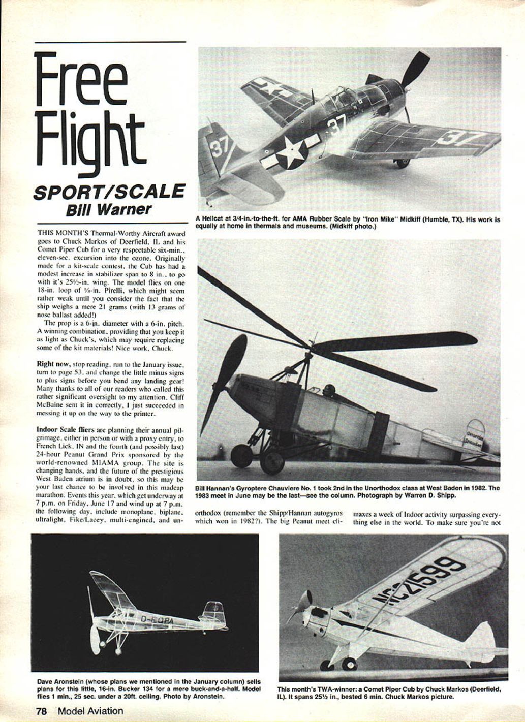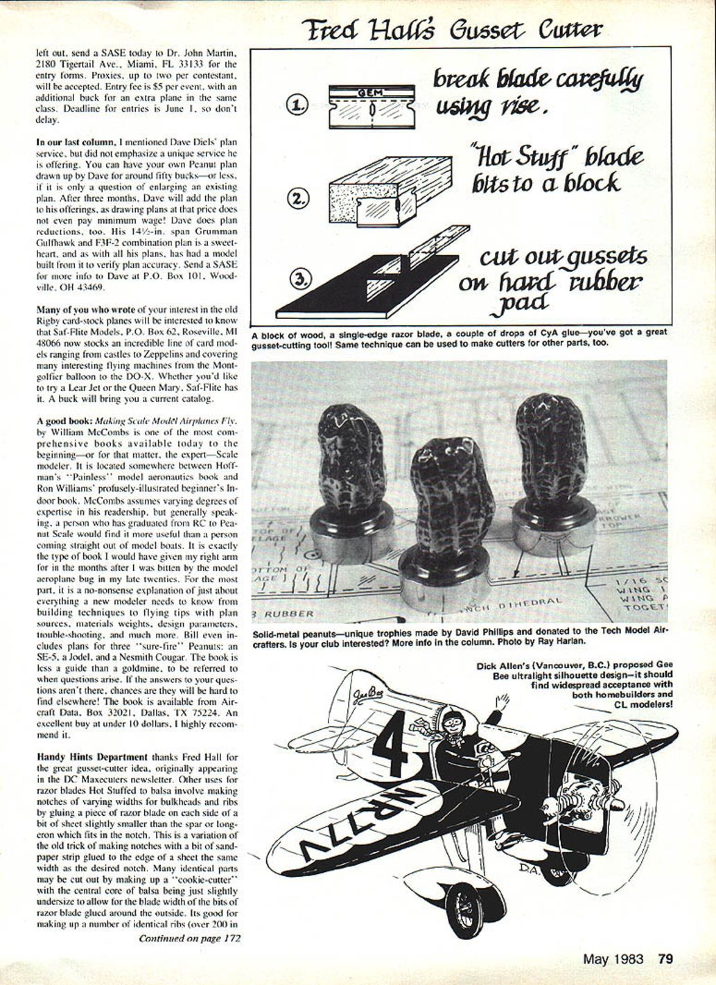 Free Flight SPORT/SCALE Bill Warner THIS MONTHS Thermal-Worthy Aircraft award goes Chuck Markos Deerfield IL Comet Piper Cub very respectable six-mm eleven-sec excursion ozone Originally made kit-scale contest Cub has modest increase stabilizer span 8 in. go its 25/2-in wing model flies 18-in loop A-in Pirelli might seem rather weak until consider fact ship weighs mere 21 grams 13 grams nose ballast added prop 6-in diameter 6-in pitch winning combination providing keep light Chucks may require replacing some kit materials Nice work Chuck Right now stop reading run January issue tum page 53 change little minus signs plus signs before bend landing gear thanks readers called rather significant oversight attention Cliff McBaine sent correctly just succeeded messing up way printer Indoor Scale fliers planning annual pil grimage either person proxy entry French Lick IN fourth possibly last 24-hour Peanut Grand Prix sponsored world-renowned MIAMA group site changing hands future prestigious West Baden atrium doubt may last chance involved madcap marathon Events year get underway 7 pm Friday June 17 wind up 7 pm following day include monoplane biplane ultralight Fike/Lacey multi-engined onorthodox remember Shipp/Hannan autogyros won 1982 big Peanut meet climaxes week Indoor activity surpassing thing else world make sure youre 78 Model Aviation Hellcat 3/4-In-to-the-ft AMA Rubber Scale Iron Mike Midkift Humble TX work equally home thermals museums Midkiff photo Bill Hannans Gyroptere Chauviere No 1 took 2nd Unorthodox class West Baden 1982 1983 meet June may lastsee column Photograph Warren D Shipp Dave Aronstein plans mentioned January column sells plans little 16-in Bucker 134 mere buck-and-a-half Model flies 1 mm 25 sec under 20ff ceiling Photo Aronstein months TWA-winner Comet Piper Cub Chuck Markos Deerfield IL spans 25 bested 6 mm Chuck Markos picture left Out send SASE today Dr John Martin 2180 Tigertail Ave Miami FL 33133 entry forms Proxies up two per contestant will accepted Entry fee $5 per event additional buck extra plane same class Deadline entries June dont delay last column mentioned Dave Diels plan service did emphasize unique service offering can have own Peanut plan drawn up Dave around fifty bucksor less question enlarging existing plan After three months Dave will add plan offerings drawing plans price does pay minimum wage Dave does plan reductions too 14-in span Grumman Gulfhawk F3F-2 combination plan sweet heart plans has model built verify plan accuracy Send SASE info Dave PO Box 101 Wood ville OH 43469 wrote interest old Rigby card-stock planes will interested know Saf-Flite Models PO Box 62 Roseville Ml 48066 now stocks incredible line card mod els ranging castles Zeppelins covering interesting flying machines Mont golfier balloon DO-X Whether youd like try Lear Jet Queen Mary Saf-Flite has buck will bring current catalog good book Making Scale MadsI Airplanes F/v William McCombs com prehensive books available today beginningor matter expertScale modeler located somewhere between Hoff man s Painless model aeronautics book Ron Williams profusely-illustrated beginners door book McCombs assumes varying degrees expertise readership generally speak ing person has graduated RC Pea nut Scale would find useful person comtng straight out model boats exactly type book would have given right arm months after bitten model aeroplane bug late twenties part no-nonsense explanation just about everything new modeler needs know building techniques flying tips plan sources materials weights design parameters trouble-shooting much Bill cludes plans three sure-fire Peanuts SE-S Jodel Nesmith Cougar book less guide goldmine referred questions arise answers ques tions arent chances will hard find elsewhere book available Air craft Data Box 32021 Dallas TX 75224 An excellent buy under 10 dollars highly recom mend Handy Hints Department thanks Fred Hall great gusset-cutter idea originally appearing DC Maxecuters newsletter Other uses razor blades Hot Stuffed balsa involve making notches varying widths bulkheads ribs gluing piece razor blade side bit sheet slightly smaller spar long eron fits notch variation old trick making notches bit sand paper strip glued edge sheet same width desired notch identical parts may cut out making up cookie-cutter central core balsa being just slightly undersize allow blade width bits razor blade glued around outside Its good making up number identical ribs over 200 Continued page 172 Tred2 Hw Guset Ccurer block wood single-edge razor blade couple drops CyA glueyouve got great gusset-cutting tool Same technique can used make cutters other parts too May 1983 79 break bade carefis{4j se IIorSu ba4e btsto a-btoc-k cuS ougussets o fiavf n6ber yaff r Solid-metal peanutsunique trophies made David Phillips donated tne iecn Moaet Air crafters club interested info column Photo Ray Harlan Dick Allens Vancouver BC proposed Gee Bee ultralight silhouette designit should find widespread acceptance 11/4both homebuilders CL modelers -A eft t1 tdsi 0 CO spraY gut CO hats off cant ship until get order Choose design red RJ black BJ royal blue DJ sky blue SI caps fits Only $6 postpaid 4 $20 Christen Eagle BCE Corsair BF4Fortress B17 Lightning B38Liberator B24 Warhawk B40Mitchell B25 Mustang B51Superfortress B29 Spitfire BSPPhantom BP4 Sabre B86Tomcat B14 Dozens catalog send SASE Send check money order Flightilne Shirts Etc Department MA P0 Box 512 Pleasanton CA 94566 Name Address tacular flights girl launched plane south end very large school ground caught thermal flew completely across school yard over several trees down street probably went 400 yards some planes stayed up over minute still remember look disbelief face teen-age boy watched plane fly on Evidently never built plane would fly like fore could get over t think worth extra trouble get planes fly well should give time energy Most us captivated beauty flightthis hobby need share thrill joy know have done just about everythi