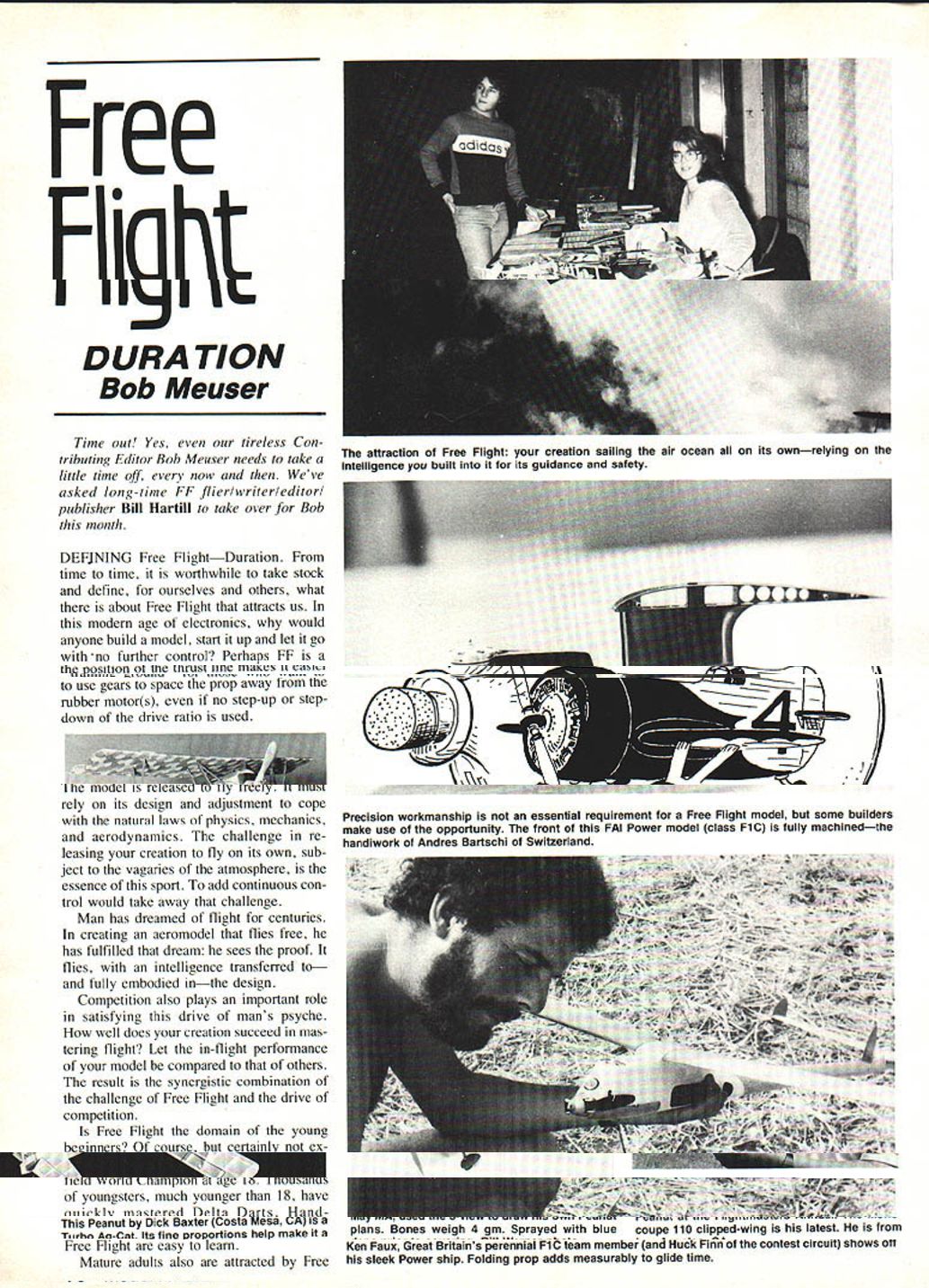 Free Flight SPORT/SCALE Bill Warner MULTIPLE monkey-motion contraptions gearboxes nothing new modelers can shorten space required rubber motor having two short motors driving same prop instead long reduces harmonic vi bration makes easier keep models CG belongs thing runs down Small props short landing gear props clearance problems nacellemountings beside above fuselage can spun higher speeds usual 11 Models huge cowls like Gee Bees might benefit slower-than-normal spinning large prop some models position thrust line makes easier use gears space prop away rubber motors no step-up stepdown drive ratio used little-appreciated feature geared setups lack rearward tension prop pull motor being taken up gear fixing allows easy zEE BEY IN first contact gear drives tiny unit Frog Interceptor wellknown British model indoor Australian cropduster would break 15 sec Dont laugh Bill Warner once built Cassutt Racer light bulb Art Dick Allen change props may threaded held bit tubing once driving pin other arrangement engages rear prop hub threaded nut spinner Look familiar Bill liked Zippy Sport May MA used 3-view draw own Peanut plans Bones weigh 4 gin Sprayed blue dope prior covering Bill Warner photo Lisa Adkins Ii attends James -ora noaes High School Cleveland OH shes seen assisting CDs table during Cleveland Free Flight Society Indoor Contest last February 20 Young man left Mike Peres Junior entrant Meet Estabrook Recreation Center e-winning Fokker D7 Michael C Zand secretary-treasurer Cleveland Free Flight Society Took 1st Mass-Launch Rubber Scale plus best paint finish Free Flight 32nd National Model Plane Show held Clevelands Randall Park Mall oTrL~ Peanut Dick Baxter Costa Mesa CA Turbo Ag-Cat Its fine proportions help make great flier Plc Bill Warner Richard Mora long-time associate Bill Warner As 13-year-old 1981 won Open Peanut Flightmasters Annual Mono coupe 110 clipped-wing latest Los Angeles CA Figure 1 Rear chamber power mode Input below output prop above Figure 4 Front chamber hand winding Figure 2 Rear chamber freewheel mode high-revving little prop using nor would intercept frogs Before could experiment further different rubber prop combinations disappeared along model attached few years later moved desire build DH Leopard Moth scale short landing gear struts tried brass slotcar gears speeding prop up 21 drive two rubber motors fairly suc cessful extra work weight volved turned away gears until Bentom gearboxes made appearance nylon 21 boxes come two sizes larger installed rubberpowered Comper Swift Dennis Rattles plan Figure 3 Front chamber power freewbeel mode old Model Aircraft Again problem getting right rubber/prop combination reared its ugly head thirty seconds about could get before finally destroying plane adding too much power gearbox survived well however well give another go styrofoam models come equipped smaller Bentom unit fly well though would go far distributor claims double thrust 3O-min flights thermals plenty aplications smoothed-out power curve can give would Continued page 166 July 1983 71 Bentom Bi-Matic gearbox rubber-power comes two sizesthe larger shown automatically shifts gears wind rubber turning prop get 2 turns rubber 1 turn prop prop released prop goes 2 revs turn rubber series sketches below shows done photo R above shows box disassembled other photo L above shows snuggles nose Comper Swift Bill made Model Aircraft plan Bentoms off-center prop shaft neatly duplicates the Pobloy geared radial engine Photo Phyllis Warner Sketches Jim Algar text Terry Hall Santa Monica CA modified Sterling 51 winder accept counter looks like salvaged cassette tape player counter driven rubberband passing over set ply-and-balsa pulleys Hold plank between knees wind model B Warner Schmitt 11014 Marcliff Rd Rockville MD 20852 have another facet aero modeling fascination Give proxy contests try true remote-control flying Special thanks enthusiasts have organized directed supported events uplift spirit proxyflying throughout world FF Scale/Warner Continued oaoe 71 beneficial Jim Algar Editor Flightmasters monthly newsletter has studied Bentom Bi-matic box description helps HOBBYPOXY PRODUCTS a division Pettit Paint Company Inc 10 Pine Street Box 378 Rockaway NJ 07866-0378 make sense out what goes inside First front rear chamber slip-gear engages direc tion thereby allowing free-wheeling front chambers gears hand-winding model designed likes us use rubber winders give 11 putting winds During prop run rear chamber comes play drives prop twice turn motor front gears just going along ride disengagement mode drawing Figure 1 shows C rubber attached drives slipgear B length its slot propshaft gear Figure 2 shows what happens gears rubber has done its job Figure 3 helps see front slip-gear during no-power mode Fi nally Figure 4 cranking prop gear D drives slip-gear engagement rubber motor gear F about ready fly again fact gearbox will shift gears playing around manage turn 900 50 slip-gears gravity-operated does mean shifts flight Still would nice could made wouldnt California Model lmprts PO Box 1695 Garden Grove CA 92642 distributes Bentom large unit $495 small $995 small since has styrofoam ready-made plane attached Let us know gearboxes perform models Handy Hints department includes using butyrate dope thinner shrink Micro lite windows next superlight Indoor model Dick Baxter tried 4-gram LET XZ 37-7 Indoor Peanut works great Terry Hall has seen Revere JHS Sunday Indoor meets Sterling winder counter set-up using drive disc just behind hook turn counter via rubber belt wooden mounting winder can held between knees thereby allowing wind others too busy hold model Nick DeCarlis made up couple years back cheap pocket calculator its plus button hit once turn cam Yesterday May 1983 issue Model Aviation arrived enchanted little Zippy Sport article three-view day vacation left decided draw up Peanut build possible have done include column Well gang may able build normal Peanut plan day go