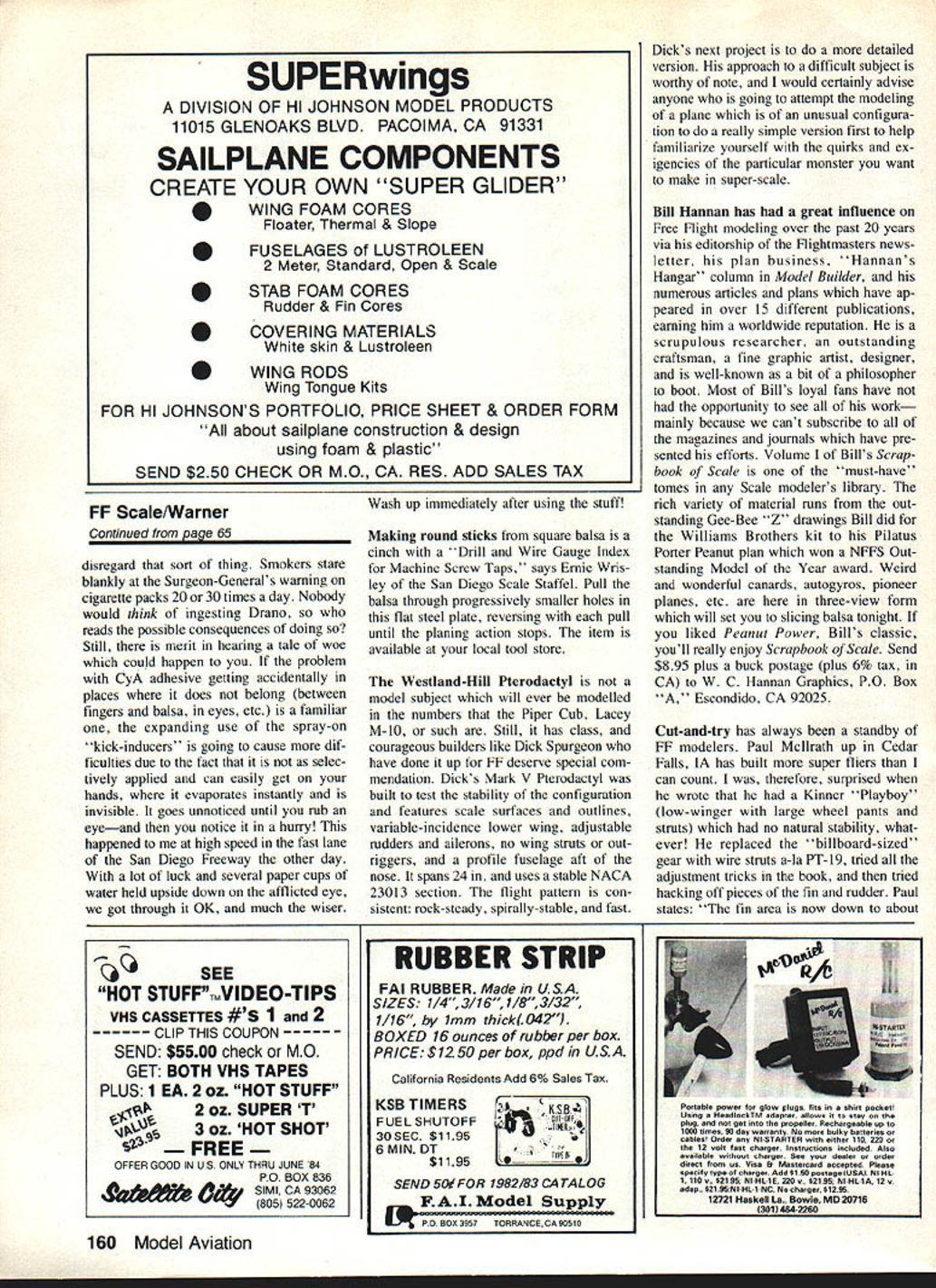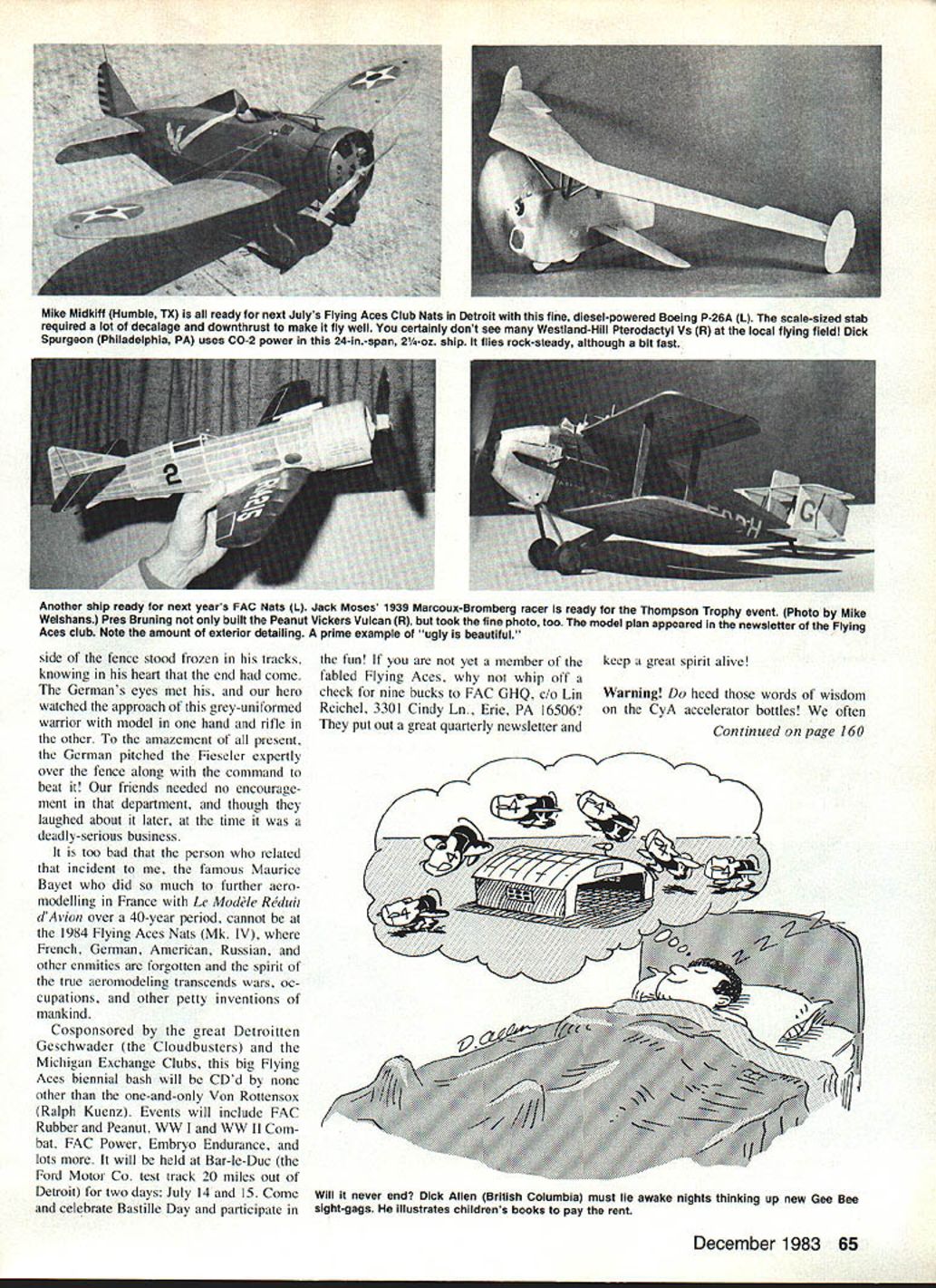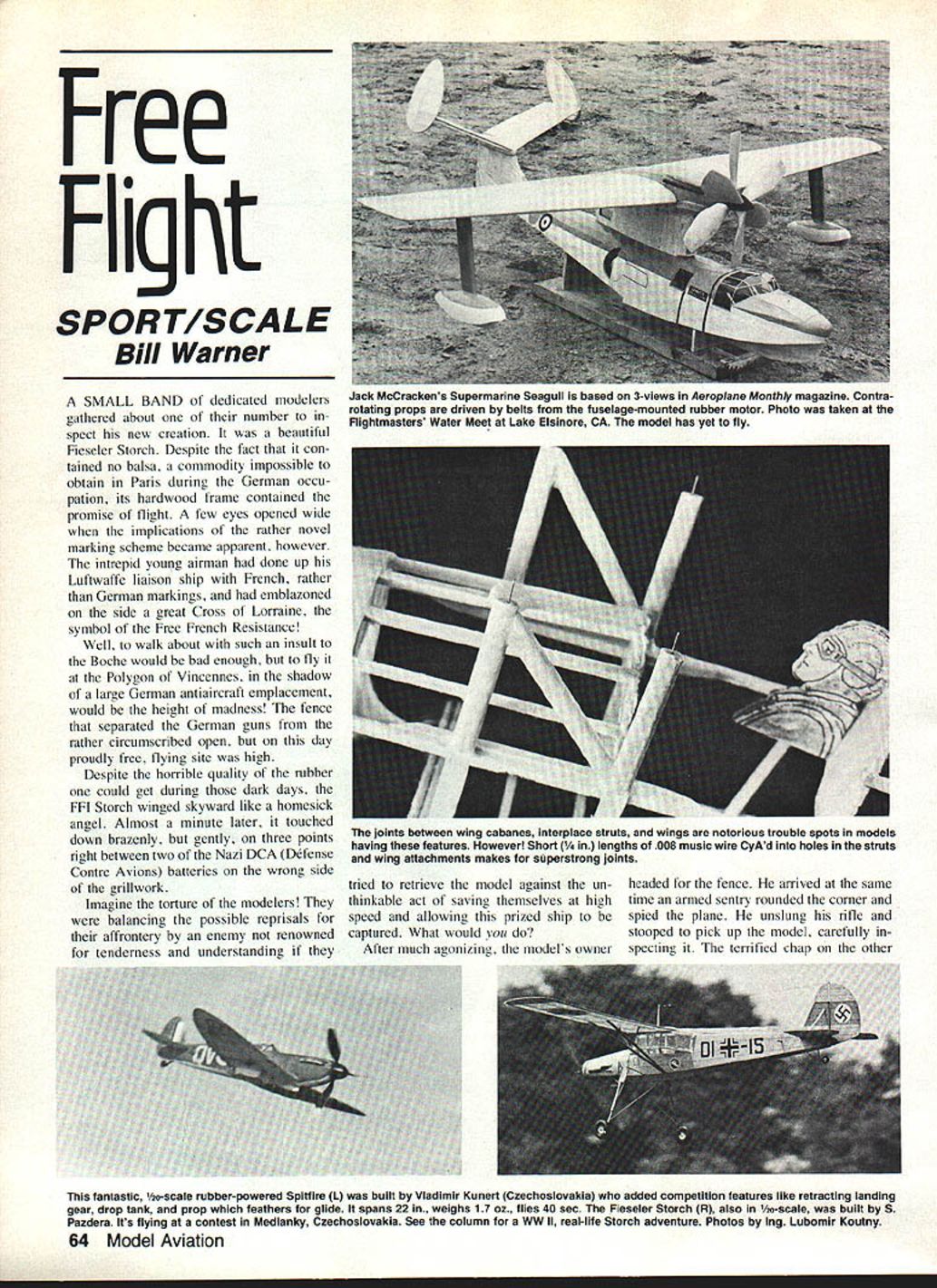 Free Flight SPORT/SCALE Bill Warner SMALL BAND dedicated modelers gathered about number spect new creation beautiful Fieseler Storch Despite fact con tained no balsa commodity impossible obtain Paris during German occu pation its hardwood frame contained promise flight few eyes opened wide implications rather novel marking scheme became apparent however intrepid young airman done up Luftwaffe liaison ship French rather German markings emblazoned side great Cross Lorraine symbol Free French Resistance Well walk about such insult Boche would bad enough fly Polygon Vincennes shadow large German antiaircraft emplacement would height madness fence separated German guns rather circumscribed open day proudly free flying site high Despite horrible quality rubber could get during dark days FF1 Storch winged skyward like homesick angel Almost minute later touched down brazenly gently three points right between two Nazi DCA Defense Contre Avions batteries wrong side grillwork Imagine torture modelers balancing possible reprisals affrontery enemy renowned tenderness understanding tried retrieve model against un thinkable act saving themselves high speed allowing prized ship captured What would After much agonizing models owner headed fence arrived same time armed sentry rounded corner spied plane unslung rifle stooped pick up model carefully specting terrified chap other Jack McCrackens Supermarine Seagull based 3-views Aeroplane Monthly magazine Contrarotating props driven belts fuselage-mounted rubber motor Photo taken Flightmasters Water Meet Lake Elsinore CA model has yet fly joints between wing cabanes interplace struts wings notorious trouble spots models having features However Short 1/4 lengths 008 music wire CyAd holes struts wing attachments makes superatrong joints fantastic o-scale rubber-powered Spitfire L built Vladimir Kunert Czechoslovakia added competition features like retracting landing gear drop tank prop feathers glide spans 22 weighs 17 oz flies 40 sec Fieseler Storch R also 1/2o-scale built S Pazdera Its flying contest Medlanky Czechoslovakia See column WW II real-life Storch adventure Photos Ing Lubomir Koutny 64 Model Aviation side fence stood frozen tracks knowing heart end come Germans eyes met hero watched approach grey-uniformed warrior model hand rifle other amazement present German pitched Fieseler expertly over fence along command heat friends needed no encourage ment department though laughed about later time deadly-serious business too bad person related incident famous Maurice Bayet did much further aero modelling France Le Mod1e R5duir dAvion over 40-year period cannot 1984 Flying Aces Nats Mk IV French German American Russian other enmities forgotten spirit true aeromodeling transcends wars oc cupations other petty inventions mankind Cosponsored great Detroitten Geschwader Cloudbusters Michigan Exchange Clubs big Flying Aces biennial bash will CDd other one-and-only Von Rottensox Ralph Kuenz Events will include FAC Rubber Peanut WW WW LI Com bat FAC Power Embryo Endurance lots will held Bar-le-Duc Ford Motor Co test track 20 miles out Detroit two days July 14 15 Come celebrate Bastille Day participate fun yet member keep great spirit alive fabled Flying Aces whip off check nine bucks FAC GHQ Lin Reichel 3301 Cindy Ln Erie PA 16506 put out great quarterly newsletter Warning heed words wisdom CyA accelerator bottles often Continued page 160 4 Will never end Dick Allen British Columbia must lie awake nights thinking up new Gee Bee sight-gags illustrates childrens books pay rent December 1983 65 Mike Midkift Humble TX ready next Julys Flying Aces Club Nats Detroit fine diesel-powered Boeing P-26A L scale-sized stab required lot decalage downthrust make fly well certainly dont see Westland-Hill Pterodactyl Vs R local flying field Dick Spurgeon Philadelphia PA uses CO-2 power 24-in-span 21/4-oz ship flies rock-steady although bit fast Another ship ready next years FAC Nats L Jack Moses 1939 Marcoux-Bromberg racer ready Thompson Trophy event Photo Mike Weishans Pres Bruning built Peanut Vickers Vulcan R took fine photo too model plan appeared newsletter Flying Aces club Note amount exterior detailing prime example ugly beautiful FF Scale/Warner Continued page 65 disregard sort thing Smokers stare blankly Surgeon-Generals warning cigarette packs 20 30 times day Nobody would think ingesting Drano reads possible consequences doing Still merit hearing tale woe could happen problem CyA adhesive getting accidentally places does belong between fingers balsa eyes etc familiar expanding use spray-on kick-inducers going cause dif ficulties due fact selec tively applied can easily get hands evaporates instantly invisible goes unnoticed until rub eyeand notice hurry happened high speed fast lane San Diego Freeway other day lot luck several paper cups water held upside down afflicted eye got through OK much wiser Wash up immediately after using stuff Making round sticks square balsa cinch Drill Wire Gauge Index Machine Screw Taps says Ernie Wris ley San Diego Scale Staffel Pull balsa through progressively smaller holes flat steel plate reversing pull until planing action stops item available local tool store Westland-Hill Pterodactyl model subject will ever modelled numbers Piper Cub Lacey M-10 such Still has class courageous builders like Dick Spurgeon have done up FF deserve special com mendation Dicks Mark V Pterodactyl built test stability configuration features scale surfaces outlines variable-incidence lower wing adjustable rudders ailerons no wing struts out riggers profile fuselage aft nose spans 24 uses stable NACA 23013 section flight pattern con sistent rock-steady spirally-stable fast Dicks next project detailed version approach difficult subject worthy note would certainly advise anyone going attempt modeling plane unusual configura tion really simple version first help familiarize yourself quirks ex igencies particular monster want make super-scale Bill Hannan has grea
