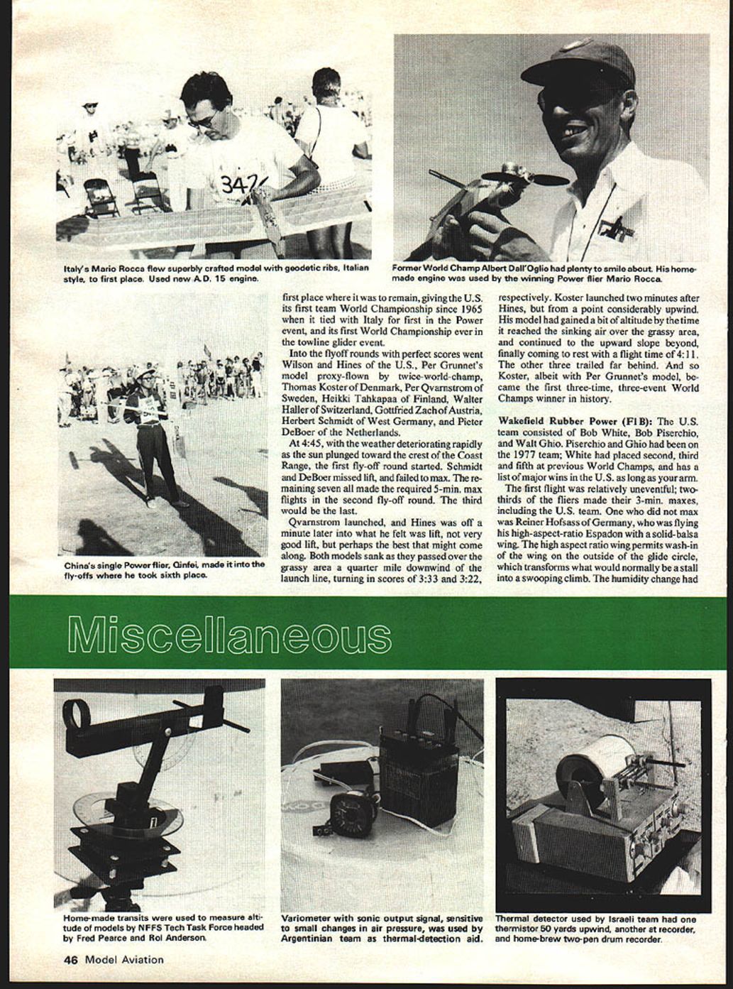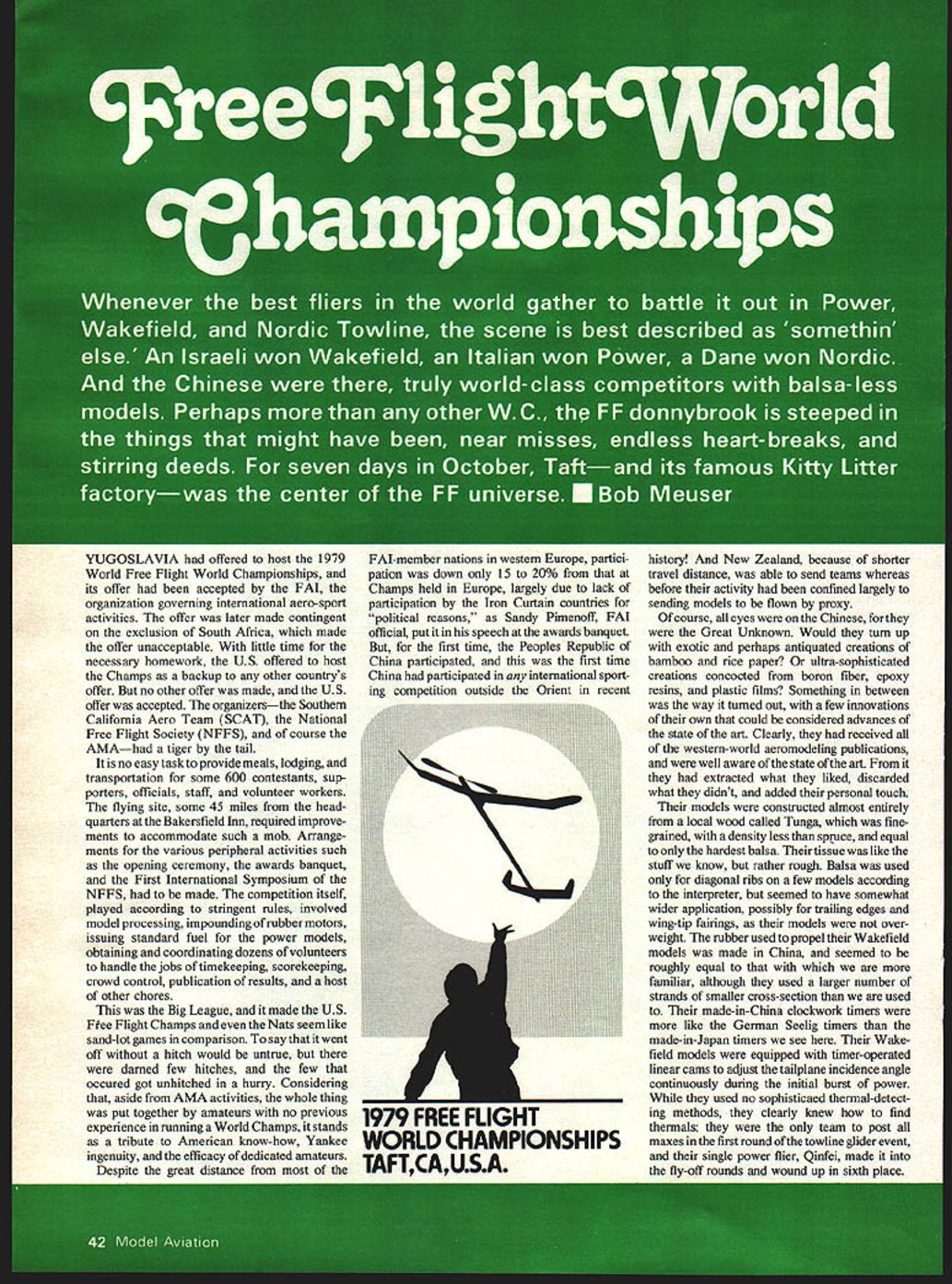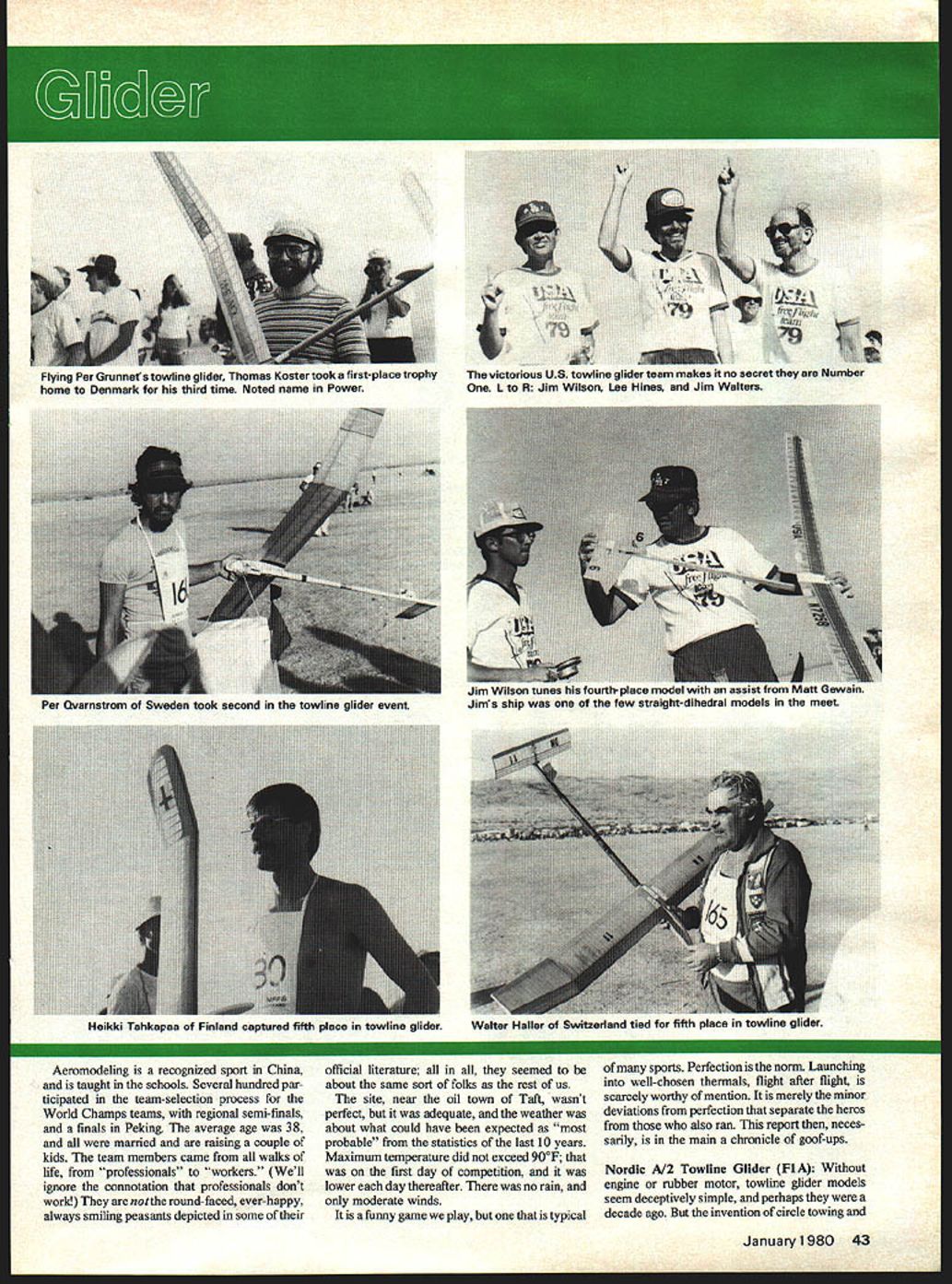 YUGOSLAVIA offered host 1979 World Free Flight World Championships its offer accepted FAI organization governing international aero-sport activities offer later made contingent exclusion South Africa made offer unacceptable little time necessary homework US offered host Champs backup other countrys offer no other offer made US offer accepted organizersthe Southern California Aero Team SCAT National Free Flight Society NFF S course AMAhad tiger tail no easy task provide meals lodging transportation some 600 contestants sup porters officials staff volunteer workers flying site some 45 miles head quarters Bakersfield Inn required improve ments accommodate such mob Arrange ments various peripheral activities such opening ceremony awards banquet First International Symposium NFFS made competition itself played according stringent rules involved model processing impounding rubber motors issuing standard fuel power models obtaining coordinating dozens volunteers handle jobs timekeeping scorekeeping crowd control publication results host other chores Big League made US Ftee Flight Champs Nats seem like sand-lot games comparison say went off hitch would untrue darned few hitches few occured got unhitched hurry Considering aside AMA activities whole thing put together amateurs no previous experience running World Champs stands tribute American know-how Yankee ingenuity efficacy dedicated amateurs Despite great distance FAI-member nations western Europe partici pation down 15 20% Champs held Europe largely due lack participation Iron Curtain countries political reasons Sandy Pimenoff FAI official put speech awards banquet first time Peoples Republic China participated first time China participated international sport ing competition outside Orient recent history New Zealand because shorter travel distance able send teams whereas before activity confined largely sending models flown proxy course eyes Chinese forthey Great Unknown Would turn up exotic perhaps antiquated creations bamboo rice paper ultra-sophisticated creations concocted boron fiber epoxy resins plastic films Something between way turned out few innovations own could considered advances state art Clearly received western-world aeromodeling publications well aware state art extracted what liked discarded what didnt added personal touch models constructed almost entirely local wood called Tunga fine grained density less spruce equal hardest balsa tissue like staff know rather rough Balsa used diagonal ribs few models according interpreter seemed have somewhat wider application possibly trailing edges wing-tip fairings models over weight rubber used propel Wakefield models made China seemed roughly equal familiar although used larger number strands smaller cross-section used made-in-China clockwork timers like German Seelig timers made-in-Japan timers see Wake field models equipped tinier-operated linear cams adjust tailplane incidence angle continuously during initial burst power used no sophisticaed thermal-detect ing methods clearly knew find thermals team post maxes first round towline glider event single power flier Qinfei made fly-off rounds wound up sixth place 1979 FREE FLK*IT WORLD CHAMPIONSHIPS TAFTCAUSA rer uvarnairom Sweaen TOOK secona towtine giiaer evem Aeromodeling recognized sport China official literature seemed ts Perfection norm Launching taught schools Several hundred par- about same sort folks rest us well-chosen thermals flight after flight ticipated team-selection process site near oil town Taft wasnt scarcely worthy mention merely minor World Champs teams regional semi-finals perfect adequate weather deviations perfection separate hems finals Peking average age 38 about what could have expected also ran report neces married raising couple probable statistics last 10 years sarily main chronicle goof-ups kids team members came walks Maximum temperature did exceed 900F life professionals workers Well first day competition Nordic A12 Towline Glider FIA Without ignore connotation professionals dont lower day thereafter no rain engine rubber motor towline glider models work notthe round-faced ever-happy moderate winds seem deceptively simple perhaps always smiling peasants depicted some funny game play typical decade ago invention circle towing January1980 43 1 Flying Per c3runnet towline glider Thomas Koster WOK Tirat-piace trophy home Denmark third time Noted name Power victorious US iowiine glider team manes ii no secret Number R Jim Wilson Lee Hines Jim Walters Heikki Tahkapaa Finland captured fifth place towline glider Walter Hailer Switzerland tied fifth place towirne giber Israeli flier Giora Hertsberg employed unique tail Hot sun exposed rubber can cause breakage common sight see helpers shading rubber slotted flap Wakefield jobs ways Roger Simpson shades Walt Ghio packs turns Wakefield 44 Model Aviation ustrien nuns acnaiiiei neu secona piace in nut ais qualified model found fraction OT gram under weight Tough break probably caused heat removing moisture Israeli flier ltzhak Ben-ltzhak winds winning Wakefield flight helper shades what looks like glider wing its envelope .n Uuradys tnrew prop oiaae auring second still managed second place US teams Bob erchlO winds hi ite-designel akefiel. model its rubber well-shaded against low slanting sun zoom launches Russians subse quent development throughout world has changed Trick mechanisms used actuate rudder sometimes horizontal tail three four positions corresponding different phases towing launching gliding Wings must strong enough support load 10 15 times weight model during zoom launch may have over 500 parts physical skill stamina required combination middle distance runner dancer expert recommends jogging backwards part physical conditioning routine US Team consisted Jim Wilson Lee Hines Jim Walters Wilson Hines have doing extremely well local competition have previously participated World Champs third member team have Bob Isaacson making 100% Southern Californi