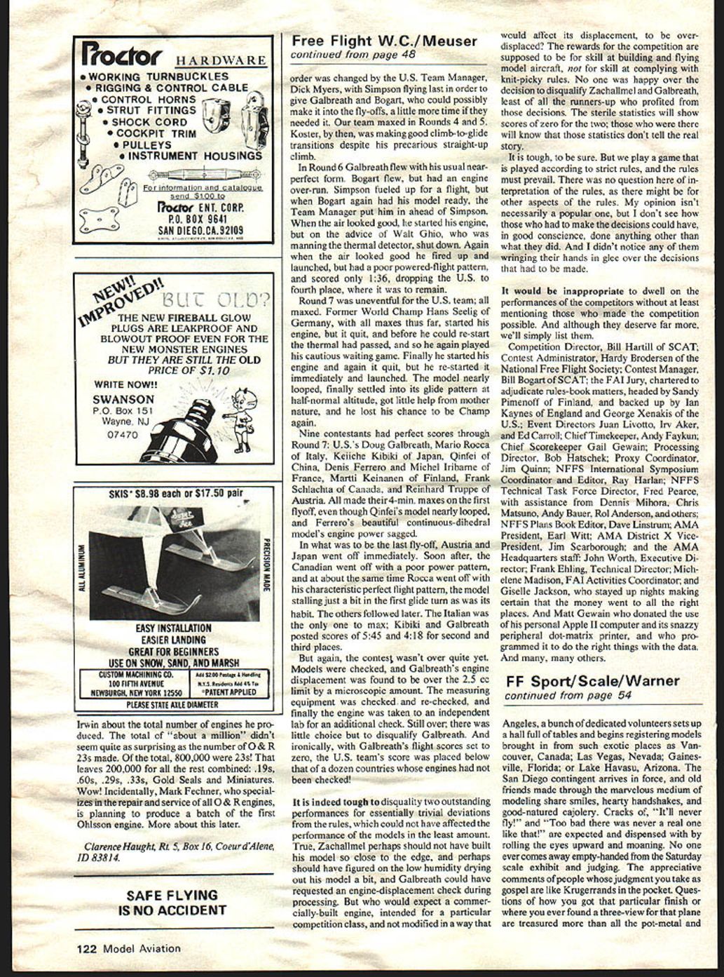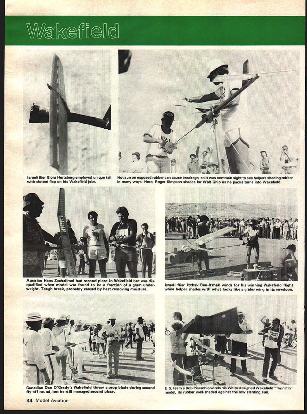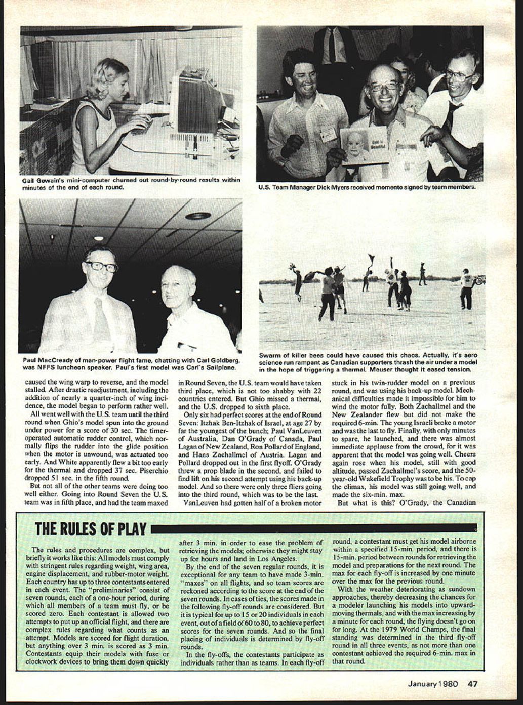 YUGOSLAVIA offered host 1979 World Free Flight World Championships its offer accepted FAI organization governing international aero-sport activities offer later made contingent exclusion South Africa made offer unacceptable little time necessary homework US offered host Champs backup other countrys offer no other offer made US offer accepted organizersthe Southern California Aero Team SCAT National Free Flight Society NFF S course AMAhad tiger tail no easy task provide meals lodging transportation some 600 contestants sup porters officials staff volunteer workers flying site some 45 miles head quarters Bakersfield Inn required improve ments accommodate such mob Arrange ments various peripheral activities such opening ceremony awards banquet First International Symposium NFFS made competition itself played according stringent rules involved model processing impounding rubber motors issuing standard fuel power models obtaining coordinating dozens volunteers handle jobs timekeeping scorekeeping crowd control publication results host other chores Big League made US Ftee Flight Champs Nats seem like sand-lot games comparison say went off hitch would untrue darned few hitches few occured got unhitched hurry Considering aside AMA activities whole thing put together amateurs no previous experience running World Champs stands tribute American know-how Yankee ingenuity efficacy dedicated amateurs Despite great distance FAI-member nations western Europe partici pation down 15 20% Champs held Europe largely due lack participation Iron Curtain countries political reasons Sandy Pimenoff FAI official put speech awards banquet first time Peoples Republic China participated first time China participated international sport ing competition outside Orient recent history New Zealand because shorter travel distance able send teams whereas before activity confined largely sending models flown proxy course eyes Chinese forthey Great Unknown Would turn up exotic perhaps antiquated creations bamboo rice paper ultra-sophisticated creations concocted boron fiber epoxy resins plastic films Something between way turned out few innovations own could considered advances state art Clearly received western-world aeromodeling publications well aware state art extracted what liked discarded what didnt added personal touch models constructed almost entirely local wood called Tunga fine grained density less spruce equal hardest balsa tissue like staff know rather rough Balsa used diagonal ribs few models according interpreter seemed have somewhat wider application possibly trailing edges wing-tip fairings models over weight rubber used propel Wakefield models made China seemed roughly equal familiar although used larger number strands smaller cross-section used made-in-China clockwork timers like German Seelig timers made-in-Japan timers see Wake field models equipped tinier-operated linear cams adjust tailplane incidence angle continuously during initial burst power used no sophisticaed thermal-detect ing methods clearly knew find thermals team post maxes first round towline glider event single power flier Qinfei made fly-off rounds wound up sixth place 1979 FREE FLK*IT WORLD CHAMPIONSHIPS TAFTCAUSA rer uvarnairom Sweaen TOOK secona towtine giiaer evem Aeromodeling recognized sport China official literature seemed ts Perfection norm Launching taught schools Several hundred par- about same sort folks rest us well-chosen thermals flight after flight ticipated team-selection process site near oil town Taft wasnt scarcely worthy mention merely minor World Champs teams regional semi-finals perfect adequate weather deviations perfection separate hems finals Peking average age 38 about what could have expected also ran report neces married raising couple probable statistics last 10 years sarily main chronicle goof-ups kids team members came walks Maximum temperature did exceed 900F life professionals workers Well first day competition Nordic A12 Towline Glider FIA Without ignore connotation professionals dont lower day thereafter no rain engine rubber motor towline glider models work notthe round-faced ever-happy moderate winds seem deceptively simple perhaps always smiling peasants depicted some funny game play typical decade ago invention circle towing January1980 43 1 Flying Per c3runnet towline glider Thomas Koster WOK Tirat-piace trophy home Denmark third time Noted name Power victorious US iowiine glider team manes ii no secret Number R Jim Wilson Lee Hines Jim Walters Heikki Tahkapaa Finland captured fifth place towline glider Walter Hailer Switzerland tied fifth place towirne giber Israeli flier Giora Hertsberg employed unique tail Hot sun exposed rubber can cause breakage common sight see helpers shading rubber slotted flap Wakefield jobs ways Roger Simpson shades Walt Ghio packs turns Wakefield 44 Model Aviation ustrien nuns acnaiiiei neu secona piace in nut ais qualified model found fraction OT gram under weight Tough break probably caused heat removing moisture Israeli flier ltzhak Ben-ltzhak winds winning Wakefield flight helper shades what looks like glider wing its envelope .n Uuradys tnrew prop oiaae auring second still managed second place US teams Bob erchlO winds hi ite-designel akefiel. model its rubber well-shaded against low slanting sun zoom launches Russians subse quent development throughout world has changed Trick mechanisms used actuate rudder sometimes horizontal tail three four positions corresponding different phases towing launching gliding Wings must strong enough support load 10 15 times weight model during zoom launch may have over 500 parts physical skill stamina required combination middle distance runner dancer expert recommends jogging backwards part physical conditioning routine US Team consisted Jim Wilson Lee Hines Jim Walters Wilson Hines have doing extremely well local competition have previously participated World Champs third member team have Bob Isaacson making 100% Southern Californi