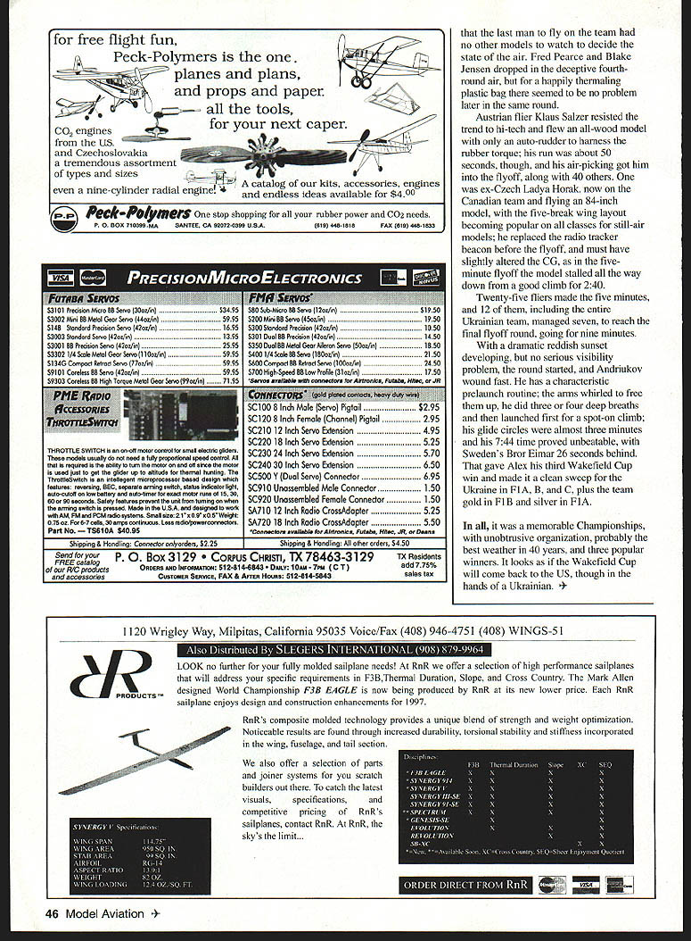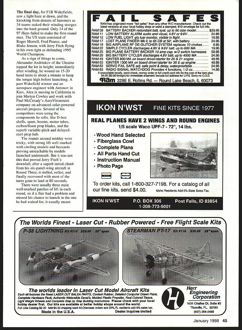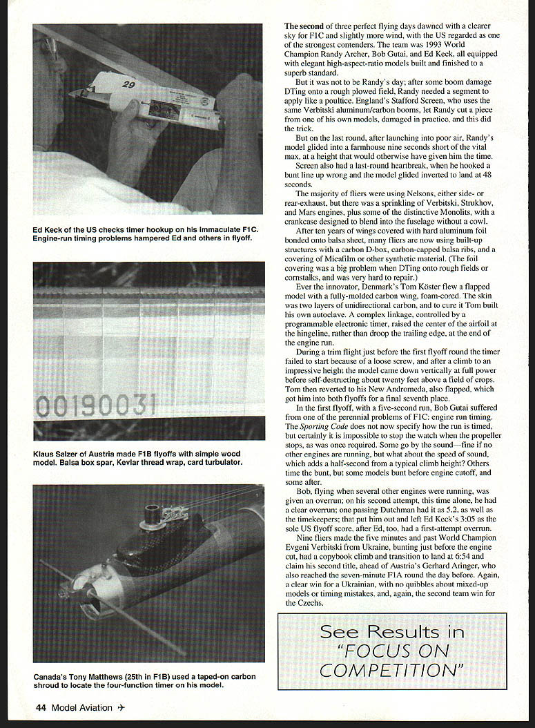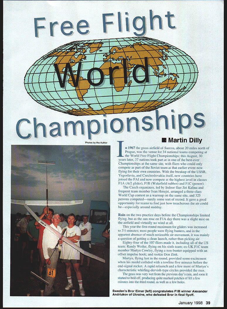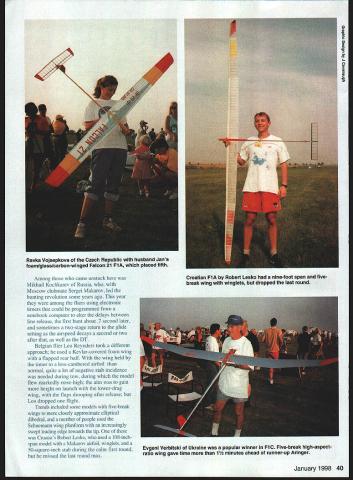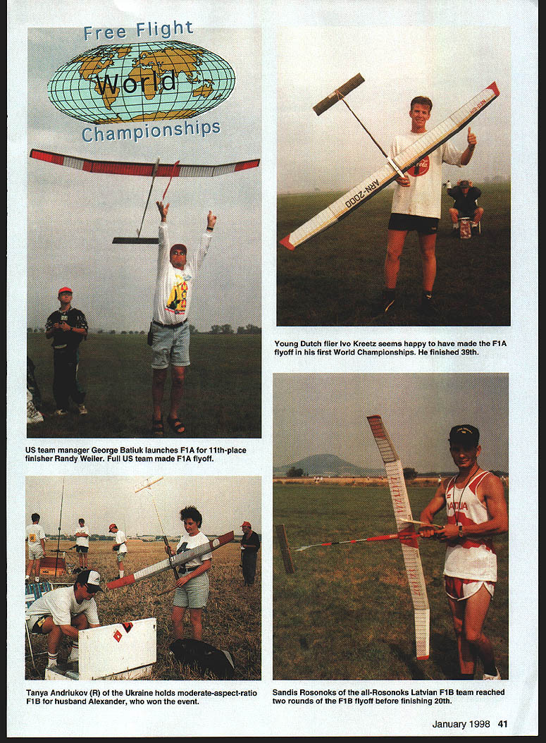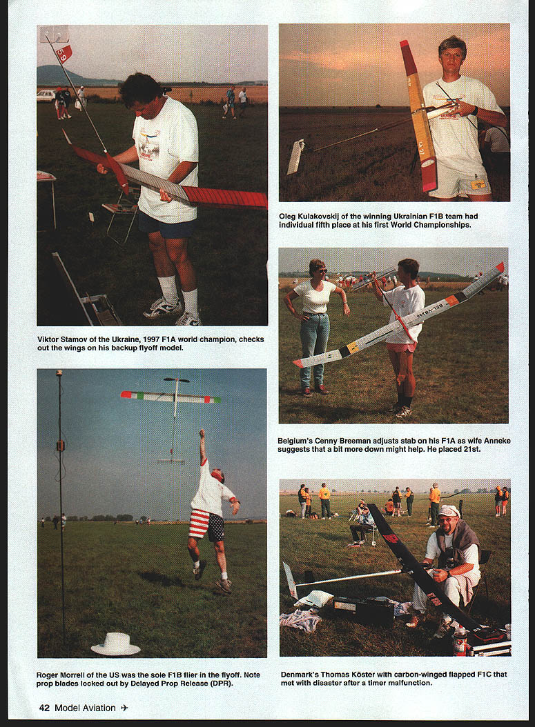 S 1967 grass airfield Sazena about 20 miles north Prague venue 34 national teams competing World Free Flight Championships August 30 years later 37 nations took part irt best-ever Championships same site fliers could compete part Soviet team earlier event now flying own countries breakup USSR Yugoslasia Czechoslovakia itself new countries have joined FAI now cotapete highest level classes FIA A12 glider FIB Wakefield rubber FIC power Czech organizers led Indoor flier Jiri Kalina hequent team member Ivan Horejsi arranged three-class World Cup contest warmup same site 325 persons competedsurel some sott record gave good opportunity teams titid just treacherous air could be-especially around midday Rain two practice days before Championships limited flying sun rose Fl lay slight mist airfield virtually no wind year lirst-rortnd maximum eliders increased 32 minutes people flying bunters apparent absence 01 much noticeable atr mos ement mainly question getting clean launch rather picking air Fiahtv-foor ot 107 fliers made including US teatn Randy Weiler flying sixth team ex-UK FIC team member Martyn Cowley living non-bunter equipped offset impulse hook rookie Don Zink N4art n flying last round pros ided some excitement model collided towline five minutes before end-signal rocket rapid relaunch few Martvns characteristic whirling- dervish-type circles pros ided max Fhe grass very wet pres ious days rain soon stailed boil oft producing quite marked patches lift few tainutes thii-d round well flw holes Swedens Bror Elmar left congratulates Fl B winner Alexander Andriukoy Ukraine defeated Bror final flyoff January1998 39 Free Champions Photos Author U Martin Dilly Among came unstuck Mikhail Kochkares Russia Moscow clubmate Sereet Makarov led bunting resolution some sears ago rhis year amone fliers using electronic timers could programmed notebook computer alter delays between line release first hunt about 7 second later sometimes two-stage return glide setting airspeed decays second two after thai sscll DT Belgian flier Lco Reynders took different approach used Keslar-covered foam xxmg flapped rear half wing held timer levcambered airfoil normal quite lot negative stab incidence needed during tow dutirig tuiodel flew markedl\ nose-high aini gain inure height launch lowerdrag wing flaps drooping alter release Leo dropped flight Trends included some models live-break wings closely approximate elliptical dihedral number people tised Schuemann wing planlbrm increasingly swept leading edge towards tip ssas Croitiis Ruben Lesko used 108inch span model Nlakaros airtoil wingiets 50squareinch stab during calm first round hut missed last round max January1998 40 Ravka Vojsepkova Czech Republic husband Jans foam/glass/carbon-winged Falcon 21 FlA placed fifth Croatian Fl Robert Lesko nine-foot span fivebreak wing winglets dropped last round Evgeni Verbitski Ukraine popular winner FiC Five-break high-aspectratio wing gave time 1 1A minutes ahead runner-up Aringer US team manager George Batiuk launches Fl 11th-place finisher Randy Weller Full US team made Fl flyoff Young Dutch flier Ivo Kreetz seems happy have made Fl flyoft first World Championships finished 39th 1d Tanya Andriukov R Ukraine holds moderate-aspect-ratioSandis Rosonoks all-Rosonoks Latvian Fl B team reached Fl B husband Alexander won eventtwo rounds Fl B flyoff before finishing 20th January 1998 41 Viktor Stamov Ukraine 1997 FlA world champion checks out wings backup flyoff model Roger Morrell US sole Fl B flier flyoff Note prop blades locked out Delayed Prop Release DPR Belgiums Cenny Breeman adjusts stab FlA wife Anneke suggests bit down might help placed 21st Denmarks Thomas Koster carbon-winged flapped FiC met disaster after timer malfunction 42 Model Aviation Kulakovskij winning Ukrainian Fl B team individual fifth place first World Championships 12 L4 Australias Phil Mitchell covered wing Icarex polyester cloth used boat sails originating Netherlands weighing 30 gm/rn2 heat-shrinkable contact-cement-stickable comes Day-Gb colors Pand nearly bulletproof Several Chinese gliders still orthodox models balsa D boxes non-bunt hooks extensive diagonal ribs both wings stabs Dutch flier Allard van Wallene finished third used 83 gm/rn2 carbon over Roofmate foam center panels plus high-modulus carbon spar built-up tips carbon D-box however center panel one-piece bolted fuselage tips joined about four inches inboard dihedral break via short carbon stub Though temperature rose through day often overcast very variable wind direction start Round Five four people towed once different directions After seven rounds five teams clean including US 48 fliers seven maxes welcome two-hour break before flyoff aim allowing thermal activity reduce start ten-minute slot fit fliers towed downwind find clear space circle away traffic Jiansheng Du China released within minute obviously good air nobody else spotted another model flew off line still attached Cowley stalled zoom launch Don Zink missed good air Randy Weiler survived second flyoff 24 others finally place eleventh just ahead 1995 World Champion Rudolf Holzleitner Ukraines Viktor Stamov Jeno Vdrds Hungary made seven minutes 8 pm towed man-on-man finish VdrCis flew 23-meter model Stamov relying lower-aspect-ratio CB6O equipped preprogrammed timer two-stage bunt transition Stamov got close circling opponent possibly increase pressure him Voros less-maneuverable model hit ground halfway through slot Relaunching released first Stamov launching same air later no visibility problem two models air clear Viktor Stamov modem FlAs consistent top-rankers 1997 World Champion landed 51 seconds ahead Hungarian team classification Czechs won Ukraine Netherlands following tiebreaking team results based lowest total members places rather flyoff aggregates put United States down second fourth January1998 43 Allard van Wallenes FlA has programmable electronic timer servo control bunt transition DT Gerhard Aringer Austria placed
