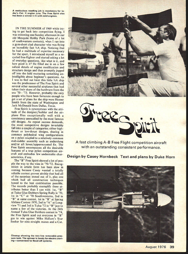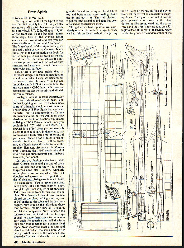 A meticulous needling job mandatory days Cat II engine runs Free Spirit also has winner C mild engines IN THE SUMMER 1969 try ing get back competition flying trimming Sunday afternoon old Mesquite Hobby Park home lot southwestern contests ran gym-short clad character flying incredibly fast ship Noticing multitude expertise necessary sport introduced myself re cycled free-fighter started asking lot everyday questions like what good filled few salient details engine modification structure design promptly jogged off field muttering something un intelligible about beginners questions As find out later little /2A ship predecessor Free Spirit several other successful airplanes taken share hardware era 70 73 However probably people have fortunate enough get set plans ship Homer Smith state Washington Jack McDonald Dallas Texas Free Spirit synonymous atti tude designer/builder air plane flies exceptionally well consistency unexcelled famous old designs As repeat success demands competitive designs invariably fall couple categories either highthrust low-thrust designs sharing common polyhedral wing configurations pylon coupled relatively common stab-rudder assembly such underslung and/or aft lower/uppermounted fin Free Spirit encompasses desirable features true pylon competition air craft embodies few undesirable char acteristics B Free Spirit showed lot peo ple way wins 70-72 Recog nition article form has slow coming because Casey wanted totally reliable contest proven airship surprises ironed out plus construction techniques honed best combination possible records probably exemplify tributes better can 1st B Tulsa Glue Dobbers Spring Rally 70 1st C 70 Southwesterns 2nd B same contest 1st B Spring Abilene Contest 19702nd Longview 71 3rd Tulsa 72 B just name few victories 24th Annual Tulsa Glue Dobbers contest 74 Free Spirit aced out everyone B gas win against Mike Hallums Star Seeker nine straight maxes Cat Closeup showing two-line removable pres sure tank spinner handy electric start ingconvenient flood-off systems fast climbing A-B Free Flight competition aircraft outstanding consistent performance Design Casey Hornbeck Text plans Duke Horn August1976 39 Free Spirit II time 2700 Nuf said big secret Free Spirit fact terribly fast partially owing 9% airfoil probably Hornbeck ST 23 howling out 19000 front end free-flight games days 80% winning factor comes short fast can close distance point point B fringe benefit ship gives good glide youve seen Natu rally combination look seldom get see much hoped ship does achieve elu sive compromise aid auto surfaces needless say does better auto surfaces Since first article about Hornbeck design capsulized introduction would order Casey has ac tive modeler since 39 joined AMA NFFS same time has won CMC honorable mention certificates last 10 months own airplanes Fuselage Look front end first See nice old-fashioned round nose gluing four sides some ngular stock against sides original A-B Free Spirit has smaller diameter front accommodate Tatone aluminum mount wanted show also cheek construction would look utilizing 29-35 Tatone mount since could fly inC mild 29-35 firewall 1/16 sheet ply laminate 3 pieces should vary diameter ac commodate flush-fitting motor mount choice Since hot 19 23 recom mended airplane will neces sary slightly taper sides meet smaller diameter So make firewall first Laminate 1/16 music wire skid put blind mounting nuts back match mount Cut out two fuselage sides 1/16 sheet C-grain balsa pin over plan glue i/i sq spruce longerons down also Let dry Aliphatic resin glue recommended Install doublers gussets next Repeat left side next being careful build two right sides Youve never done have Cut formers t except #1 1/16 sheet plywood Take dimensions former stations plan Glue formers 1 thru 4 down side pinned plan making sure 900 angles table let dry thor oughly Now glue left side four formers making sure square let dry completely Next V-notch longerons inside fuselage enough make crack neces sary angle tapering pull fuse lage rear-ends together symmetrical taper Now epoxy cracks together also tail-end same time After curing install rest formers Now make front end described earlier glue firewall square front Sheet top bottom start sanding Build fin put stab platform put after semi-round edge has obtained fuselage edges pylon built-up structure com pletely separate fuselage because find ideal method adjusting 1 l i V I N OI K -- -v CG later merely shifting pylon fore aft correct balance before epoxy ing down pylon airfoil section built up exactly shown plan Notice ribs notched pylon frame 1/16 sheeting runs 450 angleto itself therear pylon Make sheeting match undercamber 1 K I0 00 1 \ 1 dl 0 7I 2 00 II LLl 00 Li BI 40 Model Aviation L 0 / _ [ __ _ _ [ __ __ __ 010 wing mount epoxy mount scrap center also should fit bottom center mount Trim sand everything after drying Finish up fuselage adding DT snuffer line guide necessary gokks Now give fuselage pylon two coats dope sand ing between cover entire fuselage pylon fin either silk tissue might want use fiberglass cloth resin around front-end maxi mum strength Also point cut out holes timer removable gas tank make 1/16 sheet plywood screw facing timer epoxy position After covering give parts two three coats thin dope sanding lightly #150 wet/dry sandpaper Finish off two coats Hobbypoxy clear/color trim taste Wing Cut out 32 1/16 medium ribs shown plan start assembly pin ning down TE LE plan except blocking-up IE 1/20 proper air foil wait glue dry remove After glue joints have set sand appropriate dihedral breaks shown assemble wing correct dihedral spars hard grain balsa spars shown respective shimming angles in center panel desired right groove spiral After framework completed cover tissue trim taste Please use semi-vortex tips will find difficult build help psychological competitive edge Stabilizer Cut out necessary ribs notch spars paying careful attention uniformity sanding should have display