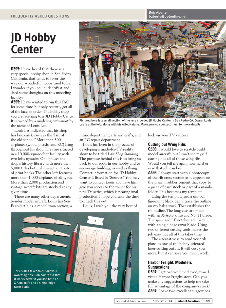 Louis has been in the process of developing a made-for-TV reality show to be titled “Last Shop Standing.” The purpose behind this is to bring us back to our roots in our hobby and to encourage building, as well as flying. Contact info for JD Hobby Center is listed in “Sources.” You may want to contact Louis and have him give you access to the trailer for his new TV series, which is nearing final production. I hope you take the time to look this over.