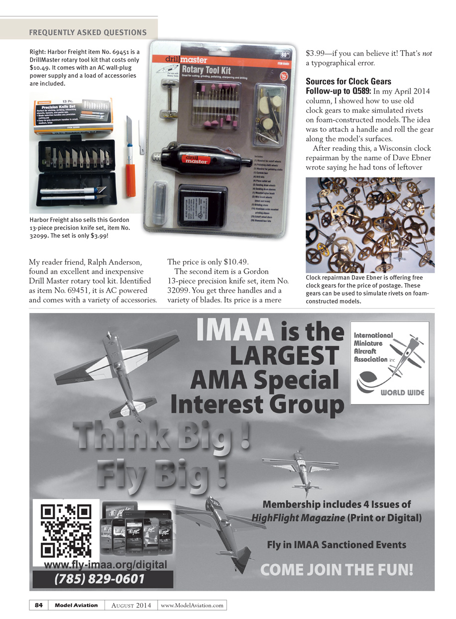Follow-up to Q589: In my April 2014 column, I showed how to use old clock gears to make simulated rivets on foam-constructed models. The idea was to attach a handle and roll the gear along the model’s surfaces.