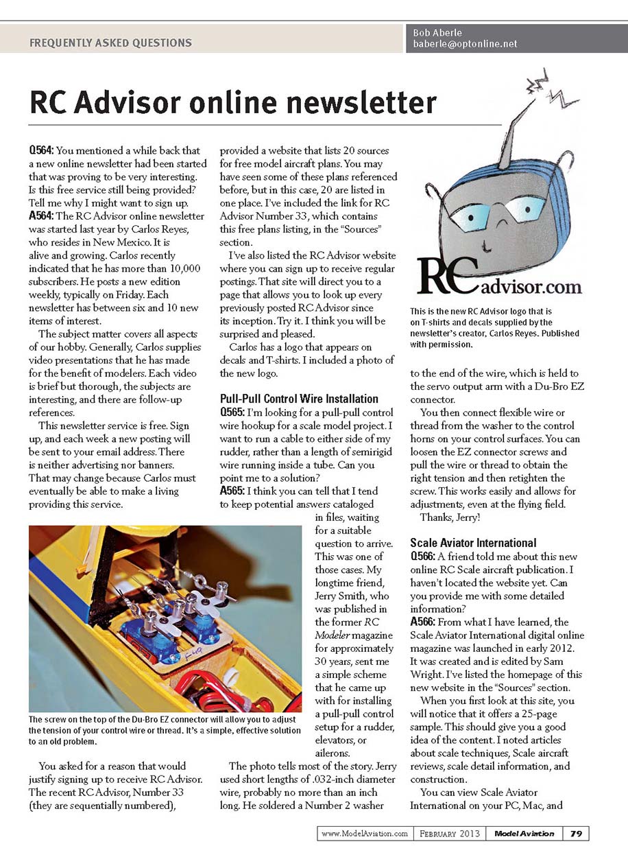 This is the new RC Advisor logo that is on T-shirts and decals supplied by the newsletter’s creator, Carlos Reyes. Published with permission.The screw on the top of the Du-Bro EZ connector will allow you to adjust the tension of your control wire or thread. It’s a simple, effective solution to an old problem.RC Advisor online newsletterQ564: You mentioned a while back that a new online newsletter had been started that was proving to be very interesting. Is this free service still being provided? Tell me why I might want to sign up.A564: The RC Advisor online newsletter was started last year by Carlos Reyes, who resides in New Mexico. It is alive and growing. Carlos recently indicated that he has more than 10,000 subscribers. He posts a new edition weekly, typically on Friday. Each newsletter has between six and 10 new items of interest. The subject matter covers all aspects of our hobby. Generally, Carlos supplies video presentations that he has made for the benefit of modelers. Each video is brief but thorough, the subjects are interesting, and there are follow-up references. This newsletter service is free. Sign up, and each week a new posting will be sent to your email address. There is neither advertising nor banners. That may change because Carlos must eventually be able to make a living providing this service. You asked for a reason that would justify signing up to receive RC Advisor. The recent RC Advisor, Number 33 (they are sequentially numbered), provided a website that lists 20 sources for free model aircraft plans. You may have seen some of these plans referenced before, but in this case, 20 are listed in one place. I’ve included the link for RC Advisor Number 33, which contains this free plans listing, in the “Sources” section. I’ve also listed the RC Advisor website where you can sign up to receive regular postings. That site will direct you to a page that allows you to look up every previously posted RC Advisor since its inception. Try it. I think you will be surprised and pleased. Carlos has a logo that appears on decals and T-shirts. I included a photo of the new logo. Pull-Pull Control Wire InstallationQ565: I’m looking for a pull-pull control wire hookup for a scale model project. I want to run a cable to either side of my rudder, rather than a length of semirigid wire running inside a tube. Can you point me to a solution?A565: I think you can tell that I tend to keep potential answers cataloged in files, waiting for a suitable question to arrive. This was one of those cases. My longtime friend, Jerry Smith, who was published in the former RC Modeler magazine for approximately 30 years, sent me a simple scheme that he came up with for installing a pull-pull control setup for a rudder, elevators, or ailerons. The photo tells most of the story. Jerry used short lengths of .032-inch diameter wire, probably no more than an inch long. He soldered a Number 2 washer to the end of the wire, which is held to the servo output arm with a Du-Bro EZ connector. You then connect flexible wire or thread from the washer to the control horns on your control surfaces. You can loosen the EZ connector screws and pull the wire or thread to obtain the right tension and then retighten the screw. This works easily and allows for adjustments, even at the flying field. Thanks, Jerry! Scale Aviator InternationalQ566: A friend told me about this new online RC Scale aircraft publication. I haven’t located the website yet. Can you provide me with some detailed information?A566: From what I have learned, the Scale Aviator International digital online magazine was launched in early 2012. It was created and is edited by Sam Wright. I’ve listed the homepage of this new website in the “Sources” section. When you first look at this site, you will notice that it offers a 25-page sample. This should give you a good idea of the content. I noted articles about scale techniques, Scale aircraft reviews, scale detail information, and construction. You can view Scale Aviator International on your PC, Mac, and