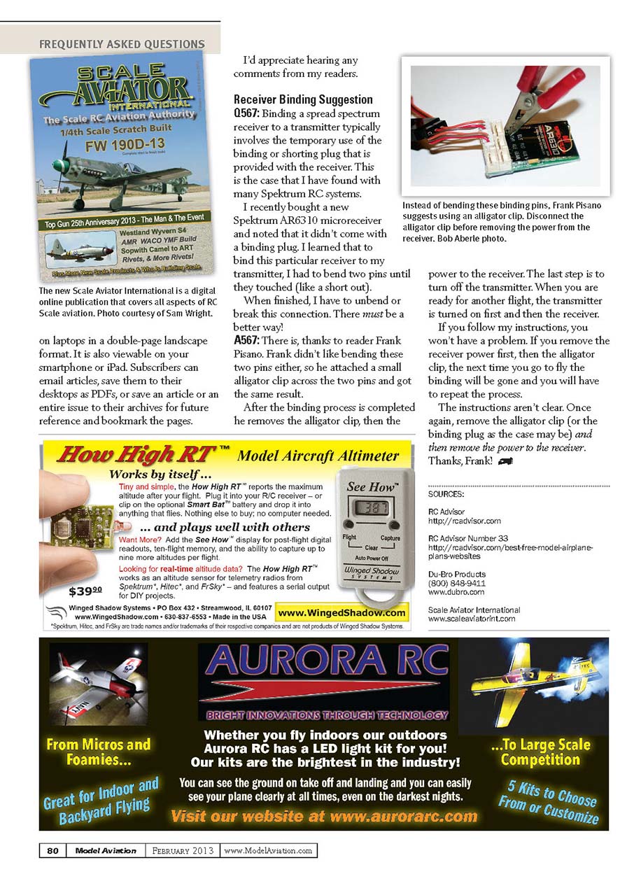 The new Scale Aviator International is a digital online publication that covers all aspects of RC Scale aviation. Photo courtesy of Sam Wright.Instead of bending these binding pins, Frank Pisano suggests using an alligator clip. Disconnect the alligator clip before removing the power from the receiver. Bob Aberle photo.on laptops in a double-page landscape format. It is also viewable on your smartphone or iPad. Subscribers can email articles, save them to their desktops as PDFs, or save an article or an entire issue to their archives for future reference and bookmark the pages. I’d appreciate hearing any comments from my readers.Receiver Binding SuggestionQ567: Binding a spread spectrum receiver to a transmitter typically involves the temporary use of the binding or shorting plug that is provided with the receiver. This is the case that I have found with many Spektrum RC systems. I recently bought a new Spektrum AR6310 microreceiver and noted that it didn’t come with a binding plug. I learned that to bind this particular receiver to my transmitter, I had to bend two pins until they touched (like a short out). When fi nished, I have to unbend or break this connection. There must be a better way!A567: There is, thanks to reader Frank Pisano. Frank didn’t like bending these two pins either, so he attached a small alligator clip across the two pins and got the same result. After the binding process is completed he removes the alligator clip, then the power to the receiver. The last step is to turn off the transmitter. When you are ready for another fl ight, the transmitter is turned on fi rst and then the receiver. If you follow my instructions, you won’t have a problem. If you remove the receiver power fi rst, then the alligator clip, the next time you go to fl y the binding will be gone and you will have to repeat the process. The instructions aren’t clear. Once again, remove the alligator clip (or the binding plug as the case may be) and then remove the power to the receiver. Thanks, Frank! SOURCES: RC Advisorhttp://rcadvisor.comRC Advisor Number 33http://rcadvisor.com/best-free-model-airplane-plans-websitesDu-Bro Products(800) 848-9411www.dubro.comScale Aviator Internationalwww.scaleaviatorint.com80Model Aviation