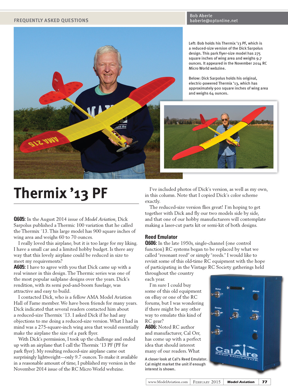 Q605: In the August 2014 issue of Model Aviation, Dick Sarpolus published a Thermic 100 variation that he called the Thermix ’13. This large model has 900 square inches of wing area and weighs 60-70 ounces. I really loved this airplane, but it is way too big for my liking. I have a small car and a limited hobby budget. Is there any way that this lovely airplane could be reduced in size to meet my requirements?