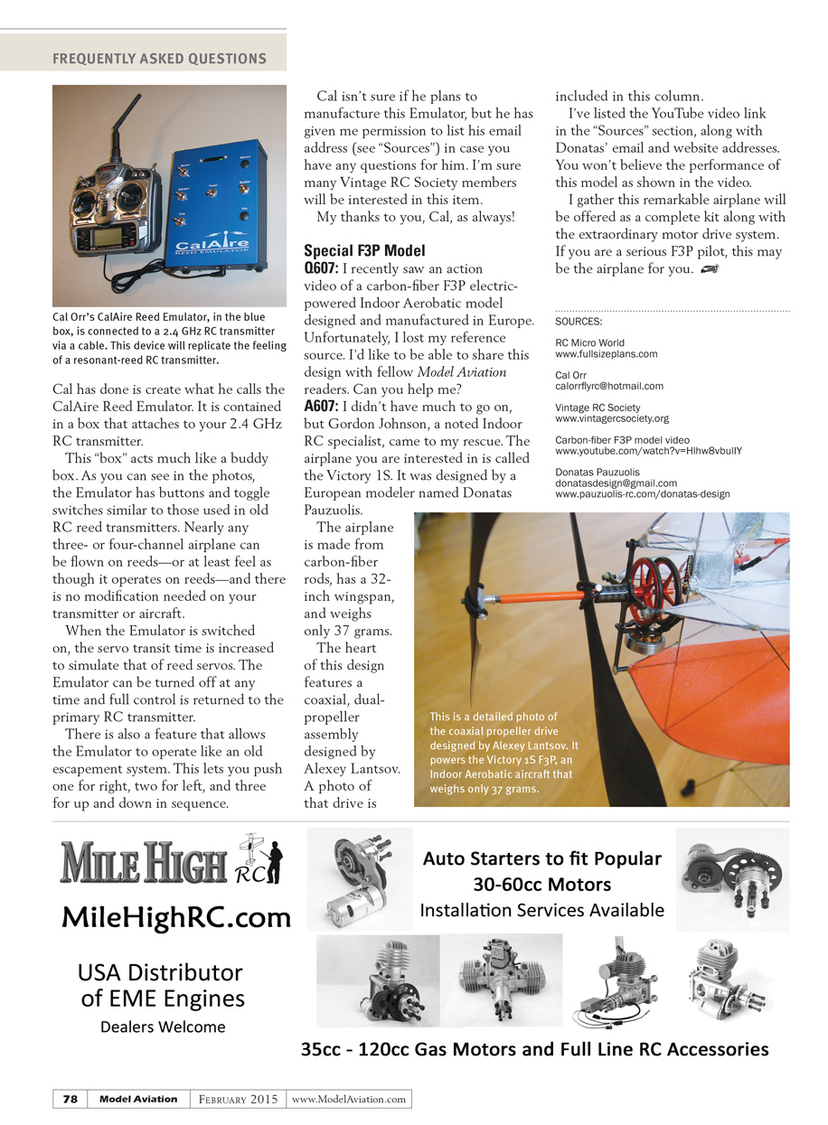 A606: Noted RC author and manufacturer, Cal Orr, has come up with a perfect idea that should interest many of our readers. What Cal has done is create what he calls the CalAire Reed Emulator. It is contained in a box that attaches to your 2.4 GHz RC transmitter.