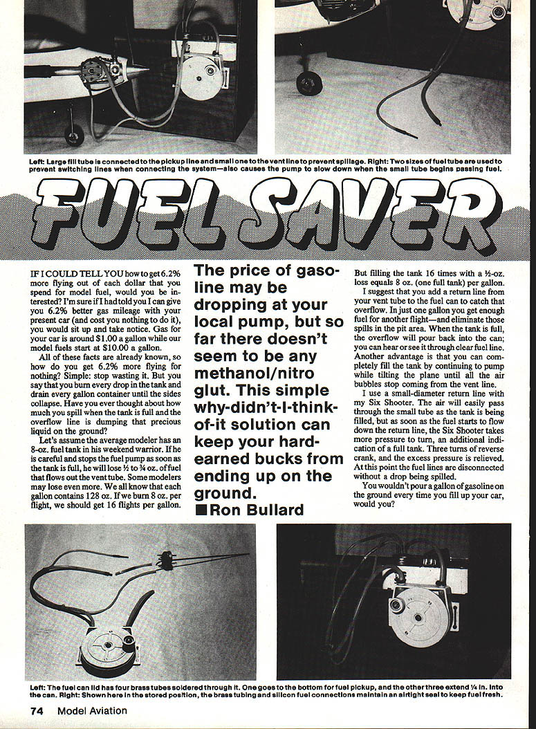 Left Larg fill tube connectedto pickup line small tothevent ilneto prevent spillage Right Two sizes fuel tube usedto prevent switching lines connecting systemalso causes pump slow down small tube begins Dassing fuel IF ICOULDTELLYOUhowtoget62% flying out dollar spend model fuel would terested Im sure ff1 told can give 62% better gas mileage present car cost nothing would sit up take notice Gas car around $100 gallon model fuels start $1000 gallon facts already known get 62% flying nothing Simple stop wasting say burn drop tank drain gallon container until sides collapse Have ever thought about much spill tank full overflow line dumping precious liquid pound Lets assume average modeler has 8-az fuel tank weekend warrior careful stops fuel pump scon tank full wrn lose Yi 3/4 oz fuel flows out vent tube Some modelers may lose know gallon contains 128 oz Ifwe burn 8 oz per flight should get 16 flights per gallon price gaso line may dropping local pump far doesnt seem methanol/nitro glut simple why-didnt-I-thinkof-it solution can keep hardearned bucks ending up ground ERon Bullard filling tank 16 times -oz loss equals 8 oz full tank per gallon suggest add return line vent tube fuel can catch overflow just gallon get enough fuel another flightand eliminate spills pit area tank full overflow will pour back can can hear see through clear fuel line Another advantage can com pletely fill tank continuing pump tilting plane until air bubbles stop coming vent line use small-diameter return line Six Shcoter air will easily pass through small tube tank being filled scon fuel starts flow down return line Six Shcoter takes pressure turn additional indi cation full tank Three turns reverse crank excess pressure relieved point fuel lines disconnected drop being spilled wouldnt pour gallon gasoline pound time fill up car would Left fuel can lid has four brass tubes soldered through goesto bottom forfuel pickup otherthree extend can Right Shown stored poaftion brasstubing silicon fuel connections maintain airtight seal keep fuel fresh 74 Model Aviation