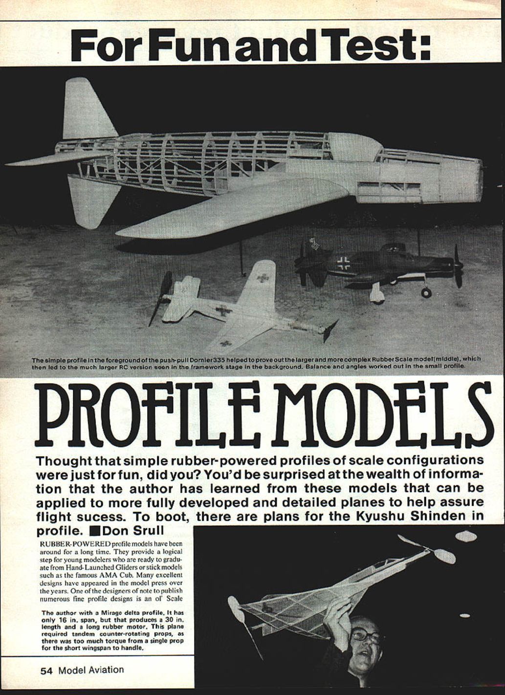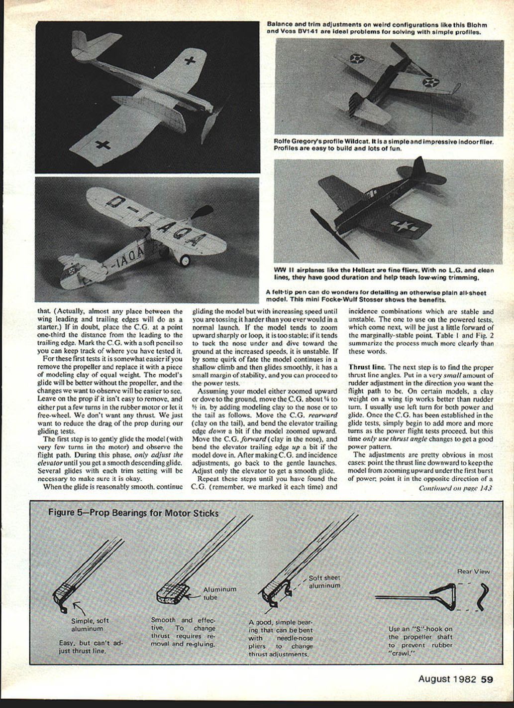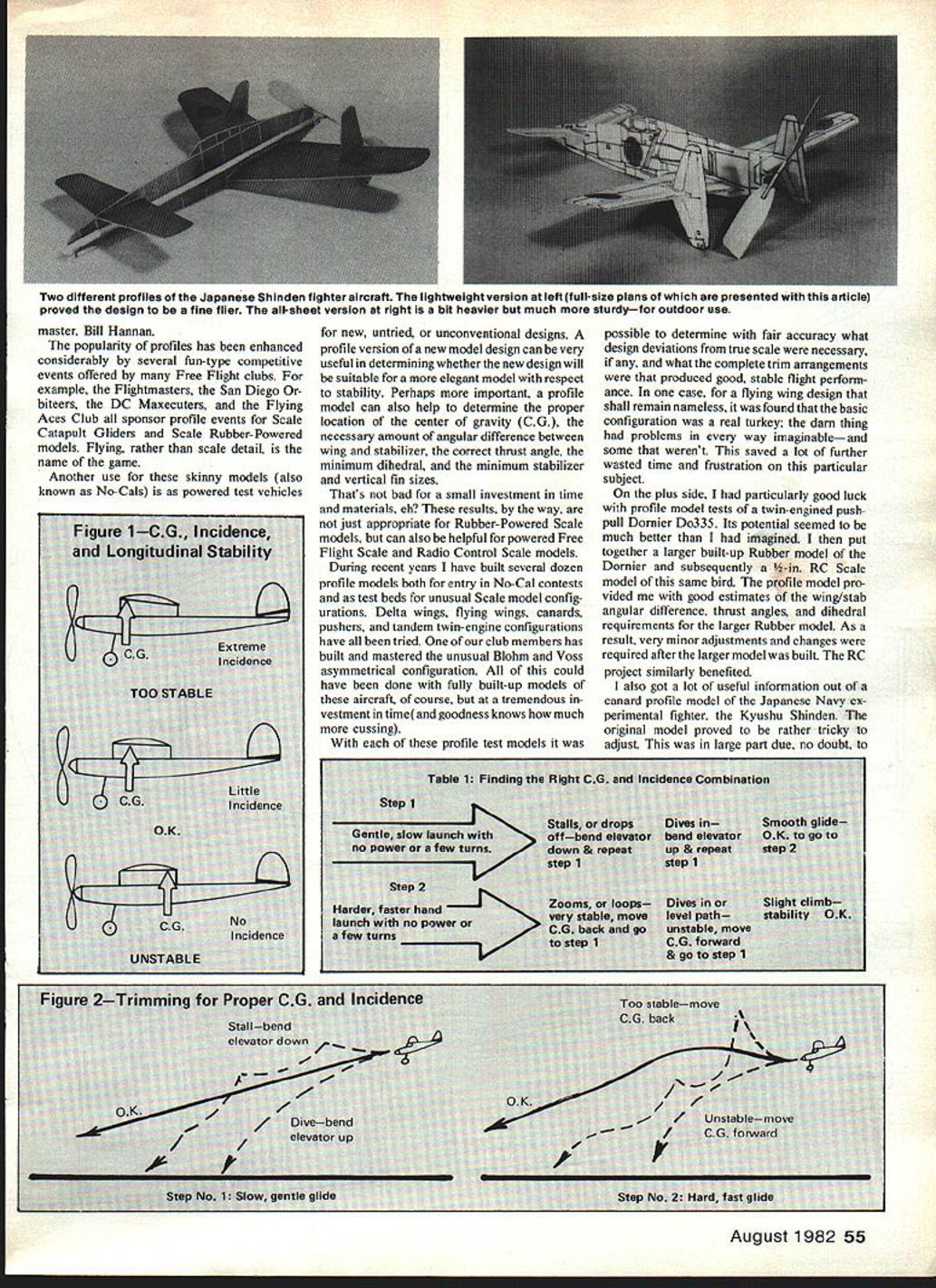 For Fun Test PROP IL IIODLS Thought simple rubber-powered profiles scale configurations justforfun did Youd surprised wealth informa tion author has learned models can applied fully developed detailed planes help assure flight sucess boot plans Kvushu Shinden profile EDon Srull RUBBER-POWERED profile models have around long time provide logical step young modelers ready gradu ate Hand-Launched Gliders stick models such famous AMA Cub excellent designs have appeared model press over years designers note publish numerous fine profile designs ol Scale author Mirage delta profile has 16 span produces 30 length long rubber motor plane required tandem counter-rotating props too much torque single prop short wingspan handle Two different profiles Japanese Shinden fighter aircraft lightweight version left full-size plans presented article proved design fine flier all-sheet version right bit heavier much sturdyfor outdoor use master Bill Hannan popularity profiles has enhanced considerably several fun-type competitive events offered Free Flight clubs example Flightmasters San Diego biteers DC Maxecuters Flying Aces Club sponsor profile events Scale Catapult Gliders Scale Rubber-Powered models Flying rather scale detail name game Another use skinny models also known No-Cals powered test vehicles new untried unconventional designs profile version new model design can very useful determining whether new design will suitable elegant model respect stability Perhaps important profile model can also help determine proper location center gravity CG necessary amount angular difference between wing stabilizer correct thrust angle minimum dihedral minimum stabilizer vertical fin sizes Thats bad small investment time materials eh results way just appropriate Rubber-Powered Scale models can also helpful powered Free Flight Scale Radio Control Scale models During recent years have built several dozen profile models both entry No-Cal contests test beds unusual Scale model config urations Delta wings flying wings canards pushers tandem twin-engine configurations have tried club members has built mastered unusual Blohm Voss asymmetrical configuration could have done fully built-up models aircraft course tremendous vestment time goodness knows much cussing profile test models inding1 possible determine fair accuracy what design deviations true scale necessary what complete trim arrangements produced good stable flight perform ance case flying wing design shall remain nameless found basic configuration real turkey darn thing problems way imaginableand some werent saved lot further wasted time frustration particular subject plus side particularly good luck profile model tests twin-engined pushpull Dornier Do335 Its potential seemed much better imagined put together larger built-up Rubber model Dornier subsequently -in RC Scale model same bird profile model pro vided good estimates wing/stab angular difference thrust angles dihedral requirements larger Rubber model As result very minor adjustments changes required after larger model built RC project similarly benefited also got lot useful information out canard profile model Japanese Navy ex perimental fighter Kyushu Shinden original model proved rather tricky adjust large part due no doubt August1982 55 V JN V /1 / / II II1 JAPANESE NAVY SHI NDEN 16 SPAN PROFILE 320t frail TRIM FOR RIGHT TURN POWER WITH 3/32 10 1/8 RUBBER LOOP16TO 20LONG 1/16 SHEET lBS R 1/2 DIHEDRAL / / 1/16x 1/8 IE 1/32 SHEET TABS COVER ALL SURFACES ONE SIDE WITH LIGHT TISSUE DO NOT WATER SHRINK OR DOPE 7/ 3/32 X 3/16 MOTOR STICK 1/18 SQ __ 56 Model Aviation II N 1/l5xVs TEI /V16 / / 1/8 DIHEDRAL I/ FORM BLADES ROUNDED 1/8 SQOVER COFFEE BALSA HUBCAN 4 FU50 AT IHlS LINE1/32 SHEET BLADES LEFT HAND PROP 2 1/2 DOWN 40 LEFT THRUST August1982 57 CG Built-Up Lighter Fragile Work Higher Performance / CA// 1fIr1rLight Tissue Coveringone both sides Light Simple All-Balsa Frameworkall surfaces Wooden Gear Balsa Wheels Balsa Prop Figure 4Holding Minor dowel rear peg Make slot Balsaleast 4- wide nose plug Laminated balsa nose block water-shrink dope lightweight modelsl Magic Markers thinly-sprayed model enamel OK color trim fact have built flown very few canards Eventually proper CG location found combined what seemed excessive amount angular difference between wing forward canard surface fairly large amount upthrust equivalent downthrust tractor configuration also found necessary adjustments Shinden demon strated exceptional flight performance sta bility lighter profile model built also larger built-up Rubber Scale model using same force arrangements original profile Lo behold built-in adjustments worked exactly profile very minor trimming required get both flying well Several other similar experiences have con vinced small profile models indeed provide accurate insight flight characteristics trim requirements larger built-up model Its simple fun way save time frustration take surprises out trimming large new beautiful Scale project might also steer away real dogs worth effort fight through flight trimming stages may have trimmed Free Flight Scale models before some procedures have found work pretty well certainly other ways go about trimming model tech niques may worth try start very easy profile model CG wing/stab angles idea determine combination C G wing tail angular difference provides just enough pitch up down stability dont want too much pitch stability will add unnecessary drag certainly cant get too little model wont fly general further forward CG greater stabilityand vice versa see Fig 1 want find point pitch stability disappears marginal move CG forward just little until adequate stability reappears First make absolutely sure flying surfaces straight free warps before testing Its surprising modelers experienced ones sometimes skip step After have determined surfaces true use modeling clay place CG point think should little rearward Keep rear hook prop bearing hole least 3116 V4 away motor stick rub
