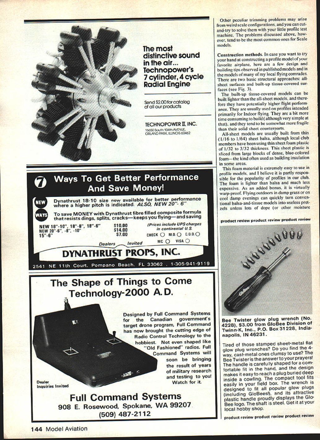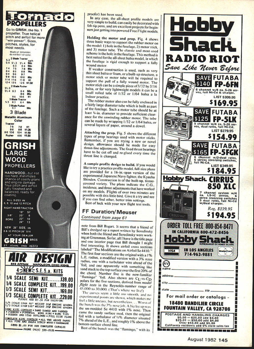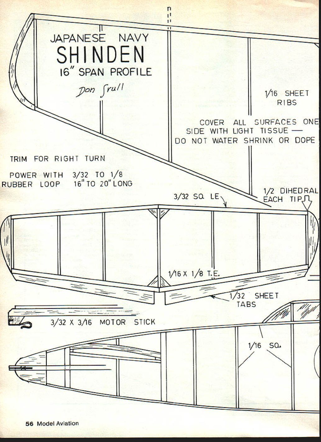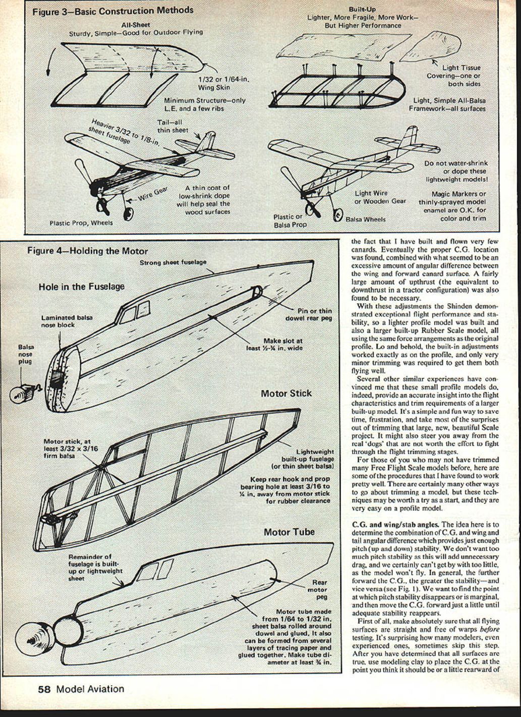 For Fun Test PROP IL IIODLS Thought simple rubber-powered profiles scale configurations justforfun did Youd surprised wealth informa tion author has learned models can applied fully developed detailed planes help assure flight sucess boot plans Kvushu Shinden profile EDon Srull RUBBER-POWERED profile models have around long time provide logical step young modelers ready gradu ate Hand-Launched Gliders stick models such famous AMA Cub excellent designs have appeared model press over years designers note publish numerous fine profile designs ol Scale author Mirage delta profile has 16 span produces 30 length long rubber motor plane required tandem counter-rotating props too much torque single prop short wingspan handle Two different profiles Japanese Shinden fighter aircraft lightweight version left full-size plans presented article proved design fine flier all-sheet version right bit heavier much sturdyfor outdoor use master Bill Hannan popularity profiles has enhanced considerably several fun-type competitive events offered Free Flight clubs example Flightmasters San Diego biteers DC Maxecuters Flying Aces Club sponsor profile events Scale Catapult Gliders Scale Rubber-Powered models Flying rather scale detail name game Another use skinny models also known No-Cals powered test vehicles new untried unconventional designs profile version new model design can very useful determining whether new design will suitable elegant model respect stability Perhaps important profile model can also help determine proper location center gravity CG necessary amount angular difference between wing stabilizer correct thrust angle minimum dihedral minimum stabilizer vertical fin sizes Thats bad small investment time materials eh results way just appropriate Rubber-Powered Scale models can also helpful powered Free Flight Scale Radio Control Scale models During recent years have built several dozen profile models both entry No-Cal contests test beds unusual Scale model config urations Delta wings flying wings canards pushers tandem twin-engine configurations have tried club members has built mastered unusual Blohm Voss asymmetrical configuration could have done fully built-up models aircraft course tremendous vestment time goodness knows much cussing profile test models inding1 possible determine fair accuracy what design deviations true scale necessary what complete trim arrangements produced good stable flight perform ance case flying wing design shall remain nameless found basic configuration real turkey darn thing problems way imaginableand some werent saved lot further wasted time frustration particular subject plus side particularly good luck profile model tests twin-engined pushpull Dornier Do335 Its potential seemed much better imagined put together larger built-up Rubber model Dornier subsequently -in RC Scale model same bird profile model pro vided good estimates wing/stab angular difference thrust angles dihedral requirements larger Rubber model As result very minor adjustments changes required after larger model built RC project similarly benefited also got lot useful information out canard profile model Japanese Navy ex perimental fighter Kyushu Shinden original model proved rather tricky adjust large part due no doubt August1982 55 V JN V /1 / / II II1 JAPANESE NAVY SHI NDEN 16 SPAN PROFILE 320t frail TRIM FOR RIGHT TURN POWER WITH 3/32 10 1/8 RUBBER LOOP16TO 20LONG 1/16 SHEET lBS R 1/2 DIHEDRAL / / 1/16x 1/8 IE 1/32 SHEET TABS COVER ALL SURFACES ONE SIDE WITH LIGHT TISSUE DO NOT WATER SHRINK OR DOPE 7/ 3/32 X 3/16 MOTOR STICK 1/18 SQ __ 56 Model Aviation II N 1/l5xVs TEI /V16 / / 1/8 DIHEDRAL I/ FORM BLADES ROUNDED 1/8 SQOVER COFFEE BALSA HUBCAN 4 FU50 AT IHlS LINE1/32 SHEET BLADES LEFT HAND PROP 2 1/2 DOWN 40 LEFT THRUST August1982 57 CG Built-Up Lighter Fragile Work Higher Performance / CA// 1fIr1rLight Tissue Coveringone both sides Light Simple All-Balsa Frameworkall surfaces Wooden Gear Balsa Wheels Balsa Prop Figure 4Holding Minor dowel rear peg Make slot Balsaleast 4- wide nose plug Laminated balsa nose block water-shrink dope lightweight modelsl Magic Markers thinly-sprayed model enamel OK color trim fact have built flown very few canards Eventually proper CG location found combined what seemed excessive amount angular difference between wing forward canard surface fairly large amount upthrust equivalent downthrust tractor configuration also found necessary adjustments Shinden demon strated exceptional flight performance sta bility lighter profile model built also larger built-up Rubber Scale model using same force arrangements original profile Lo behold built-in adjustments worked exactly profile very minor trimming required get both flying well Several other similar experiences have con vinced small profile models indeed provide accurate insight flight characteristics trim requirements larger built-up model Its simple fun way save time frustration take surprises out trimming large new beautiful Scale project might also steer away real dogs worth effort fight through flight trimming stages may have trimmed Free Flight Scale models before some procedures have found work pretty well certainly other ways go about trimming model tech niques may worth try start very easy profile model CG wing/stab angles idea determine combination C G wing tail angular difference provides just enough pitch up down stability dont want too much pitch stability will add unnecessary drag certainly cant get too little model wont fly general further forward CG greater stabilityand vice versa see Fig 1 want find point pitch stability disappears marginal move CG forward just little until adequate stability reappears First make absolutely sure flying surfaces straight free warps before testing Its surprising modelers experienced ones sometimes skip step After have determined surfaces true use modeling clay place CG point think should little rearward Keep rear hook prop bearing hole least 3116 V4 away motor stick rub