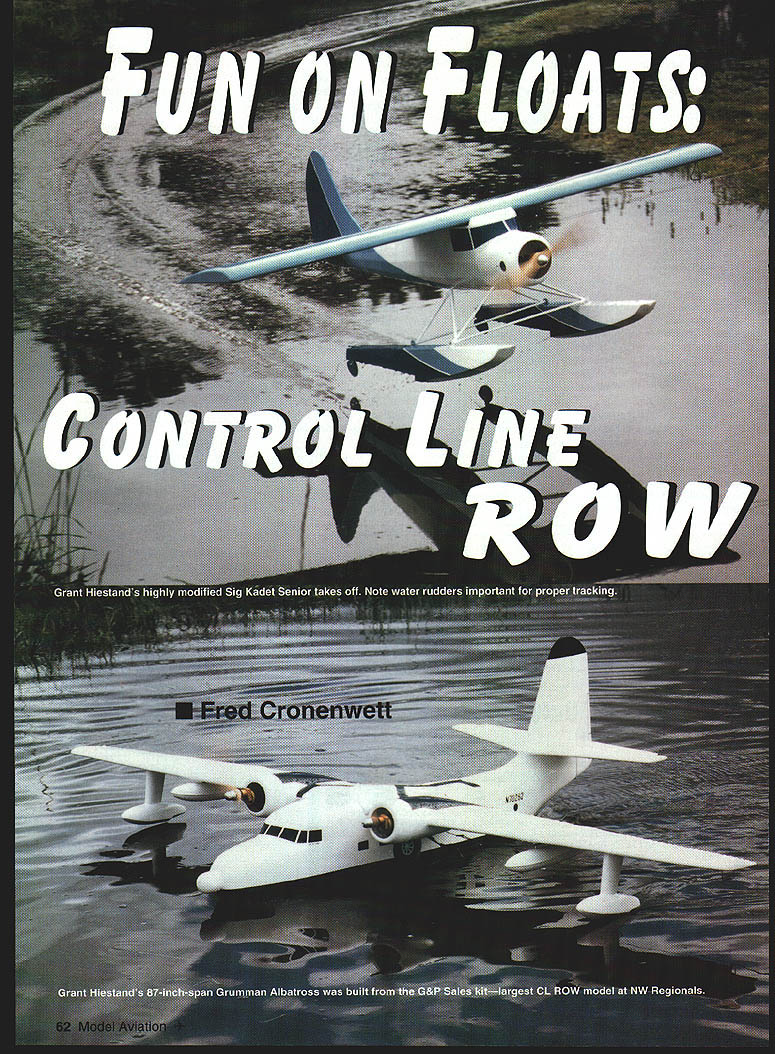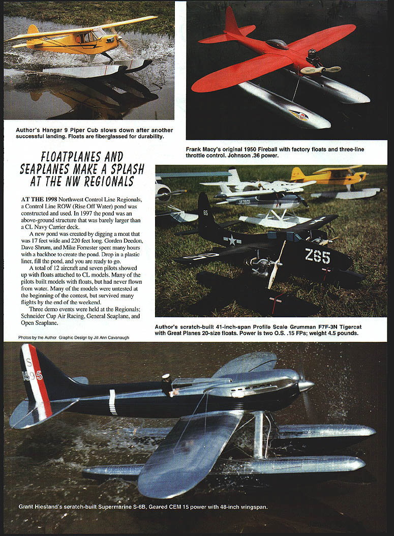 NO OCR TEXT Authors Hangar 9 Piper Cub slows down after another successful landing Floats fibergiassed durability FLOATPLANES AND SEA PLANES MAKE SPLASH AT THE NW REGIONALS AT THE 1998 Northwest Control Line Regionals a Control Line ROW Rise Off Water pond constructed used 1997 pond above-ground structure barely larger a CL Navy Carrier deck new pond created digging moat 17 feet wide 220 feet long Gorden Deedon Dave Shrum Mike Forrester spent hours backhoe create pond Drop plastic liner fill pond ready go total 12 aircraft seven pilots showed up floats attached CL models pilots built models floats never flown water models untested beginning contest survived flights end weekend Three demo events held Regionals Schneider Cup Air Racing General Seaplane Open Seaplane ' ic Design Jill Ann cavanaugh Frank Macys original 1950 Fireball factory floats three-line throttle control Johnson 36 power Authors scratch-built 41-inch-span Profile Scale Grumman F7F-3N Tigercat Great Planes 20-size floats Power two 05 15 FPs weight 45 pounds Schneider Cup Air Racing intended Scale event timed laps aircraft would scale models aircraft flown during Schneider Cup air races between 1913 1931 Pilots also choice flying Profile Sport Precision Scale models water instead land General Seaplane Open Seaplane intended other models floats semiscale nonscale others largest model 87-inch-span twin-engine Grumman Albatross smallest 36-inch-span diesel-powered Macchi MC-72 Schneider Cup Racer Five models Electric powered Frank Macy brought large collection A-J Fireballs see original 1950 Super Fireball factory floats pond half water half grass very rough floats floats have waterproof very durable Water landings can just hard ground done properly few rare cases may able cover wood floats MonoKote other covering gets punctured will have wood floats soaking up water rest weekend strongly recommend fiberglass floats durability waterproofing used 3/4-ounce fiberglass survived problems CL ROW float flying requires flying skills familiar Carrier Scale pilots Takeoff difficult part landing becoming spot-landing contest Takeoff difficult because model has make quick transition being boat being airplane successful takeoff Electric Piper Cub required model released motor idle power slowly ramped up full power being increased floats started come up step skim water elevator position also critical during first part takeoff run elevator must held neutral After airplane starts skim along water can apply some down elevator keep stuck water did find necessary Toward end run apply plenty up elevator get airborne water rudder proved very important few exceptions able get airborne adjustable water rudder nose points outboard starboard float will dig water model will track properly airplane has track straight ahead water rudder controls thisnot leadout guide other features Landing has done wings level Carrier pilots know what am talking about say have place land landing must planned two three laps advance typical approach Cub throttle back get low two feet above ground stay pond approached Since pond dug ground small rise start cleared touch down water After touchdown throttle back idle airplane will quickly slow down sink its normal floating level Touch-and-gos also possible pond touch down start pond keep speed up power off water again able easily touched down middle pond did give much room get airborne again Make sure floats large enough support model Great Planes rates its floats length heavy model will support Test-float model swimming pool lake check leaks Ernst makes nice water rudder can easily installed flew water rudder Grant Hiestand two Beaver Make sure can adjust water rudder get pond can make changes based taxi tests vast majority models flown 1998 two floats typical setup proved very stable However hull big Albatross supports entire weight model wingtip floats keep airplane level water rudder model mandatory make track straight during takeoff run water spray hull interfered propellers making takeoff difficult Electric-powered Piper Cub based Hangar 9 ARF kit Great Planes 60-size floats 41 inches long chose AstroRight Geared 40 motor power new Super Gearbox floats batteries other equipment airplane weighed 11 pounds power combination able swing 18 x 10 propeller because Super Gearbox proved very important have flying AstroFlight geared 41 Electric models quite 13 x 8 propeller normal gearbox January1999 65 Mike Forrester operating backhoe March 1998 digging pond used NW Regionals Photo Dave Shrum 0 1 0 -I 0 0 0 9 0 0 0 0 IJ 0 OC oC OC OC OC 0 I. 10o0 0000000 II ci 4 time-saving functions. incredible tool combining several drivers youll reduce clutter workbench field box reversible snap-on handle sets 4-in-i Installation Tool apart others providing Iwo comfortable gnp options convenient storage allowing use hard-to-reach places can use handle location dealer oearest please call 1 -800-682-8948 mention code number 0420G MODEUAA 0 Copy t 9983072248 oreatplaneo corn recent availability Super Gearbox made possible swing larger propeller normal gearbox able swing 13 x 8 Super Gearbox can swing everything froma 15- toan 18x 10 Thrustis what needed get larger models off water quickly Normally fly Cub 16 x 8 propeller land based flying use 18x l0forwaterflying Since pond 220 feet long very important set up model maximum performance during takeoff run local flying field perform some takeoff tests determine propeller provides best takeoff performance ran performance tests wheels ballast sinsulate floats able get airborne lap 16 x 8 As general rule thumb takeoff run water will 50% longer land got pond able get airborne water approximately lap 16 x 8 and/4lapwiththe 18x 10 Steve Davis Hangar 9 Piper Cub powered OS52 four-stroke swinging 11-inch propeller Steves model flew same Electric version needed longer run get off water Mike Conner flew Precision Aerobatics model floats great time chose Top Rite Elder floats no longer available antique-s
