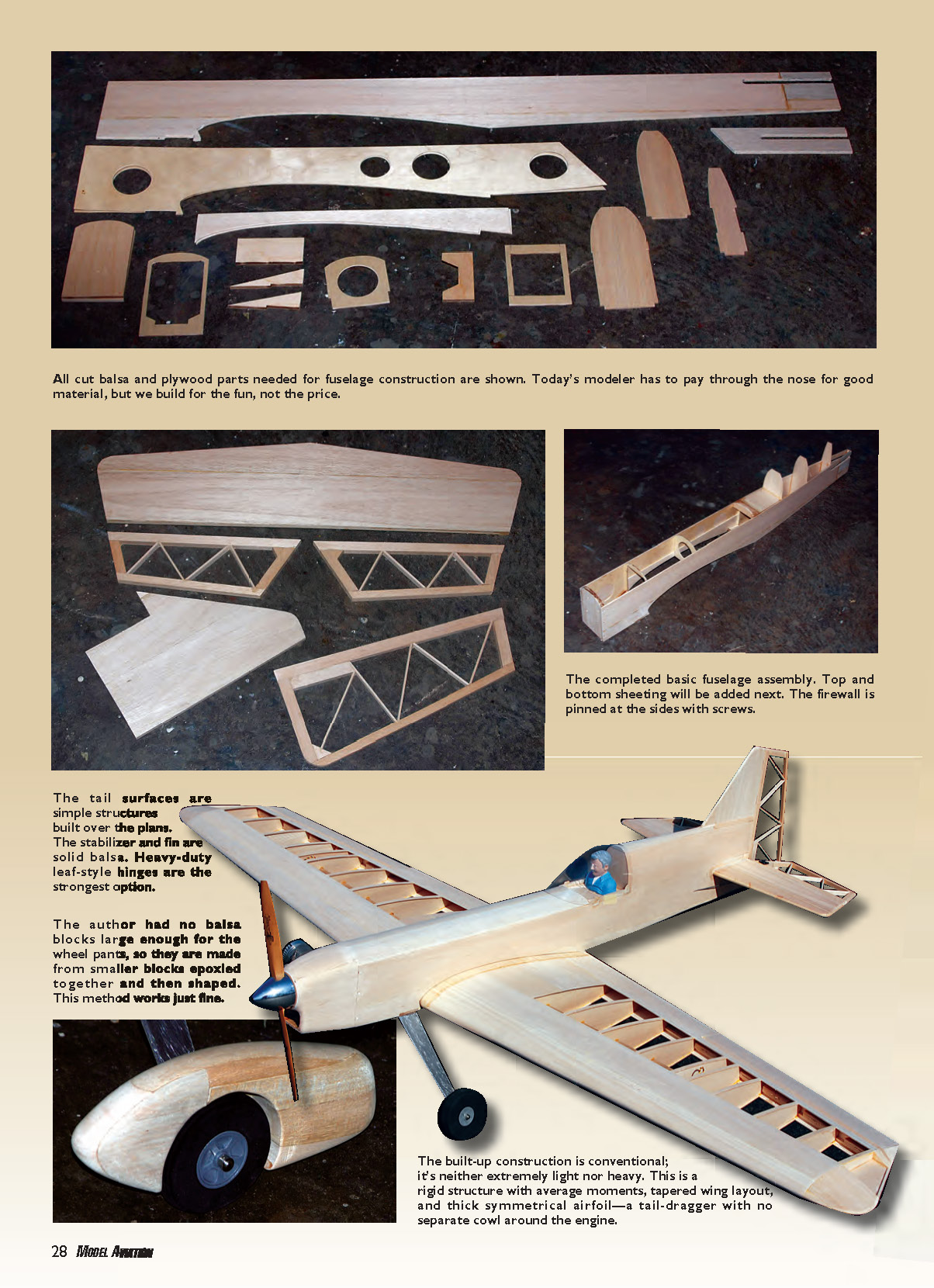 All cut balsa and plywood parts needed for fuselage construction are shown. Today’s modeler has to pay through the nose for good