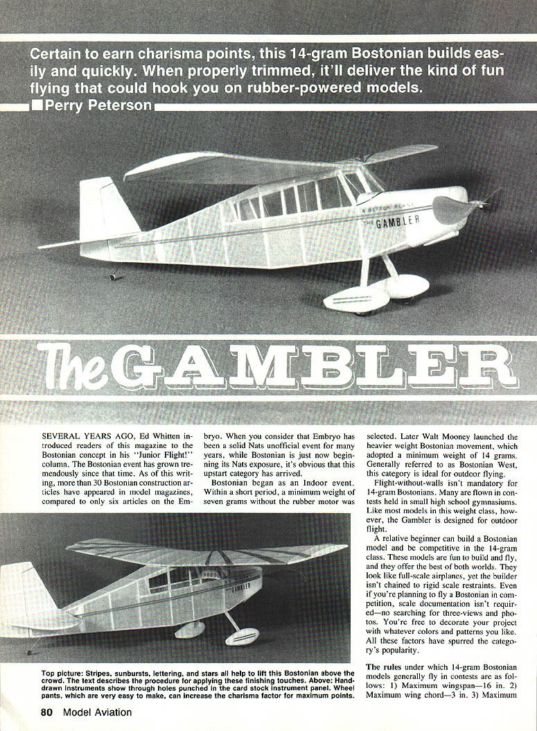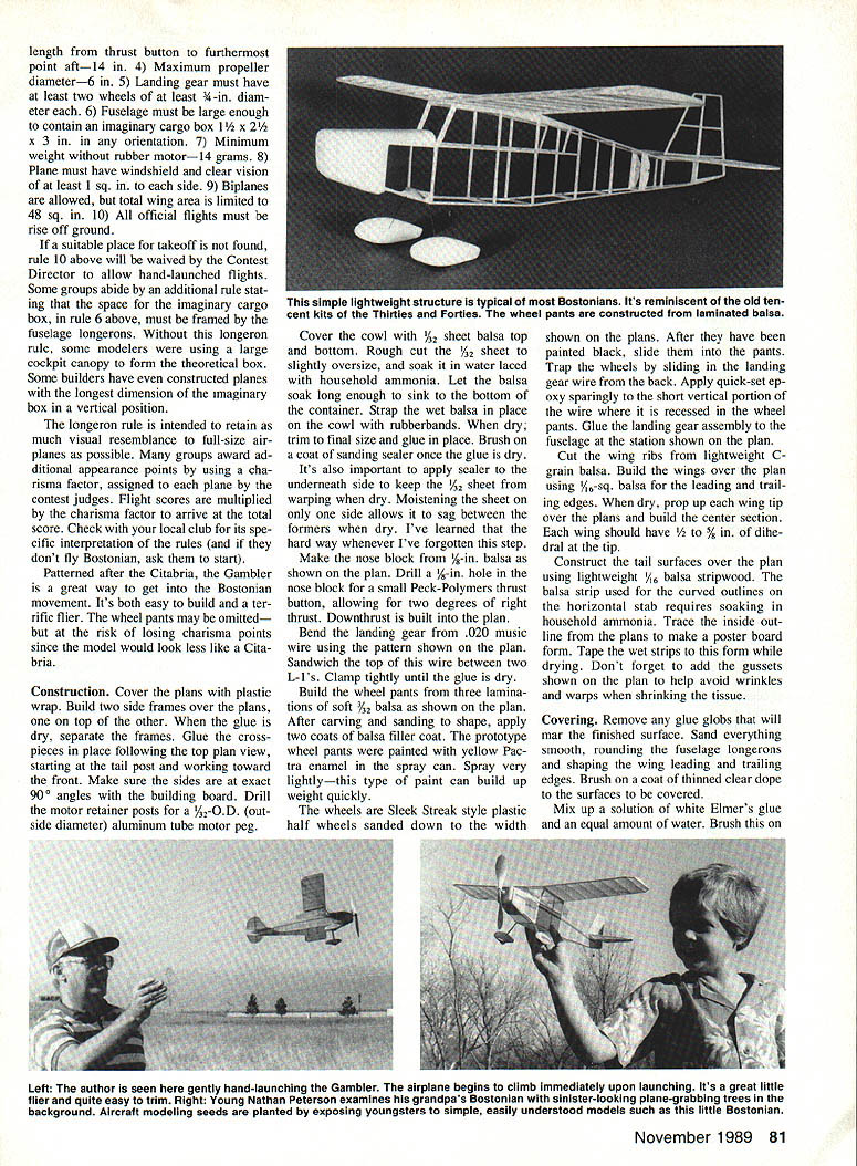 SEVERAL YEARS AGO Ed Whitten troduced readers magazine Bostonian concept Junior Flight column Bostonian event has grown tre mendously since time As writ ing 30 Bostonian construction ar ticles have appeared model magazines compared six articles Embryo consider Embryo has solid Nats unofficial event years Bostonian just now begin ning its Nats exposure its obvious upstart category has arrived Bostonian began Indoor event Within short period minimum weight seven grams rubber motor selected Later Walt Mooney launched heavier weight Bostonian movement adopted minimum weight 14 grams Generally referred Bostonian West category ideal outdoor flying Flight-without-walls isnt mandatory 14-gram Bostonians flown con tests held small high school gymnasiums Like models weight class ever Gambler designed outdoor flight relative beginner can build Bostonian model competitive 14-gram class models fun build fly offer best both worlds look like full-scale airplanes yet builder isnt chained rigid scale restraints youre planning fly Bostonian com petition scale documentation isnt requir edno searching three-views pho tos Youre free decorate project whatever colors patterns like factors have spurred catego rys popularity rules under 14-gram Bostonian models generally fly contests fol lows 1 Maximum wingspan16 2 Maximum wing chord3 3 Maximum 80 Model Aviation Top picture Stripes sunbursts lettering stars help lift Bostonian above crowd text describes procedure applying finishing touches Above Hand drawn instruments show through holes punched card stock instrument panel Wheel pants very easy make can increase charisma factor maximum points length thrust button furthermost point aft14 4 Maximum propeller diameter6 5 Landing gear must have least two wheels least 3A -in diam eter 6 Fuselage must large enough contain imaginary cargo box 11/2 x 21/2 x 3 in orientation 7 Minimum weight rubber motor14 grams 8 Plane must have windshield clear vision least 1 sq side 9 Biplanes allowed total wing area limited 48 sq 10 official flights must rise off ground suitable place takeoff found rule 10 above will waived Contest Director allow hand-launched flights Some groups abide additional rule stat ing space imaginary cargo box rule 6 above must framed fuselage longerons Without longeron rule some modelers using large cockpit canopy form theoretical box Some builders have constructed planes longest dimension imaginary box vertical position longeron rule intended retain much visual resemblance full-size air planes possible groups award ad ditional appearance points using cha risma factor assigned plane contest judges Flight scores multiplied charisma factor arrive total score Check local club its spe cific interpretation rules dont fly Bostonian ask start Patterned after Citabria Gambler great way get Bostonian movement Its both easy build ter rific flier wheel pants may omitted risk losing charisma points since model would look less like Cita bria Construction Cover plans plastic wrap Build two side frames over plans top other glue dry separate frames Glue crosspieces place following top plan view starting tail post working toward front Make sure sides exact 900 angles building board Drill motor retainer posts A2-OD out side diameter aluminum tube motor peg Cover cowl / sheet balsa top bottom Rough cut A2 sheet slightly oversize soak water laced household ammonia Let balsa soak long enough sink bottom container Strap wet balsa place cowl rubberbands dry trim final size glue place Brush coat sanding sealer once glue dry Its also important apply sealer underneath side keep A2 sheet warping dry Moistening sheet side allows sag between formers dry Ive learned hard way whenever Ive forgotten step Make nose block A-in balsa shown plan Drill A-in hole nose block small Peck-Polymers thrust button allowing two degrees right thrust Downthrust built plan Bend landing gear 020 music wire using pattern shown plan Sandwich top wire between two L-ls Clamp tightly until glue dry Build wheel pants three lamina tions soft %2 balsa shown plan After carving sanding shape apply two coats balsa filler coat prototype wheel pants painted yellow Pac tra enamel spray can Spray very lightlythis type paint can build up weight quickly wheels Sleek Streak style plastic half wheels sanded down width shown plans After have painted black slide pants Trap wheels sliding landing gear wire back Apply quick-set ep oxy sparingly short vertical portion wire recessed wheel pants Glue landing gear assembly fuselage station shown plan Cut wing ribs lightweight Cgrain balsa Build wings over plan using A6-sq balsa leading trail ing edges dry prop up wing tip over plans build center section wing should have he dral tip Construct tail surfaces over plan using lightweight /16 balsa stripwood balsa strip used curved outlines horizontal stab requires soaking household ammonia Trace inside out line plans make poster board form Tape wet strips form drying Dont forget add gussets shown plan help avoid wrinkles warps shrinking tissue Covering Remove glue globs will mar finished surface Sand everything smooth rounding fuselage longerons shaping wing leading trailing edges Brush coat thinned clear dope surfaces covered Mix up solution white Elmers glue equal amount water Brush November 1989 81 simple lightweight structure typical Bostonians Its reminiscent old tencent kits Thirties Forties wheel pants constructed laminated balsa Left author seen gently hand-launching Gambler airplane begins climb immediately upon launching Its great little flier quite easy trim Right Young Nathan Peterson examines grandpas Bostonian sinister-looking plane-grabbing trees background Aircraft modeling seeds planted exposing youngsters simple easily understood models such little Bostonian Full-Size Plans Available Page 194 L/16 SD BALSA WING PLAN BALSA GUSSETS 1/16 SQ BALSA LEADING EDGE D_KELEF IFEFFLI_ i_II ILl 1/16 50 BALSA WING SPAR-TOP ONLY BOTTOM CROSS MEMBER LOCATION / SMALL PECK THRUST BUTTON \