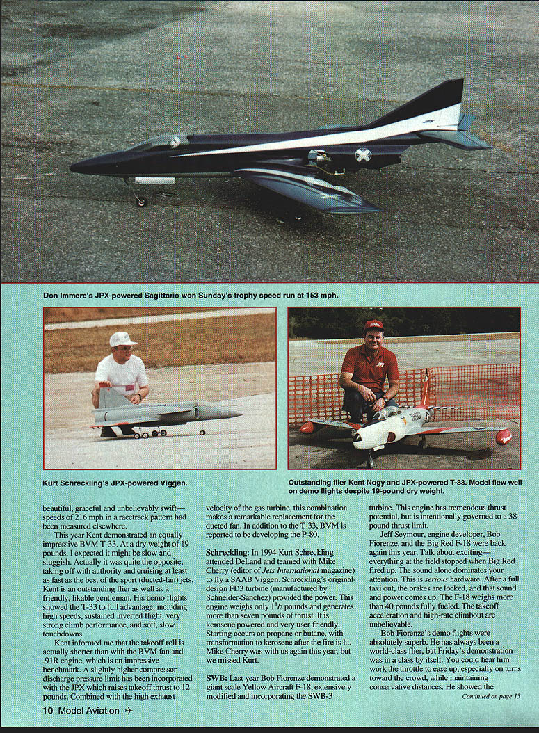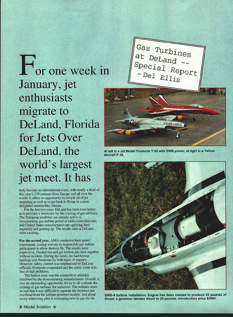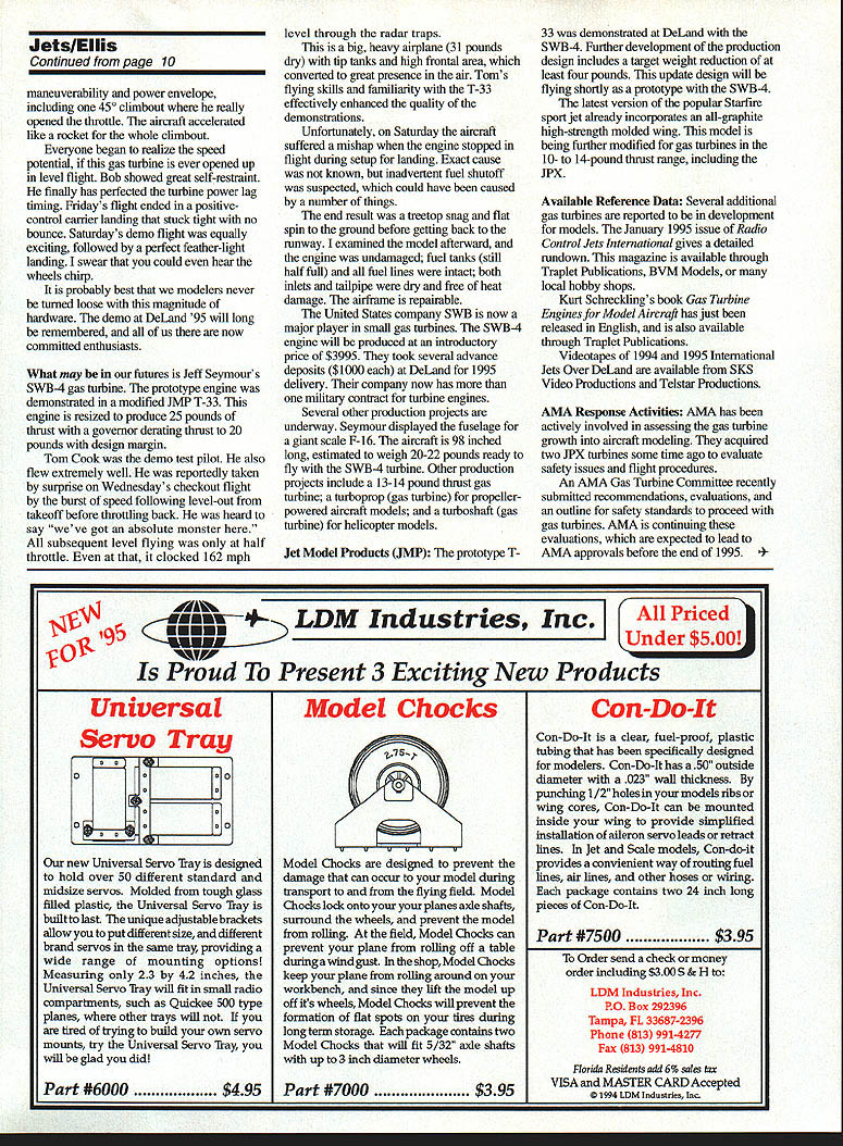 NO OCR TEXT Janu II Dea Speciai DeiL Report Ellis enthi mgrL DeL Je DeL won jet truly become years 179 entr world offers c modeling well delightful sunim last two ye provides showrs European mod1 incorporating gas ti United States manu ingenuity gearing up we*e exciting second year expeilment issuing sa Jet craft F-la wer r proaw Introductory price $3995 NO OCR TEXT neros JPX-pospeed run wigs JPX-pc efu1 unbie gas tinbine mph racriaficable reph red elsewhereT addition r Kent demons deveIopin I3VM T-33 Atithe vecteditmij In 1994 Ku Ilyitwas andandtealn meT authority of Jets Inter soun Viggen Sh rhine man uchez prova en pounds eradand Conunued page 15 JetsIEIIis Continued page 10 maneuverability power envelope including 450 climbout really opened throttle aircraft accelerated like rocket whole climbout Everyone began realize speed potential gas turbine ever opened up level flight Bob showed great self-restraint finally has perfected turbine power lag timing Fridays flight ended positivecontrol carrier landing stuck tight no bounce Saturdays demo flight equally exciting followed perfect feather-light landing swear could hear wheels chirp probably best modelers never turned loose magnitude hardware demo DeLand 95 will long remembered us now committed enthusiasts What may futures Jeff Seymours SWB-4 gas turbine prototype engine demonstrated modified IMP T-33 engine resized produce 25 pounds thrust governor derating thrust 20 pounds design margin Tom Cook demo test pilot also flew extremely well reportedly taken surprise Wednesdays checkout flight burst speed following level-out takeoff before throttling back heard say weve got absolute monster subsequent level flying half throttle clocked 162 mph level through radar traps big heavy airplane 31 pounds dry tip tanks high frontal area converted great presence air Toms flying sIdils familiarity T-33 effectively enhanced quality demonstrations Unfortunately Saturday aircraft suffered mishap engine stopped flight during setup landing Exact cause known inadvertent fuel shutoff suspected could have caused number things end result treetop snag flat spin ground before getting back runway examined model afterward engine undamaged fuel tanks still half full fuel lines intact both inlets tailpipe dry free heat damage airframe repairable United States company SWB now major player small gas turbines SWB-4 engine will produced introductory price $3995 took several advance deposits $1000 DeLand 1995 delivery company now has military contract turbine engines Several other production projects underway Seymour displayed fuselage giant scale F-16 aircraft 98 inched long estimated weigh 20-22 pounds ready fly SWB-4 turbine Other production projects include 13-14 pound thrust gas turbine turboprop gas turbine propellerpowered aircraft models turboshaft gas turbine helicopter models Jet Model Products JMP prototype T 33 demonstrated DeLand SWB-4 Further development production design includes target weight reduction least four pounds update design will flying shortly prototype SWB-4 latest version popular Starfire sport jet already incorporates all-graphite high-strength molded wing model being further modified gas turbines 10-to 14-pound thrust range including JPx Available Reference Data Several additional gas turbines reported development models January 1995 issue Radio Control Jets International gives detailed rundown magazine available through Traplet Publications BVM Models local hobby shops Kurt Schrecklings book Gas Turbine Engines Model Airt raft has just released English also available through Traplet Publications Videotapes 1994 1995 International Jets Over DeLand available SKS Video Productions Telstar Productions AMA Response Activities AMA has actively involved assessing gas turbine growth aircraft modeling acquired two IPX turbines some time ago evaluate safety issues flight procedures An AMA Gas Turbine Committee recently submitted recommendations evaluations outline safety standards proceed gas turbines AMA continuing evaluations expected lead AMA approvals before end 1995 ed uaau---4-- LDM Industries Inc $500 Proud Present 3 Exciting New Products Universal Servo Tray o a 0 0 o a new Universal Servo Thay designed hold over 50 different standard inidsize servos Molded tough glass filled plastic Universal Servo Thay built last unique adjustable brackets allow put different size different brand servos same tray providing wide range mounting options Measuring 23 42 inches Universal Servo Thay will fit small radio compartments such Quickee 500 type planes other trays will bred trying build own servo mounts try Universal Servo Thay will glad did Model Chocks 0 Model Chocks designed prevent damage can occur model during transport flying field Model Chocks lock onto your planes axle shafts surround wheels prevent model rolling field Model Chocks can prevent plane rolling off table duringawind gust shop Model Chocks keep plane rolling around workbench since lift model up off its wheels Model Chocks will prevent formation flat spots tires during long term storage package contains two Model Chocks will fit 5/32 axle shafts up 3 inch diameter wheels Part #6000$495 Part #7000$395 Con-Do-It Con-Do-It clear fuel-proof plastic tubing has specifically designed modelers Con-Do-It has 50 outside diameter 023 wall thickness punching 1/2 holes models ribs wing cores Con-Do-It can mounted inside wing provide simplified installation aileron servo leads retract lines Jet Scale models Con-do-it provides convienient way routing fuel lines air lines other hoses wiring package contains two 24 inch long pieces Con-Do-It Part #7500$395 Order send check money order including $300 S & H LDM Industries Inc PO Box 292396 Tampa FL 33687-2396 Phone 813 991-4277 Fax 813 9914810 Florida Residents add 6% sales tax VISA MASTER CARD Accepted @1994 LOM Industries Inc